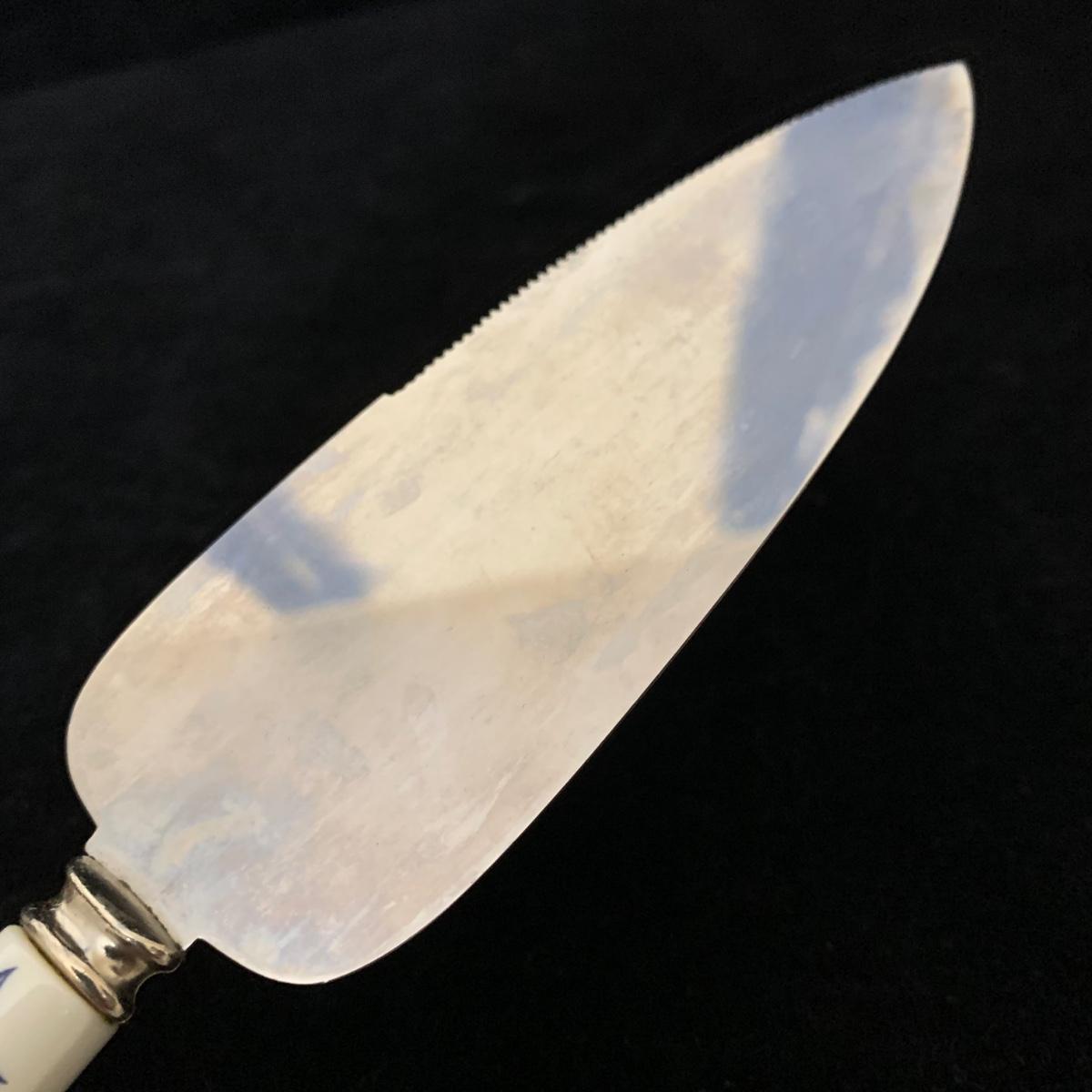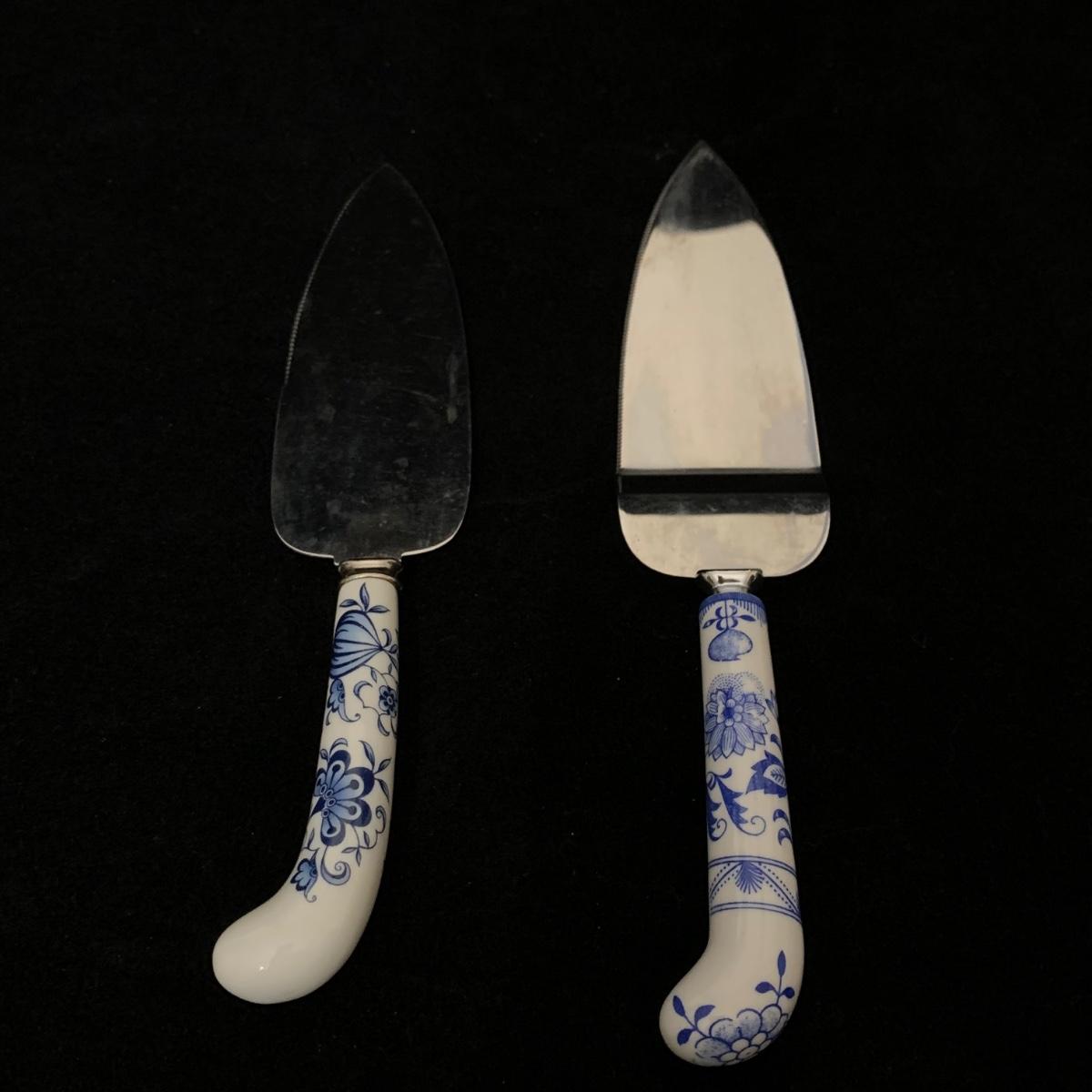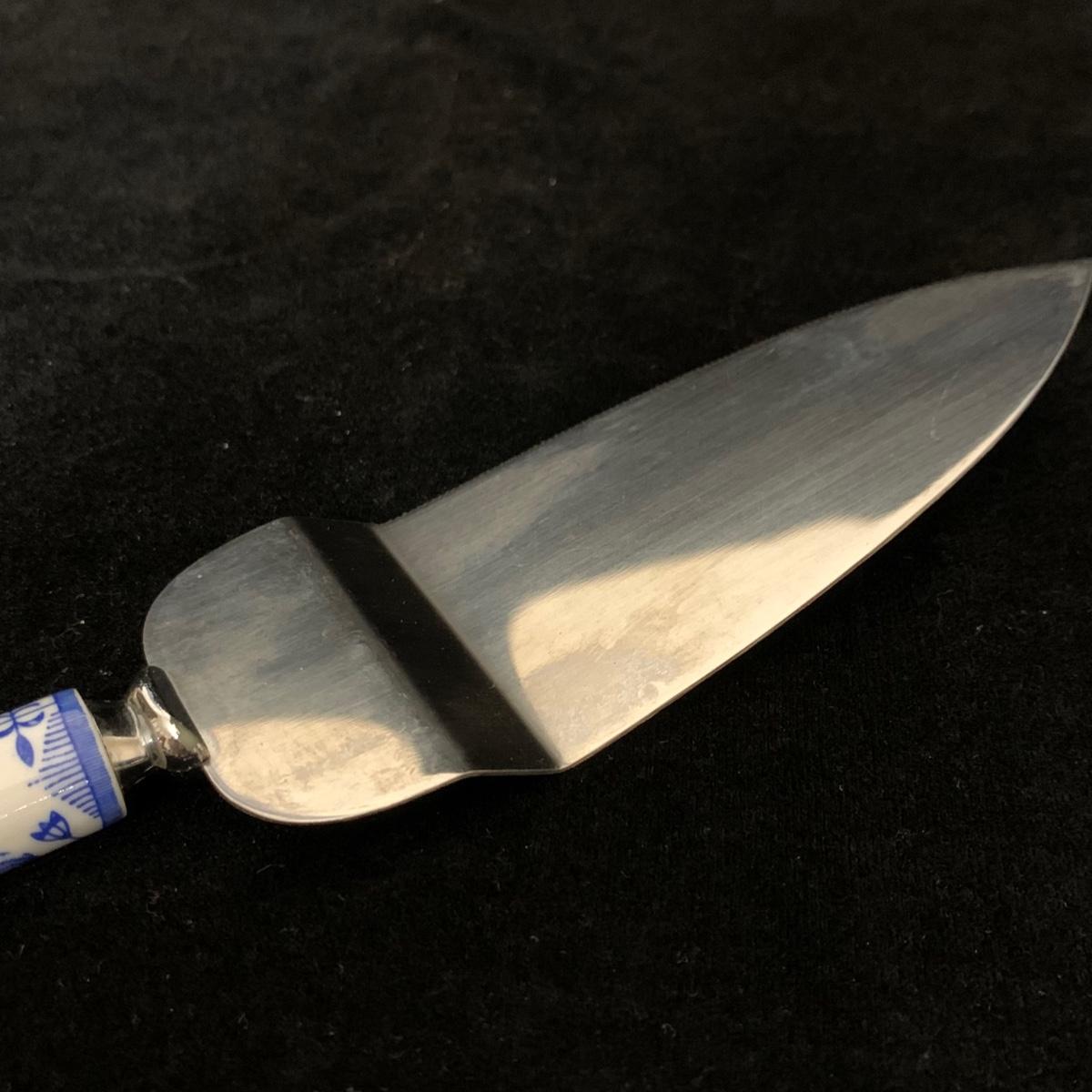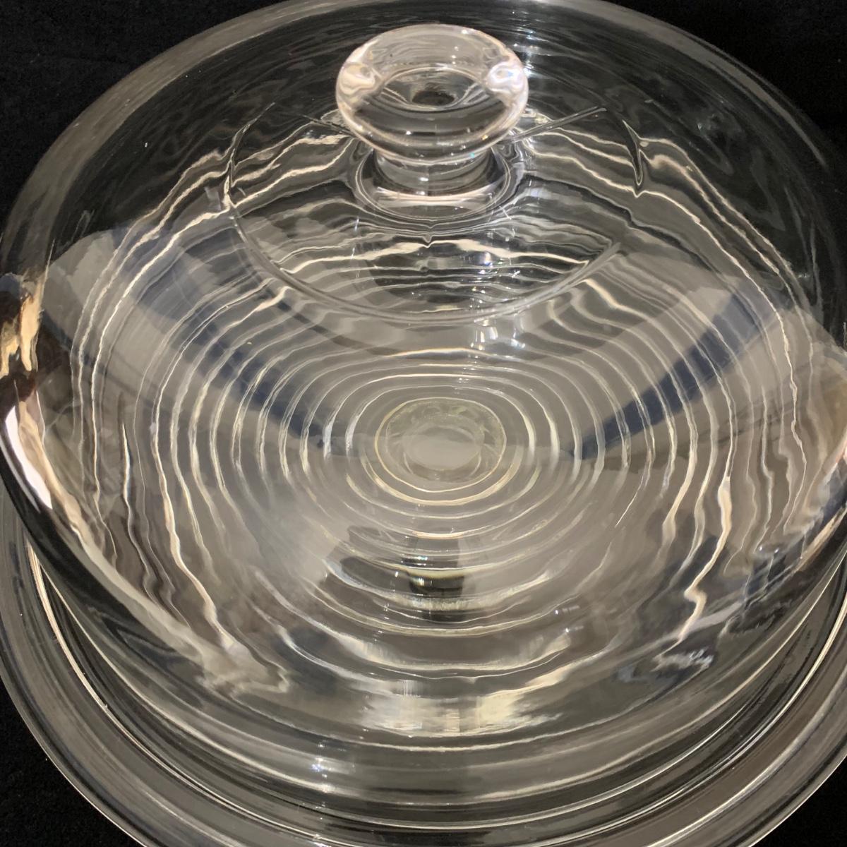 Glass pedestal cake stand with dome lid. Widest part of stand/platter measures 13”d. With lid on it is about 10” tall. Stand is in good condition and just needs to be cleaned. There is a slight yellow hue where the base attaches to the platter. Two cake servers are included that are stainless steel with blue and white floral glass handles. One is Sheffield brand and the other was made in Japan. Five unmarked blue and white floral mugs are included as well. One has a small chip.