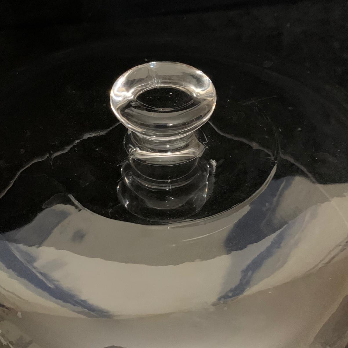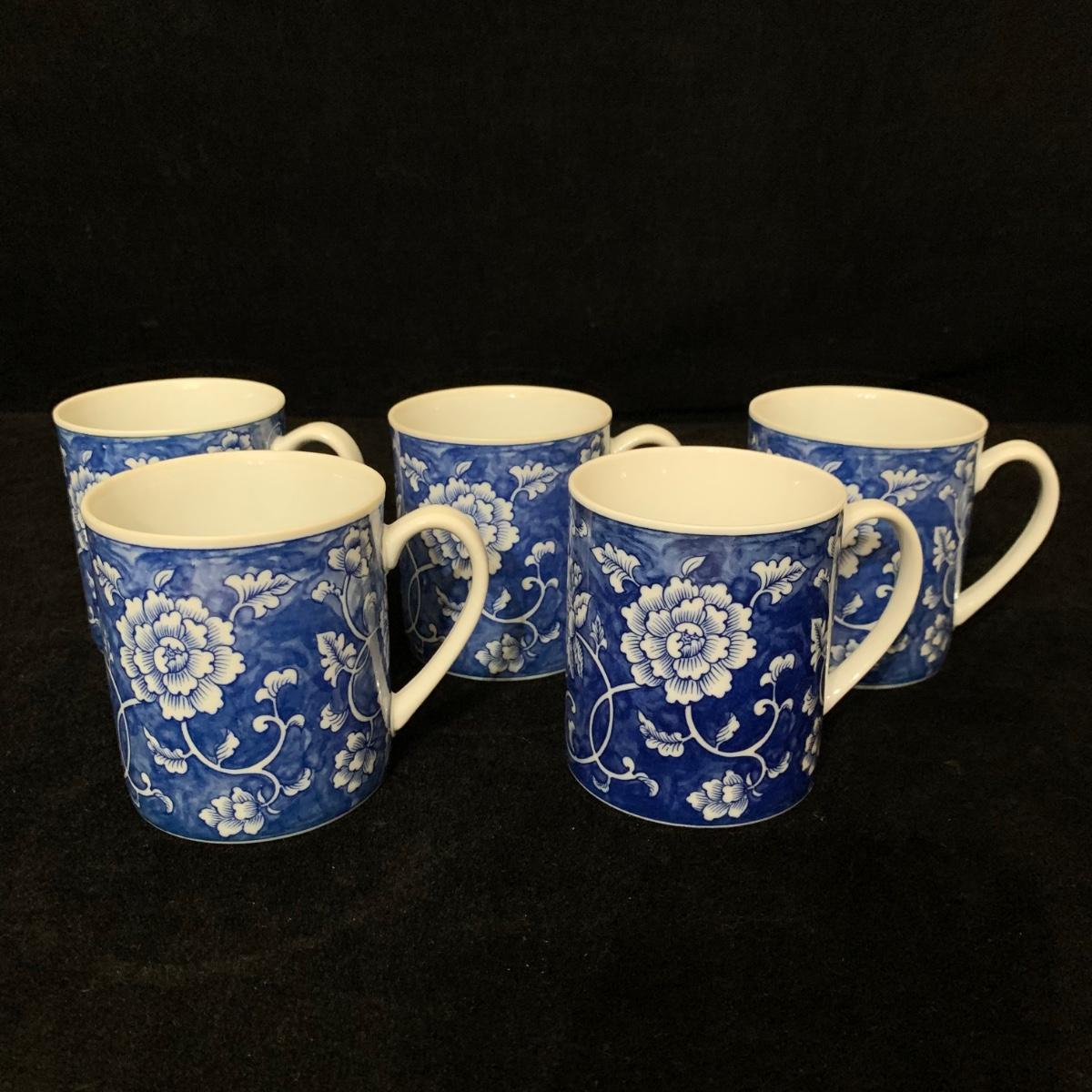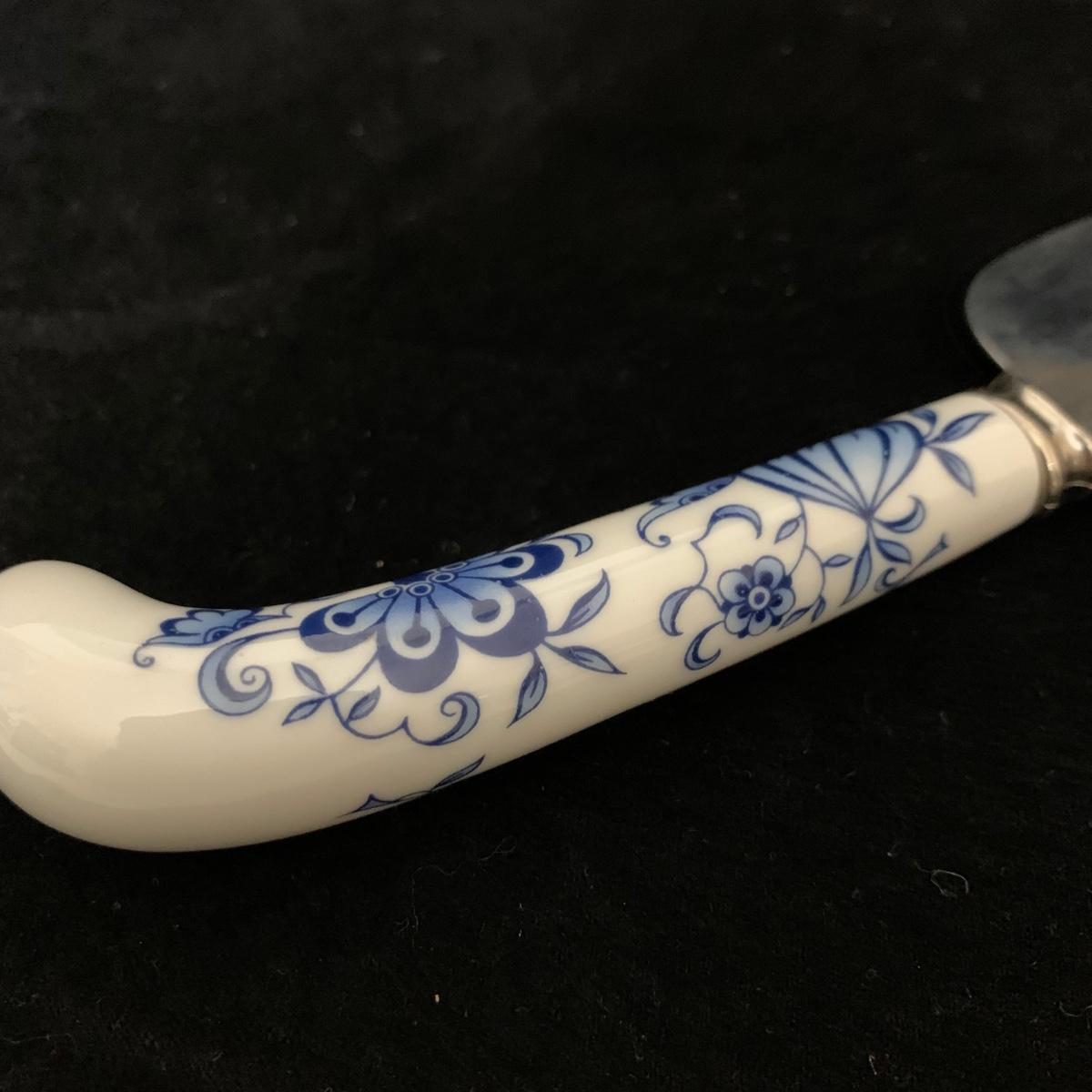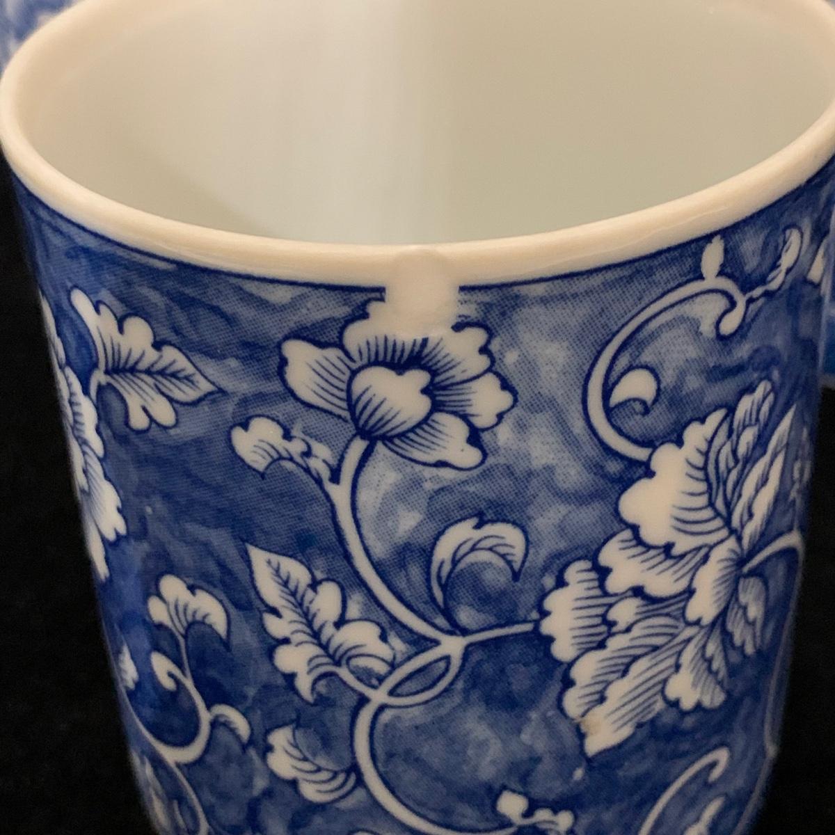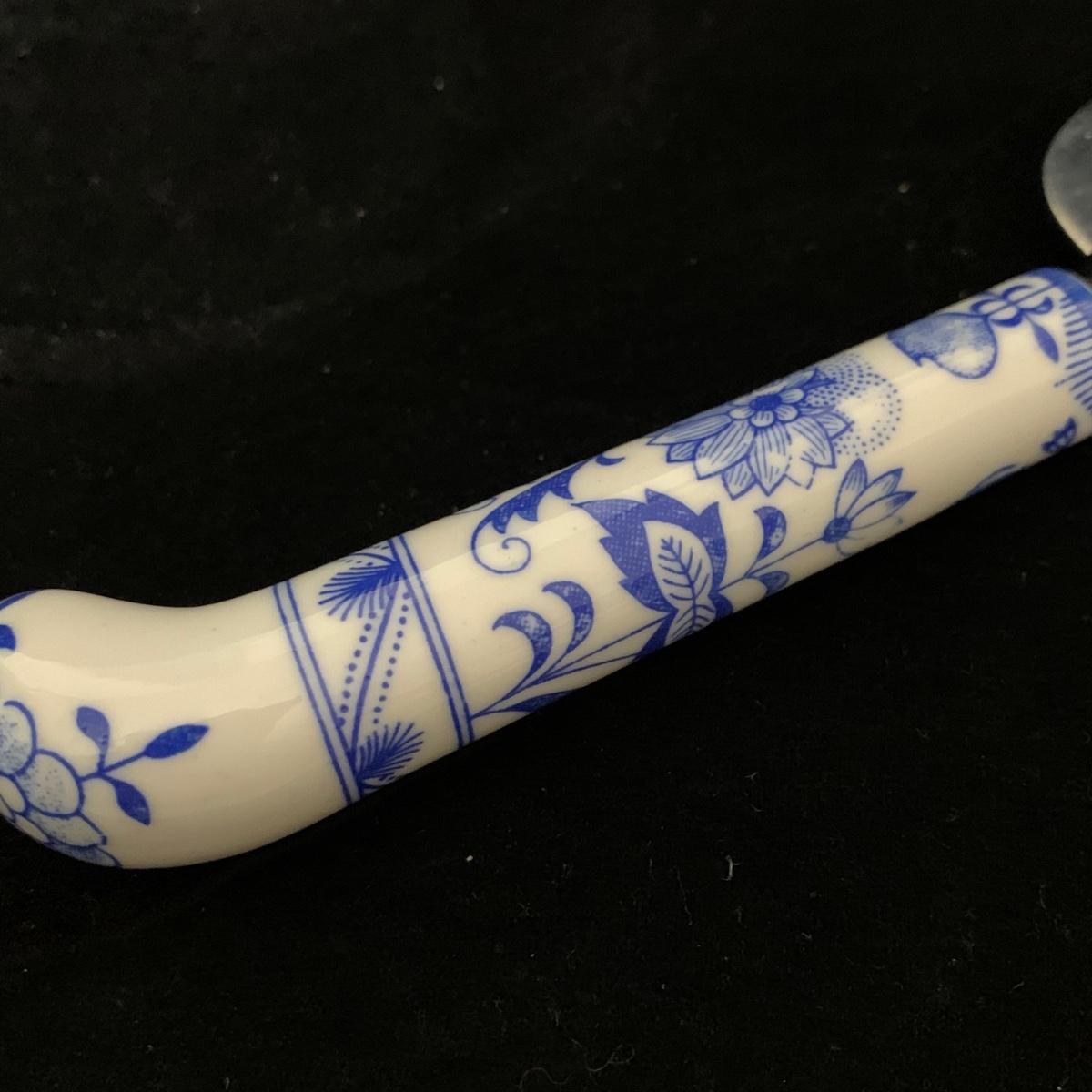 Glass pedestal cake stand with dome lid. Widest part of stand/platter measures 13”d. With lid on it is about 10” tall. Stand is in good condition and just needs to be cleaned. There is a slight yellow hue where the base attaches to the platter. Two cake servers are included that are stainless steel with blue and white floral glass handles. One is Sheffield brand and the other was made in Japan. Five unmarked blue and white floral mugs are included as well. One has a small chip.