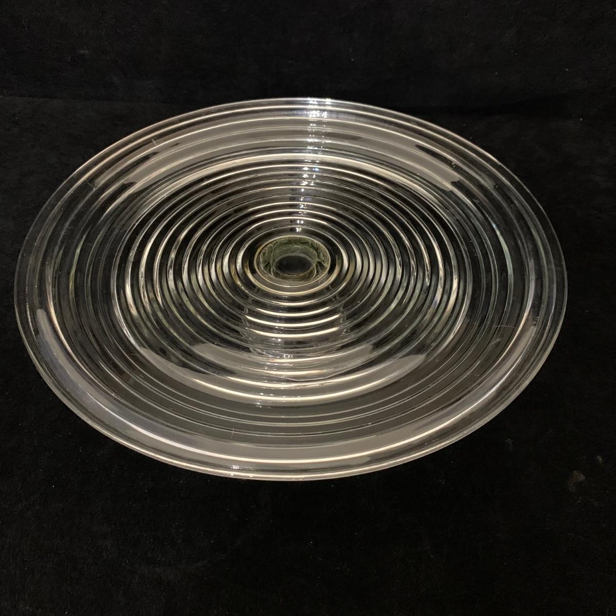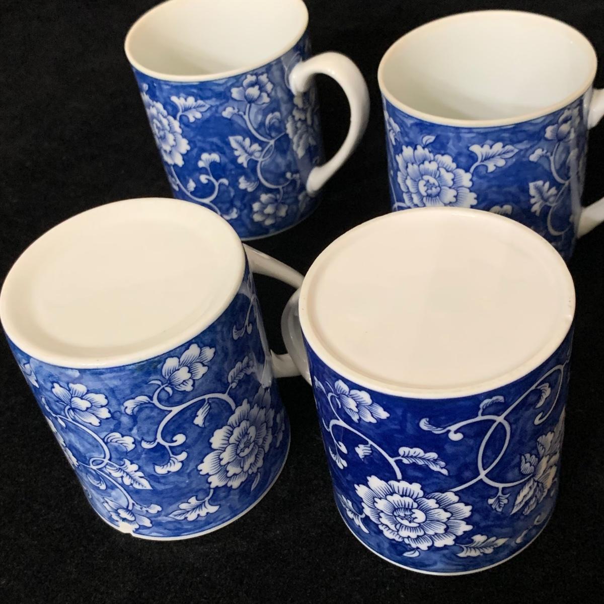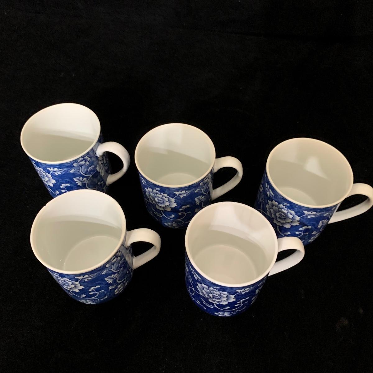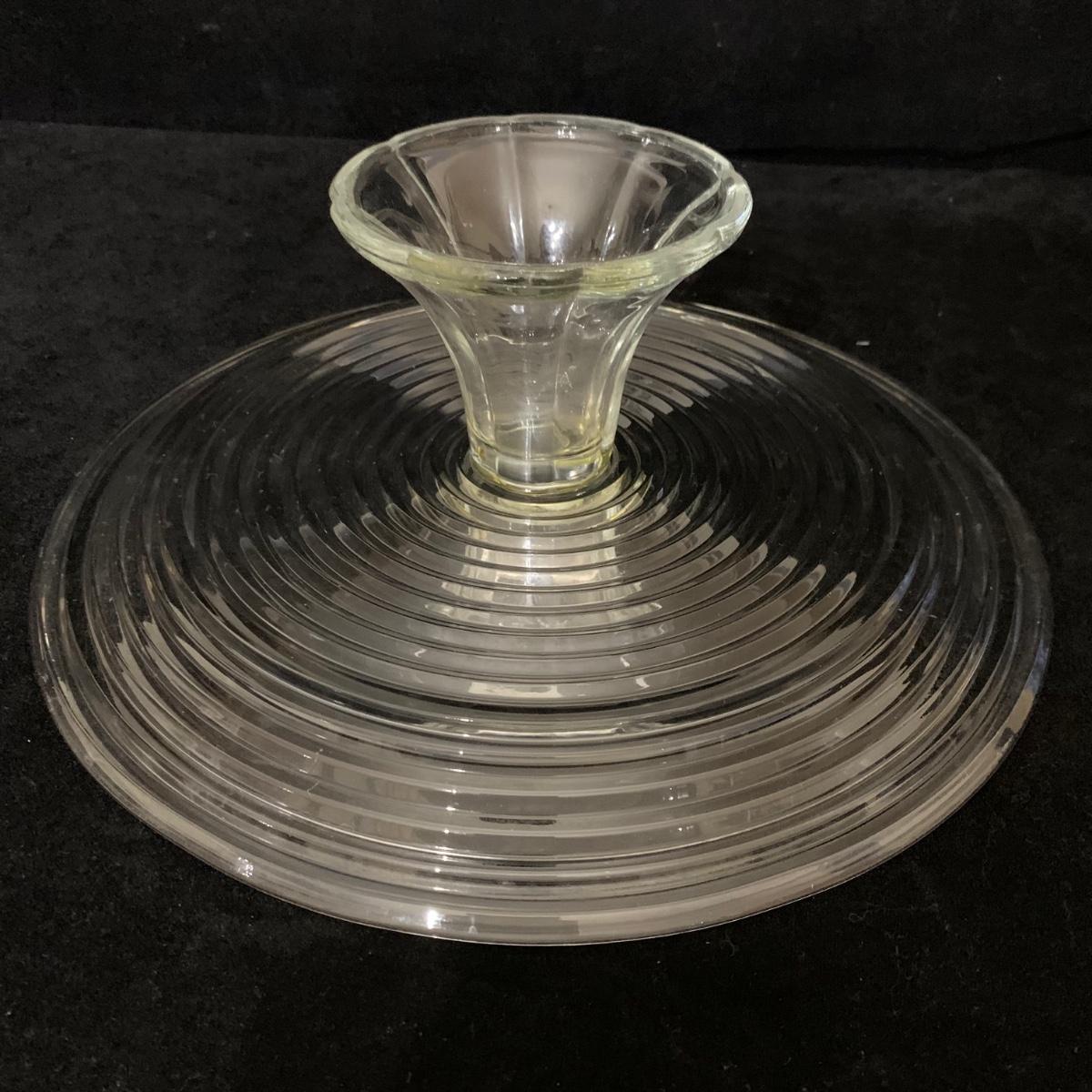 Glass pedestal cake stand with dome lid. Widest part of stand/platter measures 13”d. With lid on it is about 10” tall. Stand is in good condition and just needs to be cleaned. There is a slight yellow hue where the base attaches to the platter. Two cake servers are included that are stainless steel with blue and white floral glass handles. One is Sheffield brand and the other was made in Japan. Five unmarked blue and white floral mugs are included as well. One has a small chip.