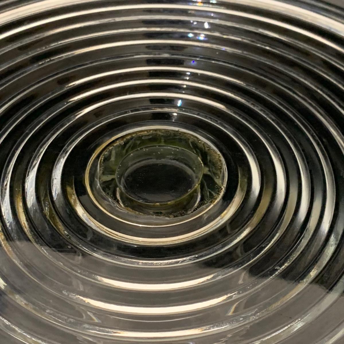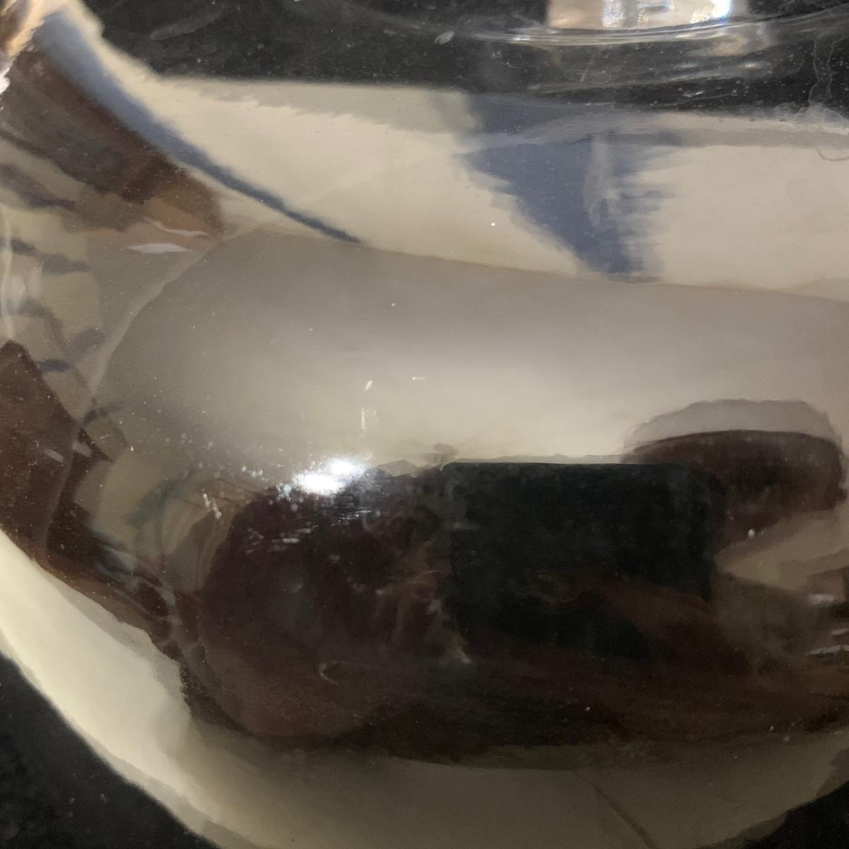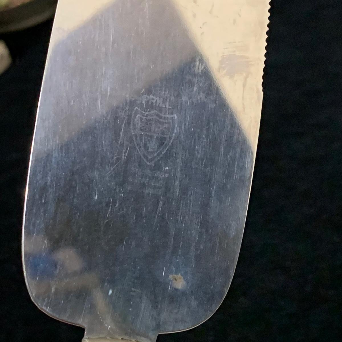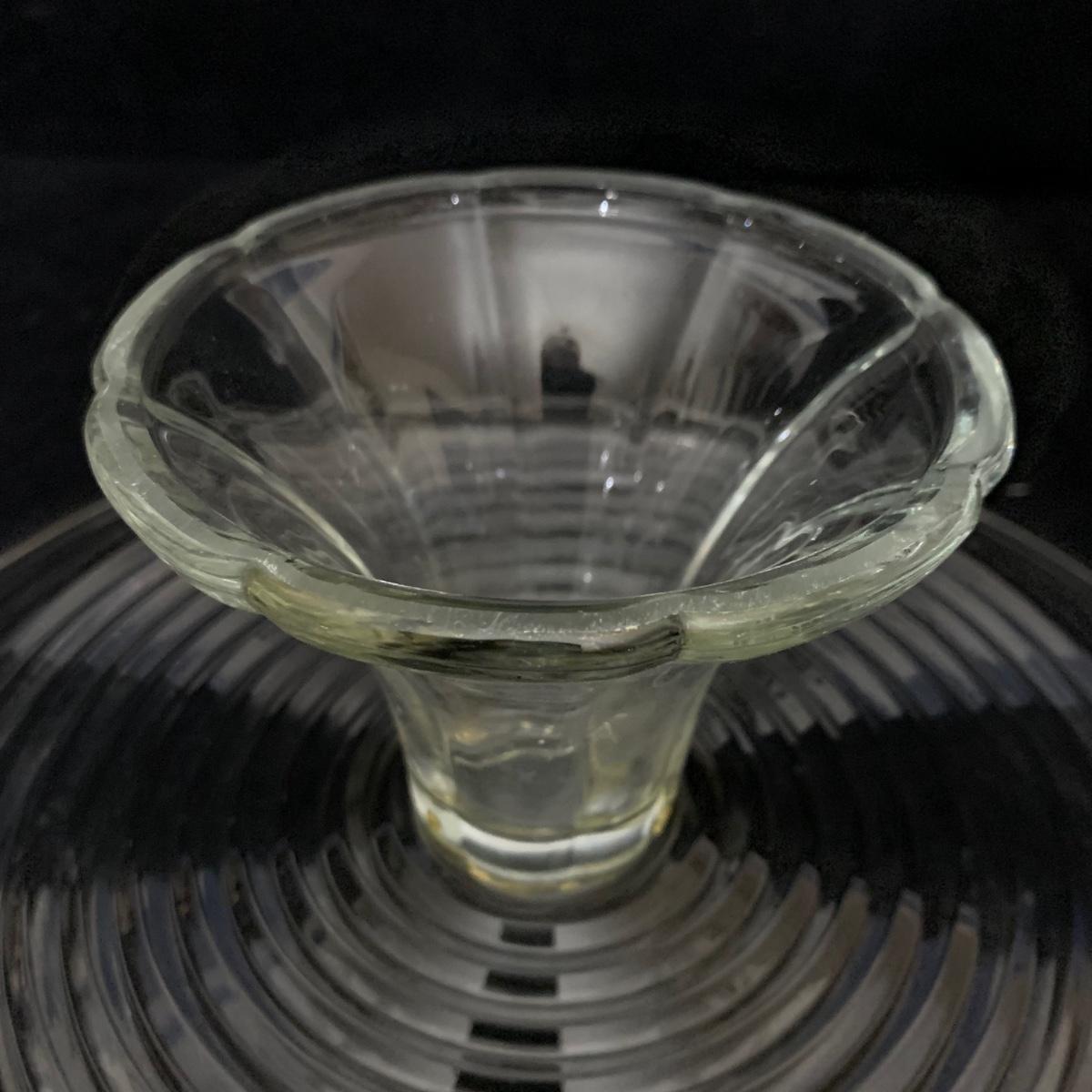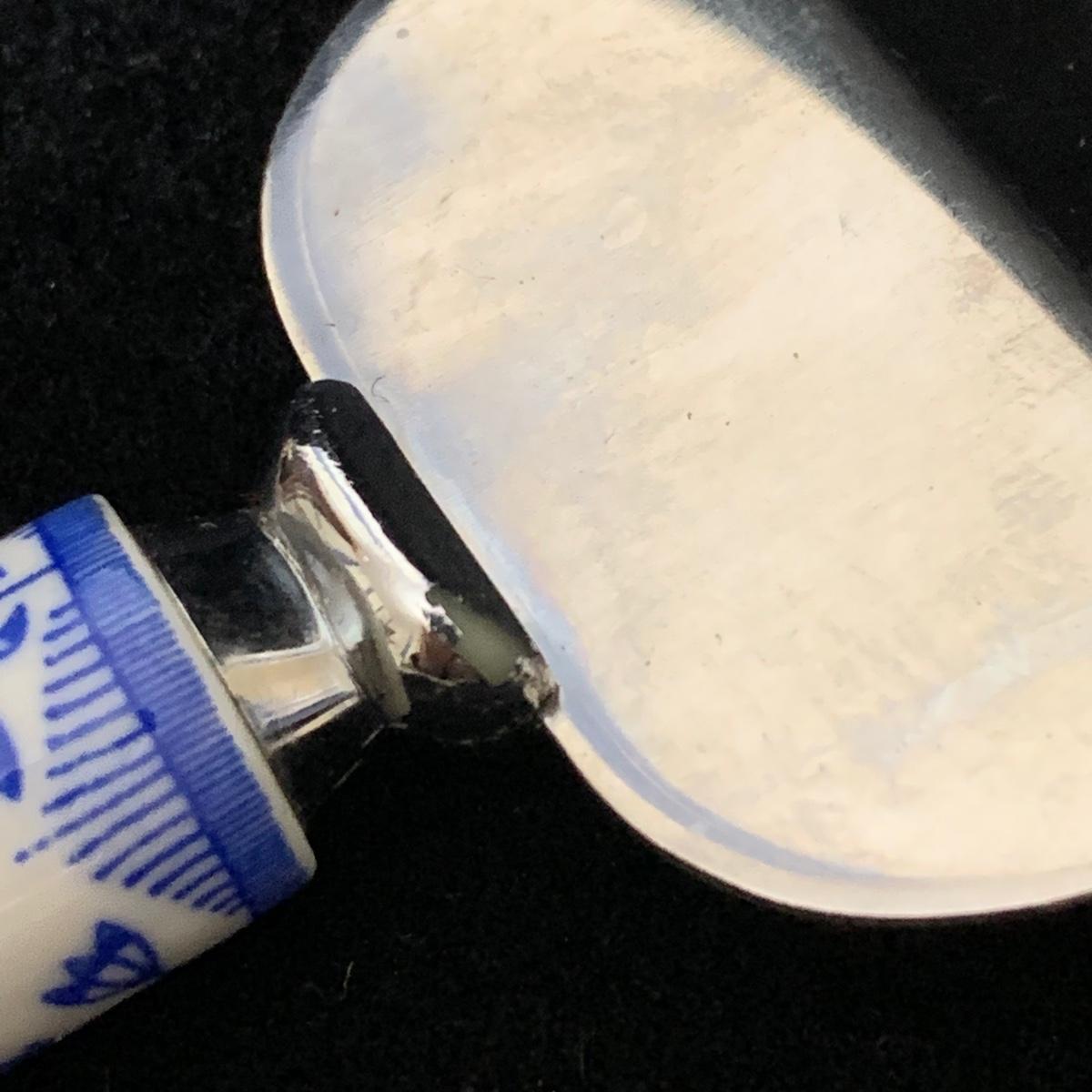 Glass pedestal cake stand with dome lid. Widest part of stand/platter measures 13”d. With lid on it is about 10” tall. Stand is in good condition and just needs to be cleaned. There is a slight yellow hue where the base attaches to the platter. Two cake servers are included that are stainless steel with blue and white floral glass handles. One is Sheffield brand and the other was made in Japan. Five unmarked blue and white floral mugs are included as well. One has a small chip.