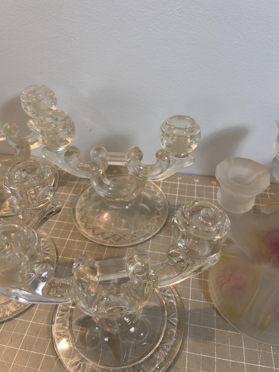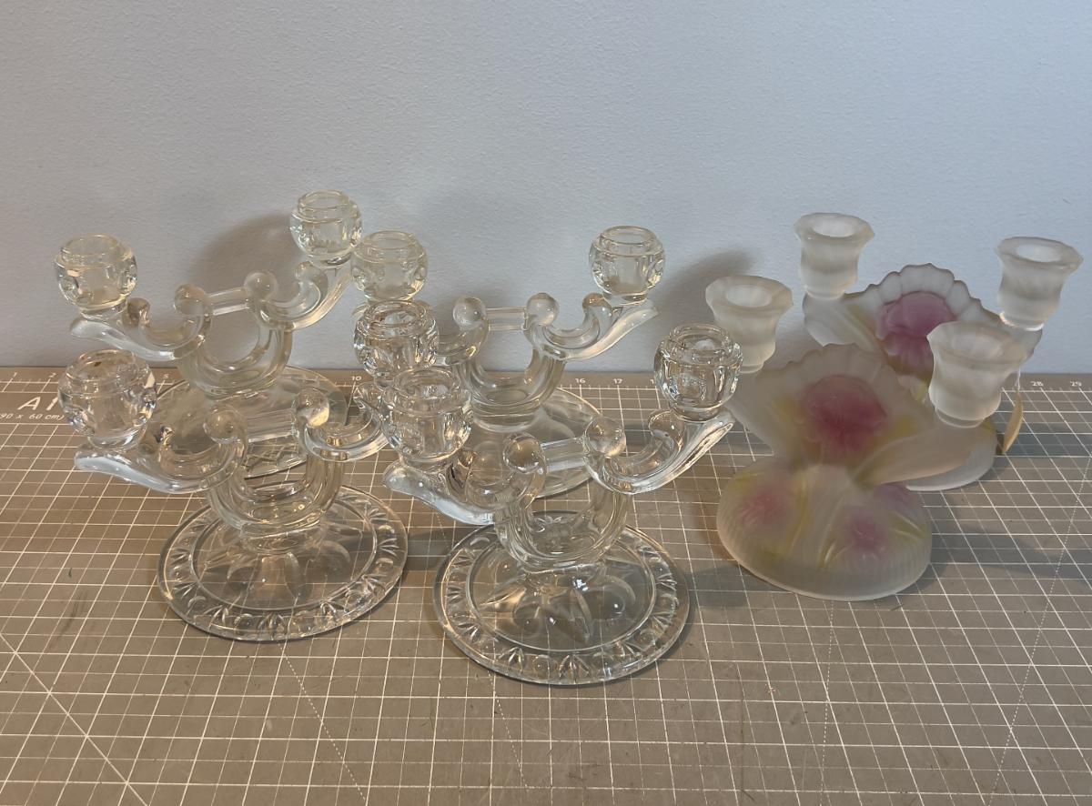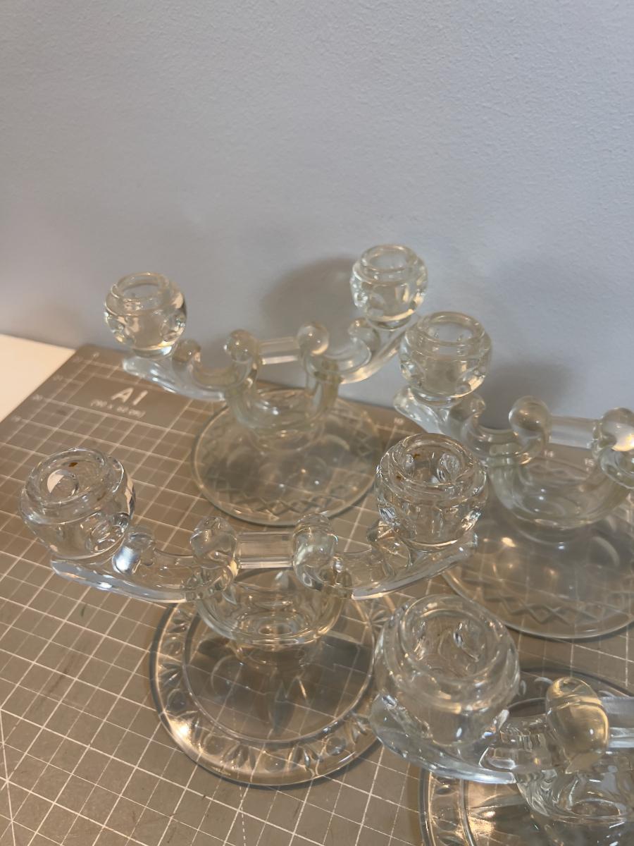 Glass Candelabras (6 ) 1 set is fronted Iris and Herringbone