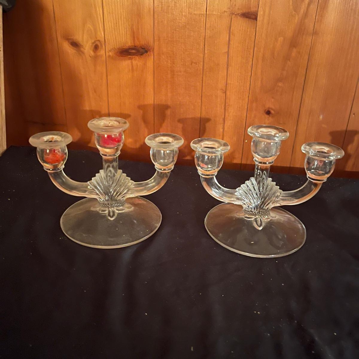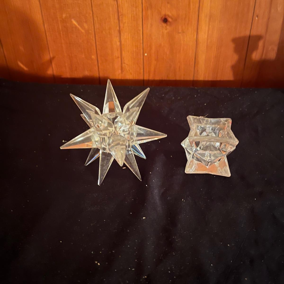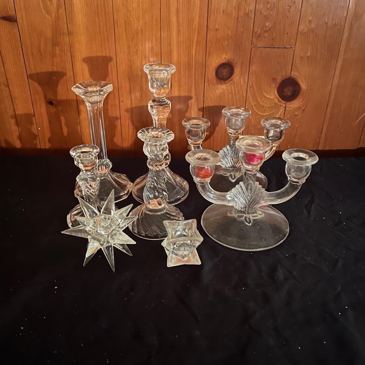 Lot includes a pair of triple candelabras, a star candle holder and four taper candle holders in a variety of sizes.