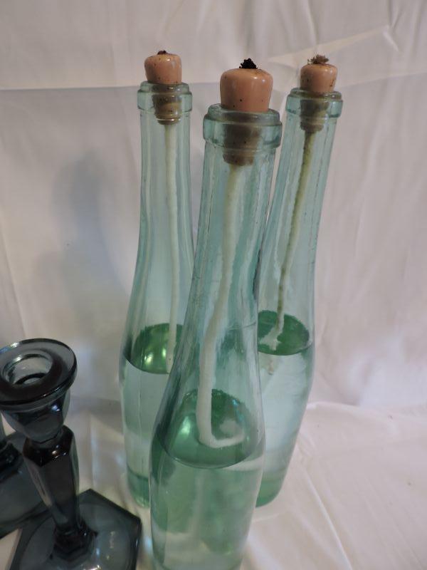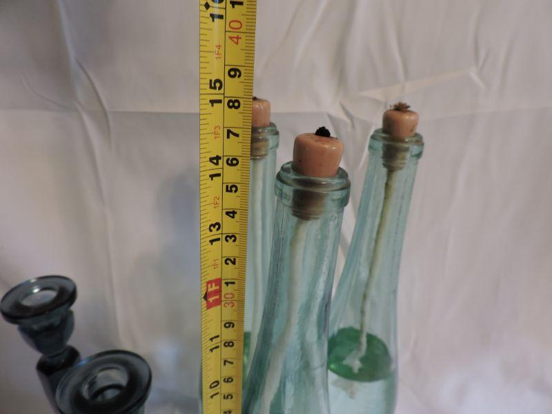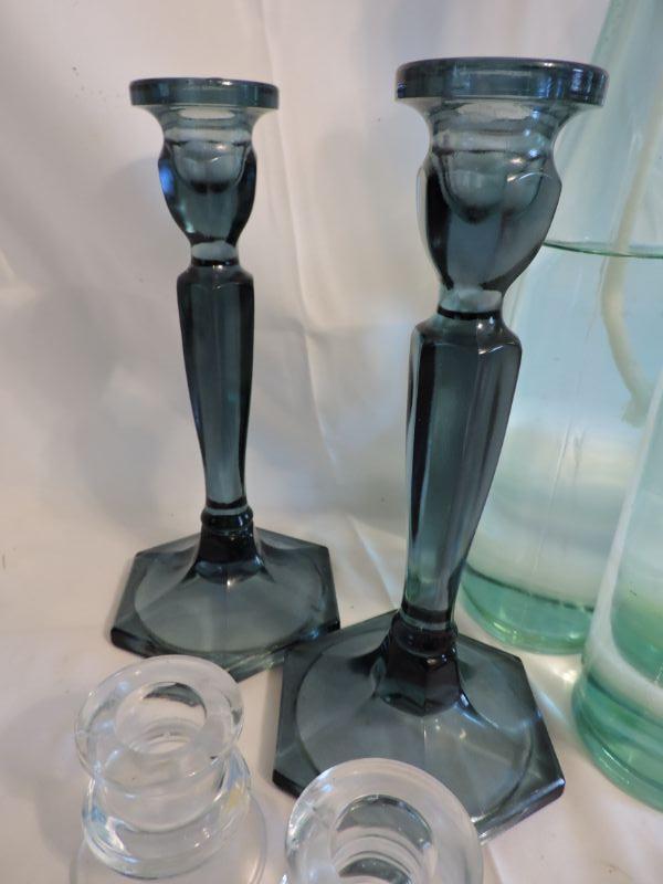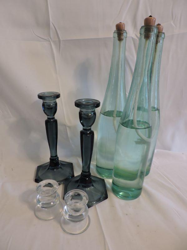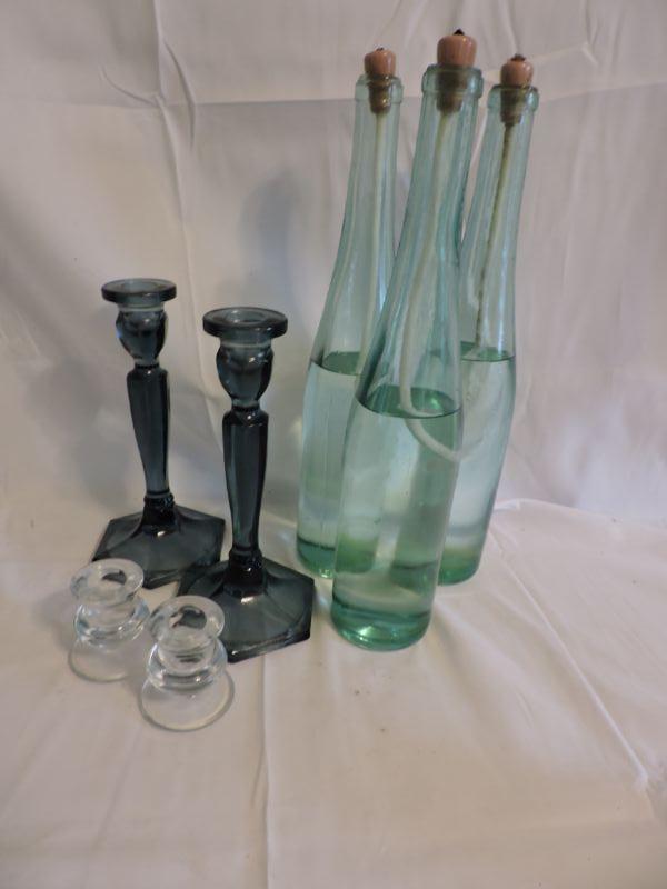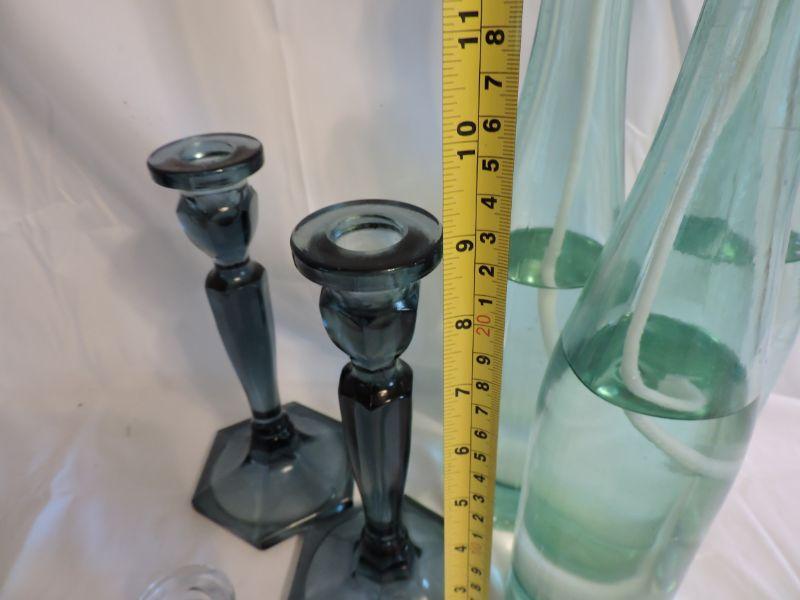 Green glass oil lamps have oil and wicks, and plugs. Two more pair of glass candlesticks. **Please read Terms and Conditions before placing a bid. Pick up is Saturday, November 30 from 9am to 3pm in Bridgeton, NJ. All sales are final. All sales are as is, where is. Please review all photos. Any props included in photos are not included in listing. All measurements are approximate.