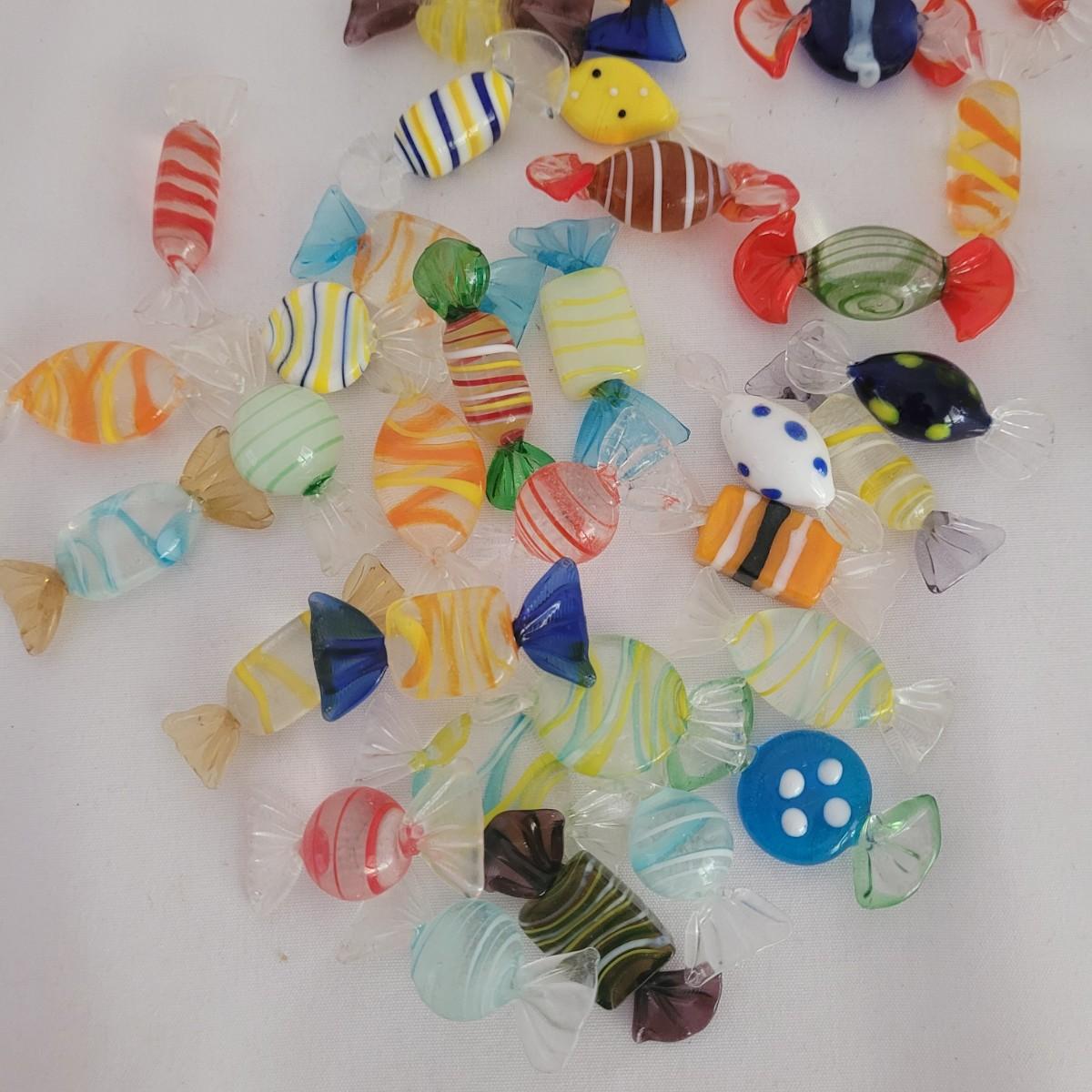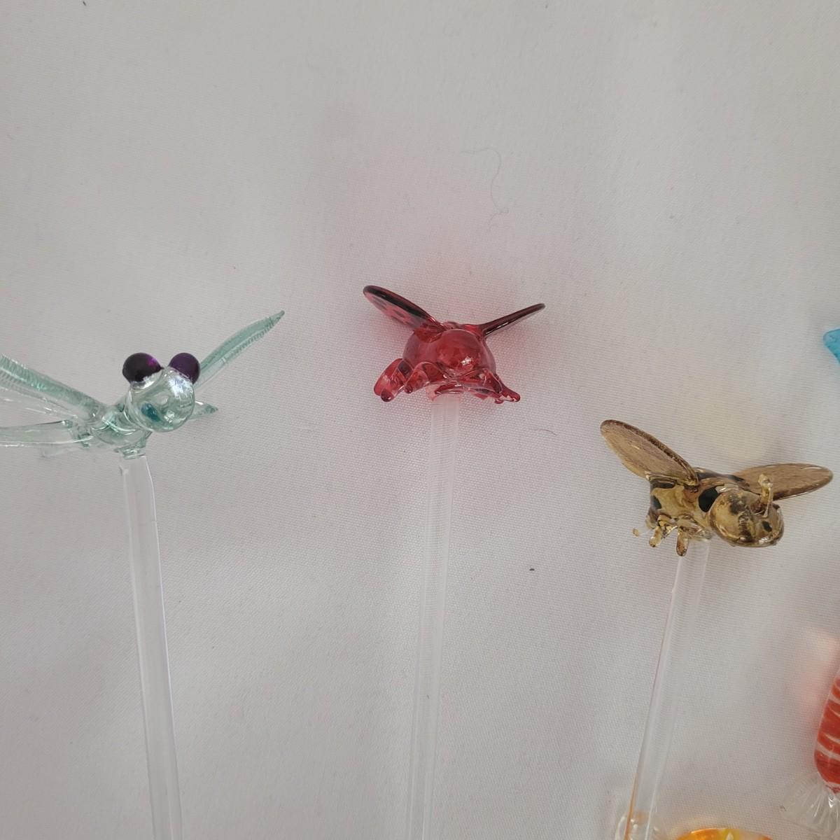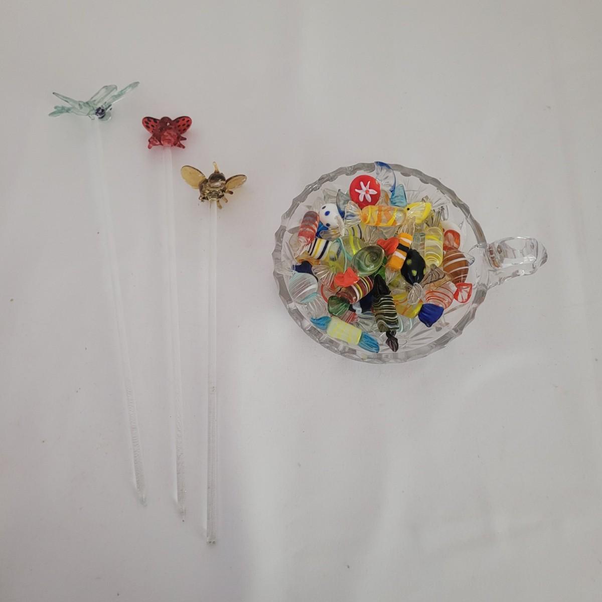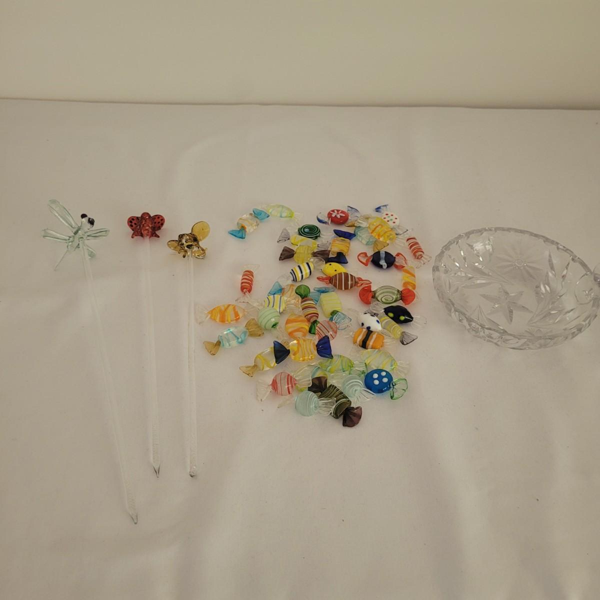A cute assortment of glass candies with a dish, in addition to three decorative planter pieces in the styles of a dragonfly, ladybug and bumblebee. The average piece is approximately 2"L. Some chipping (see photos). Shipping available.