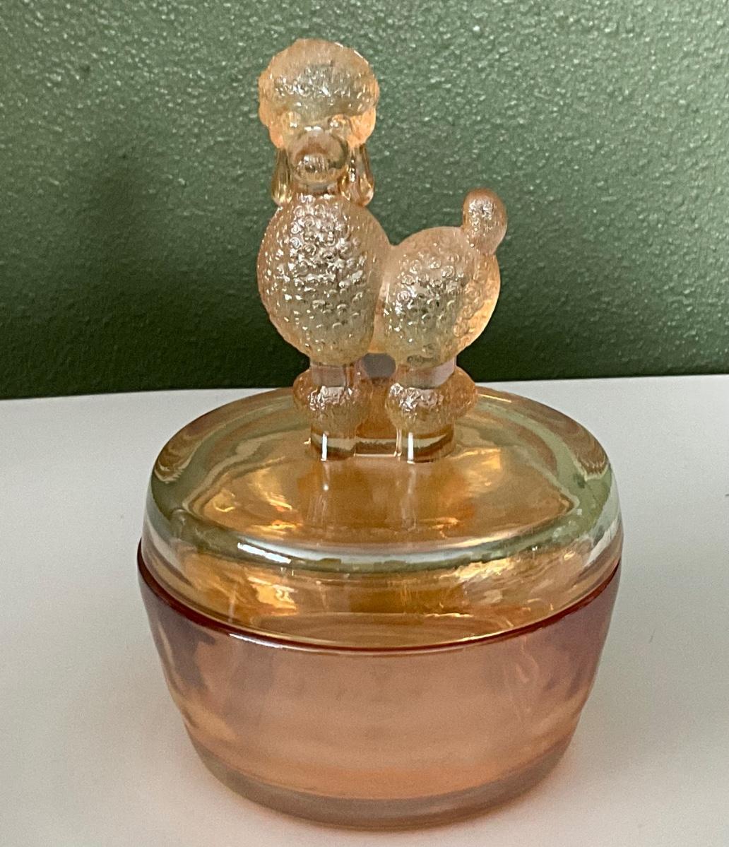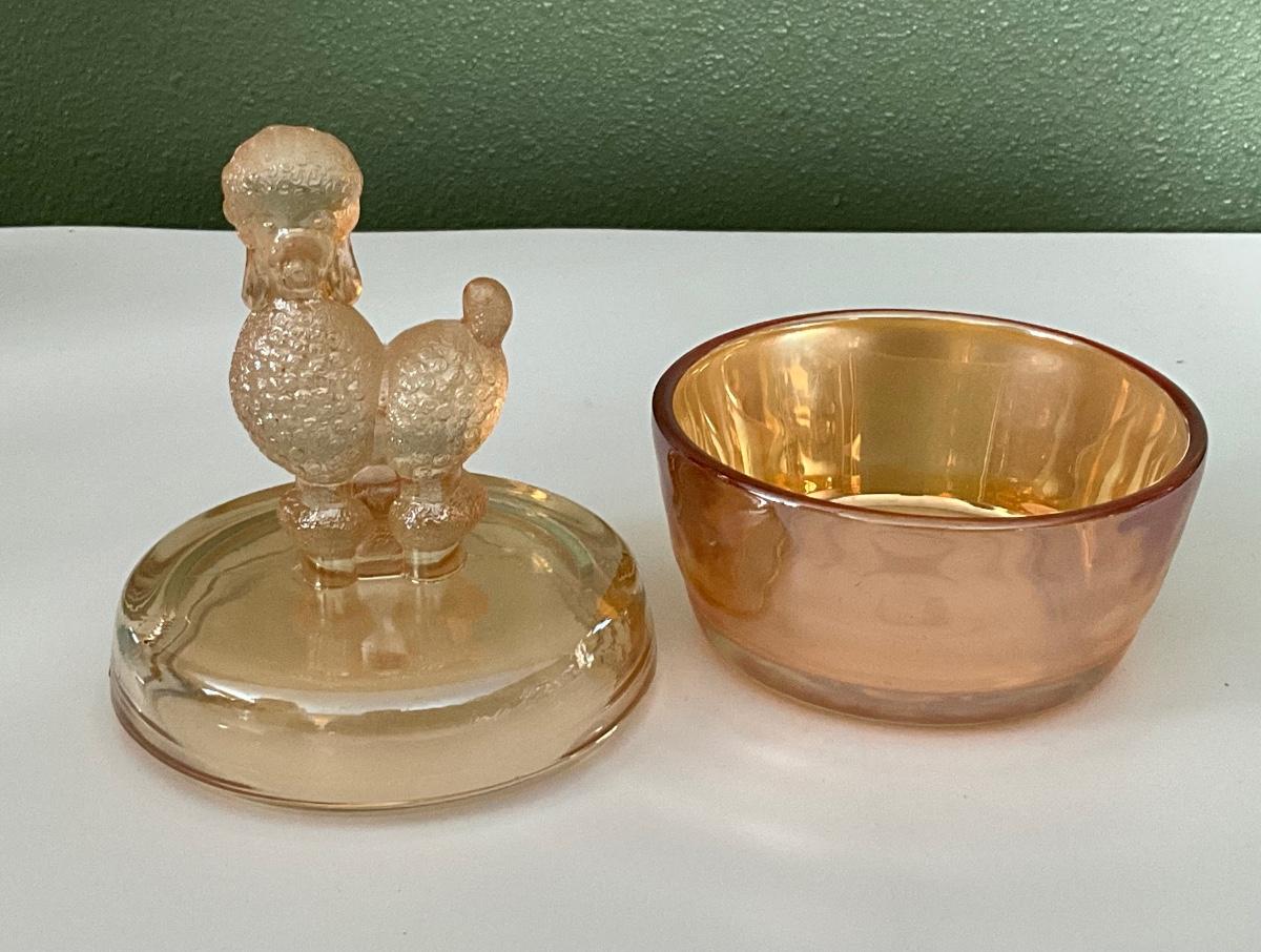 Jeannette Marigold Carnival Glass French Poodle Powder Dish