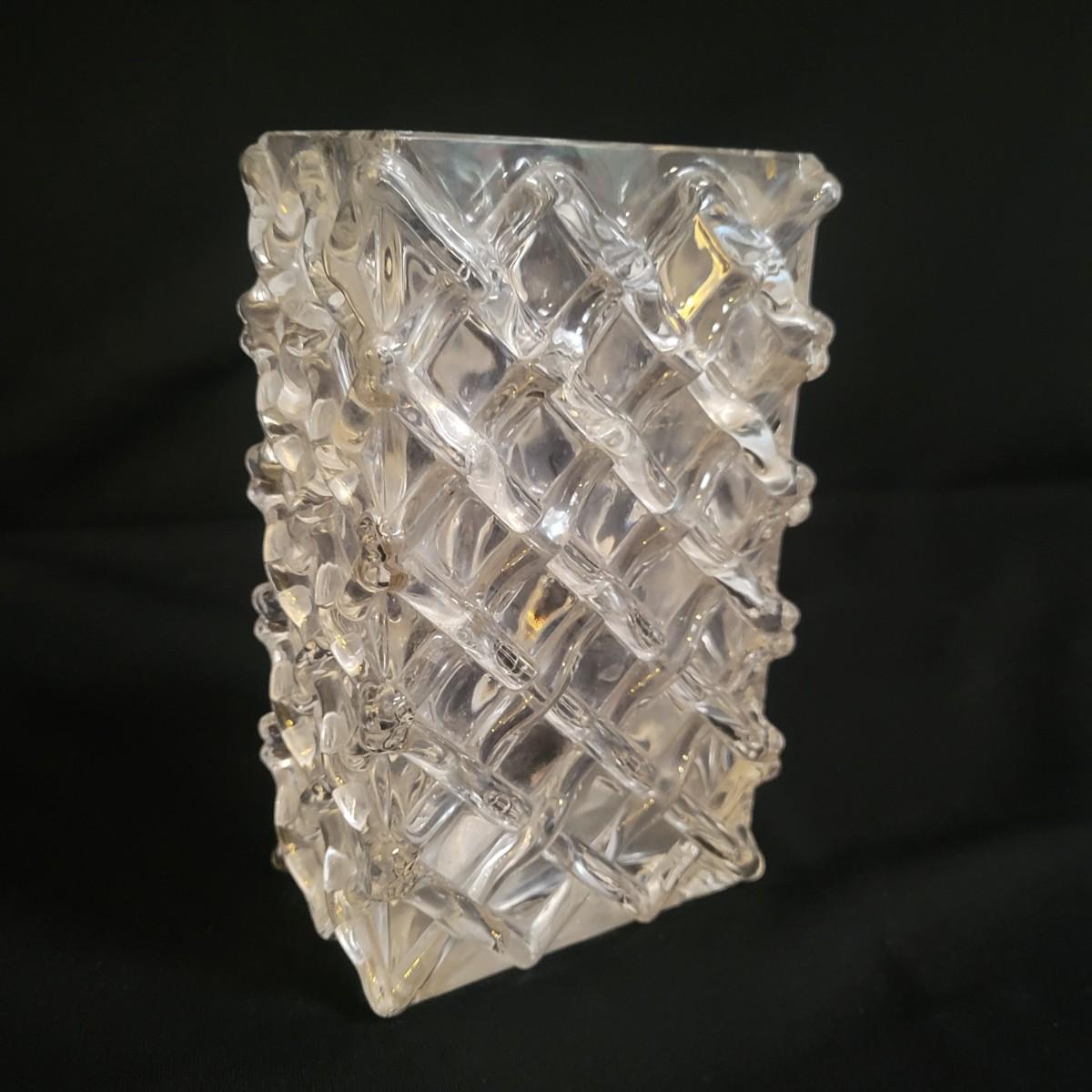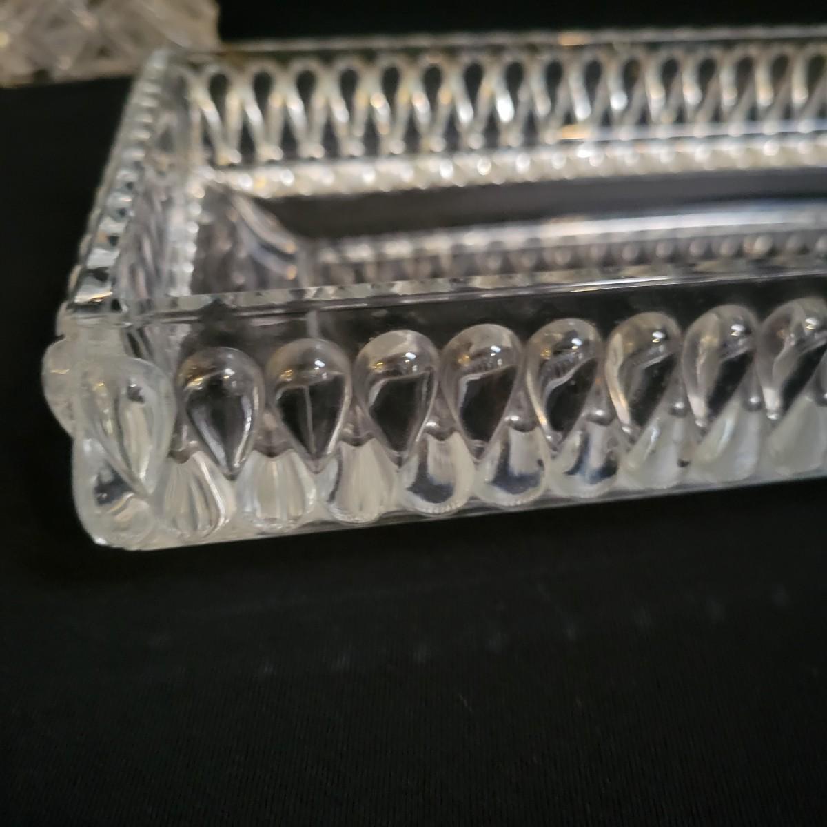 An assortment of decorative glass pieces that include a vase with a basket weave pattern, a candy dish that measures approximately 10.5" x 7" x 2"H and ten dessert dishes. Shipping available