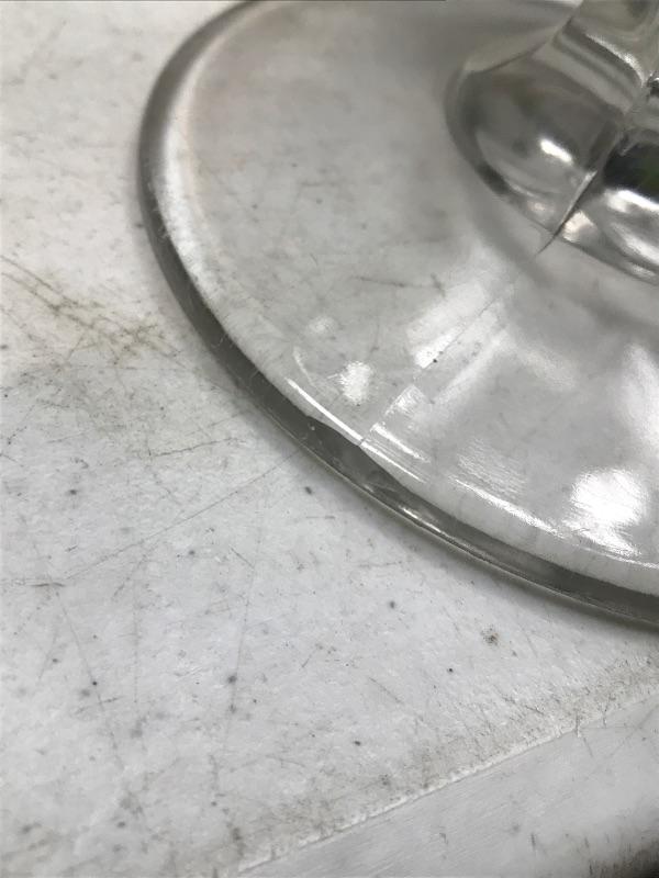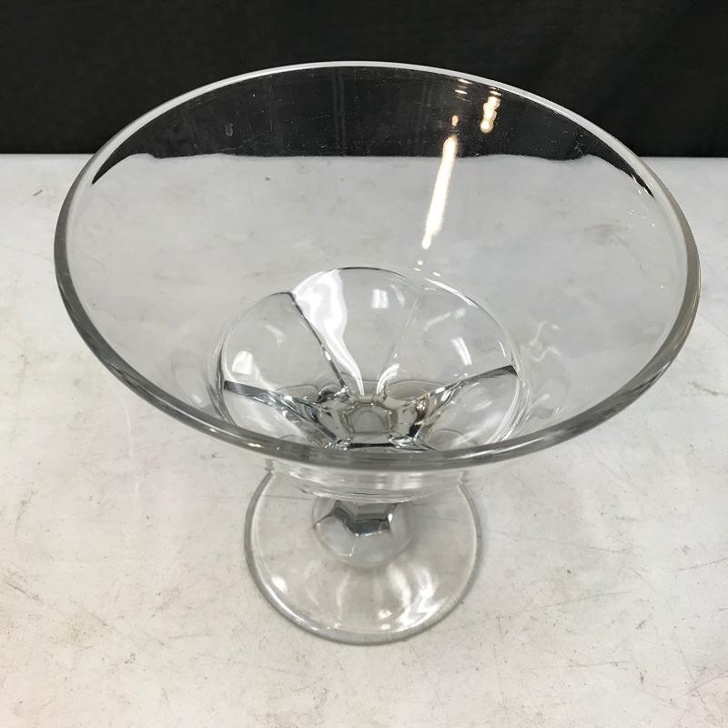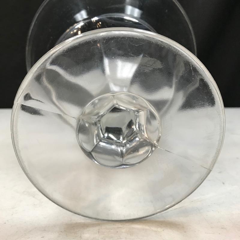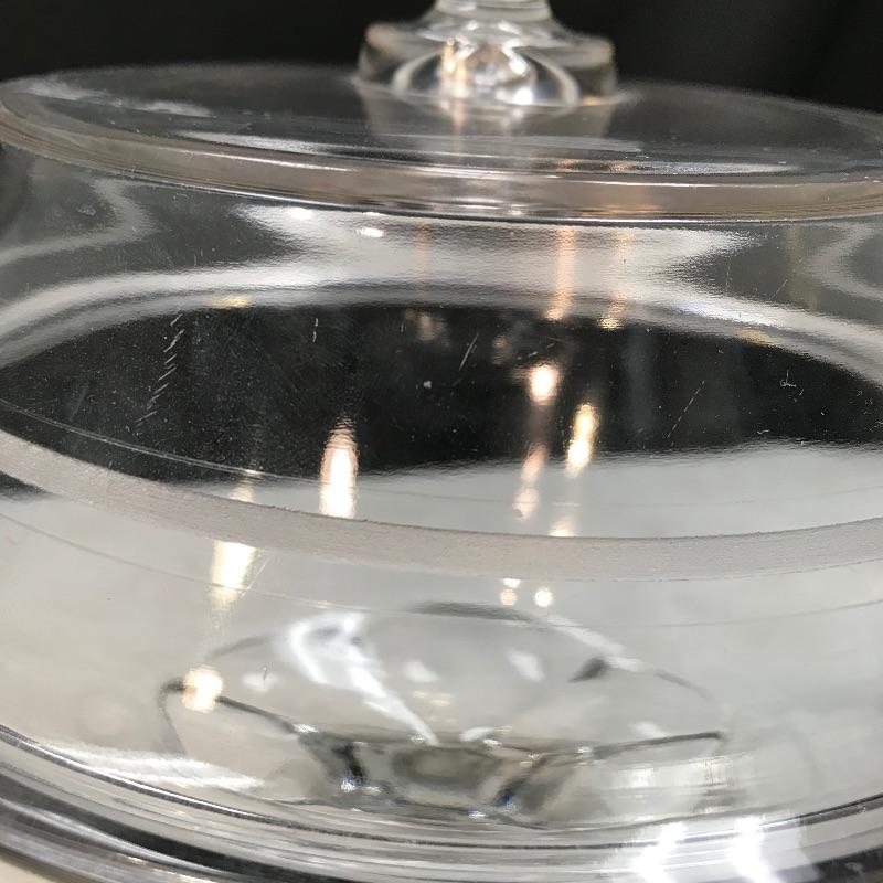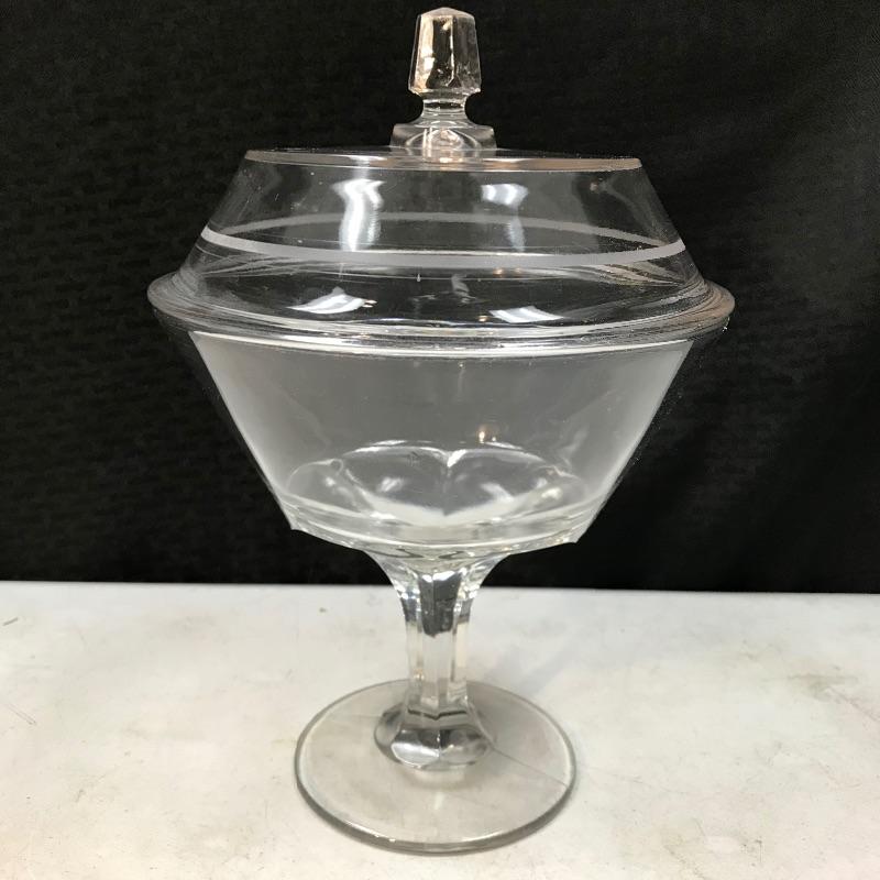 Up for auction is a glass candy dish with a lid. It stands 11 3/4 inches tall. There are some surface scratches all over, as well as a small chip on the bottom rim of the base. See pictures.