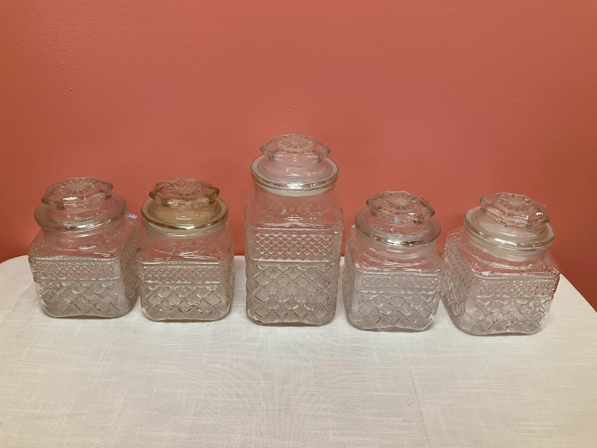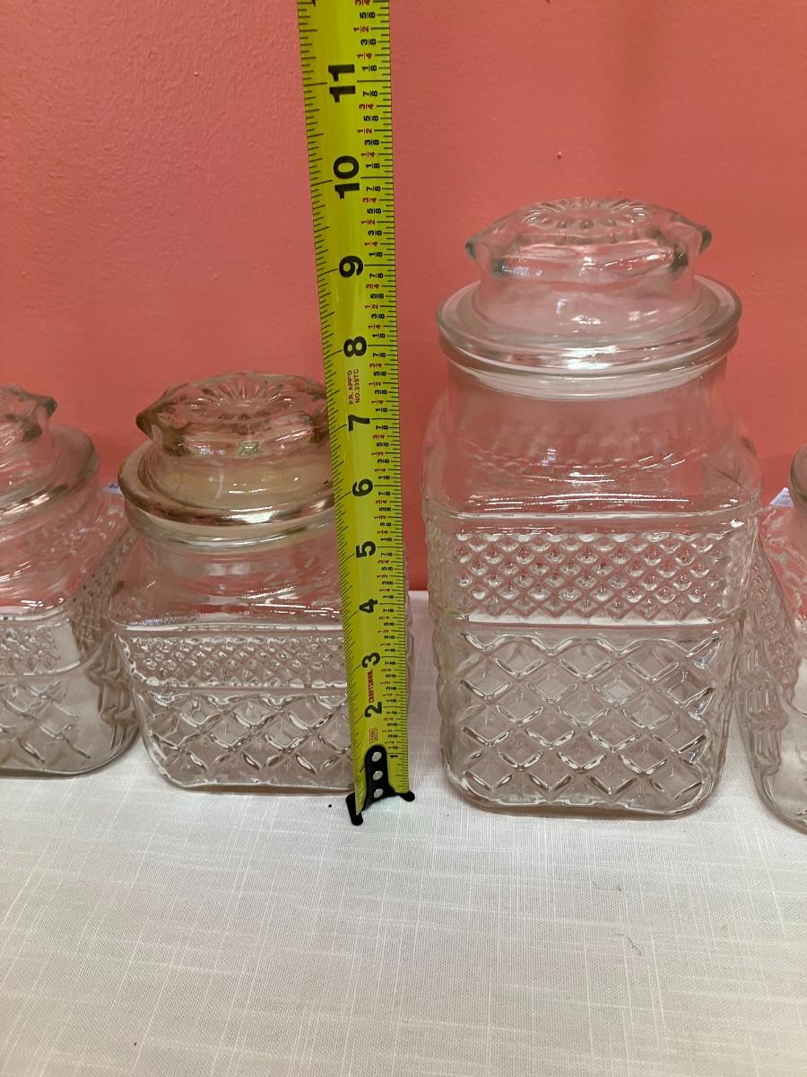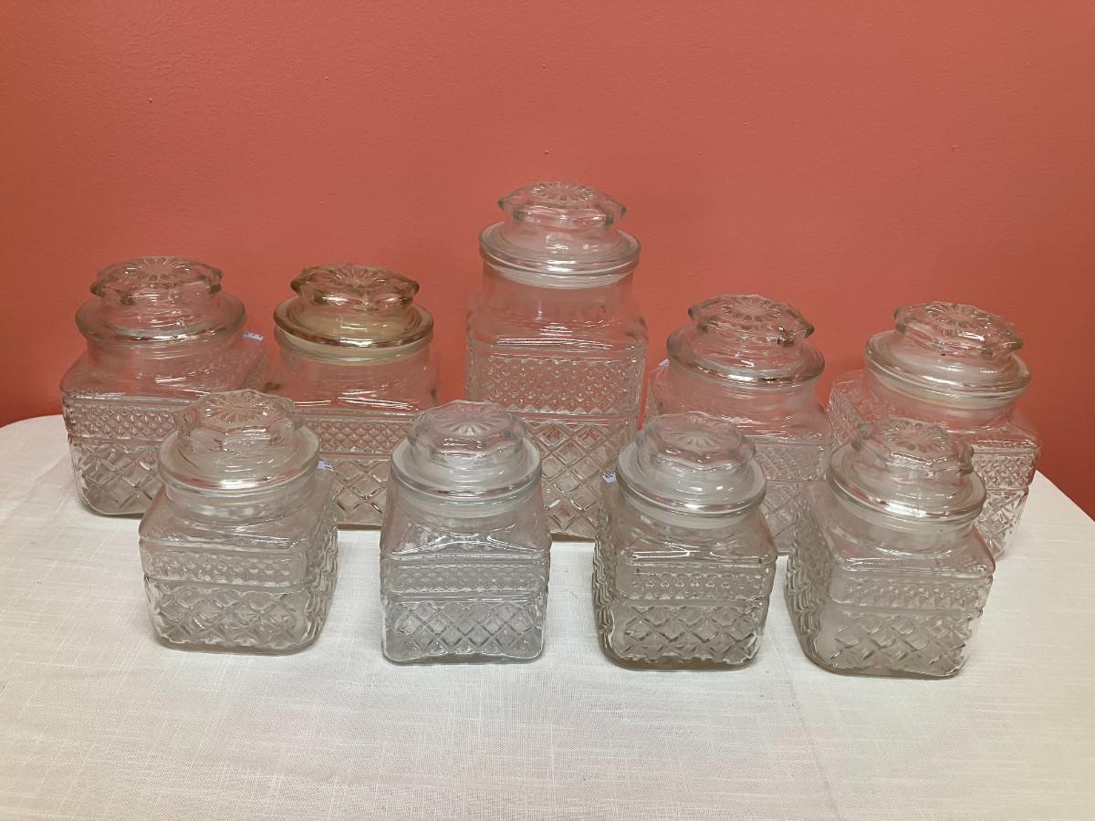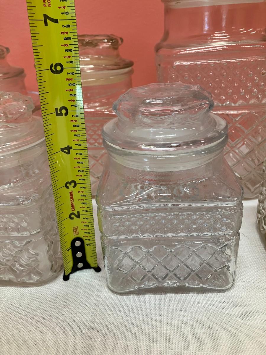 9 glass canisters with lids. See pictures for approx measurements. No chips/cracks.