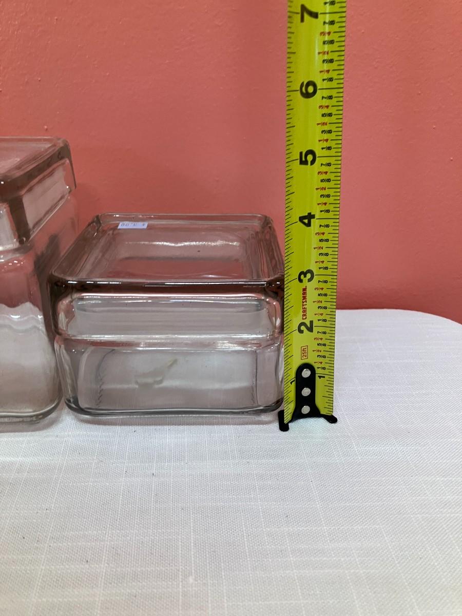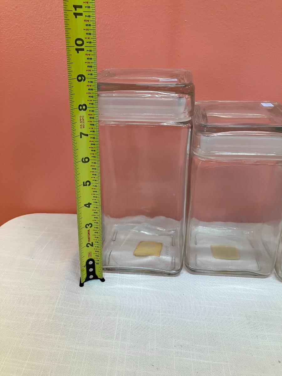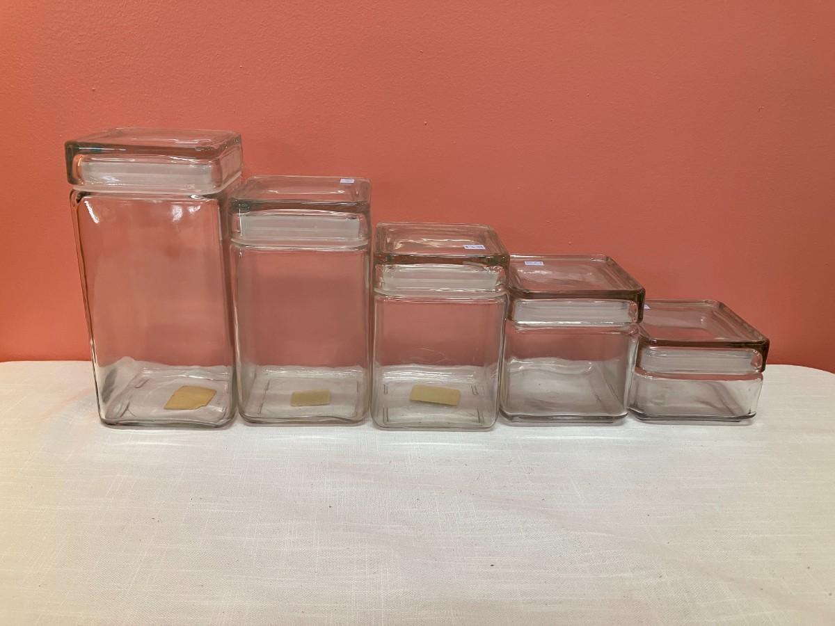 Glass canister set with 5 sizes, all have sealing lids. No chips/cracks. Excellent condition.