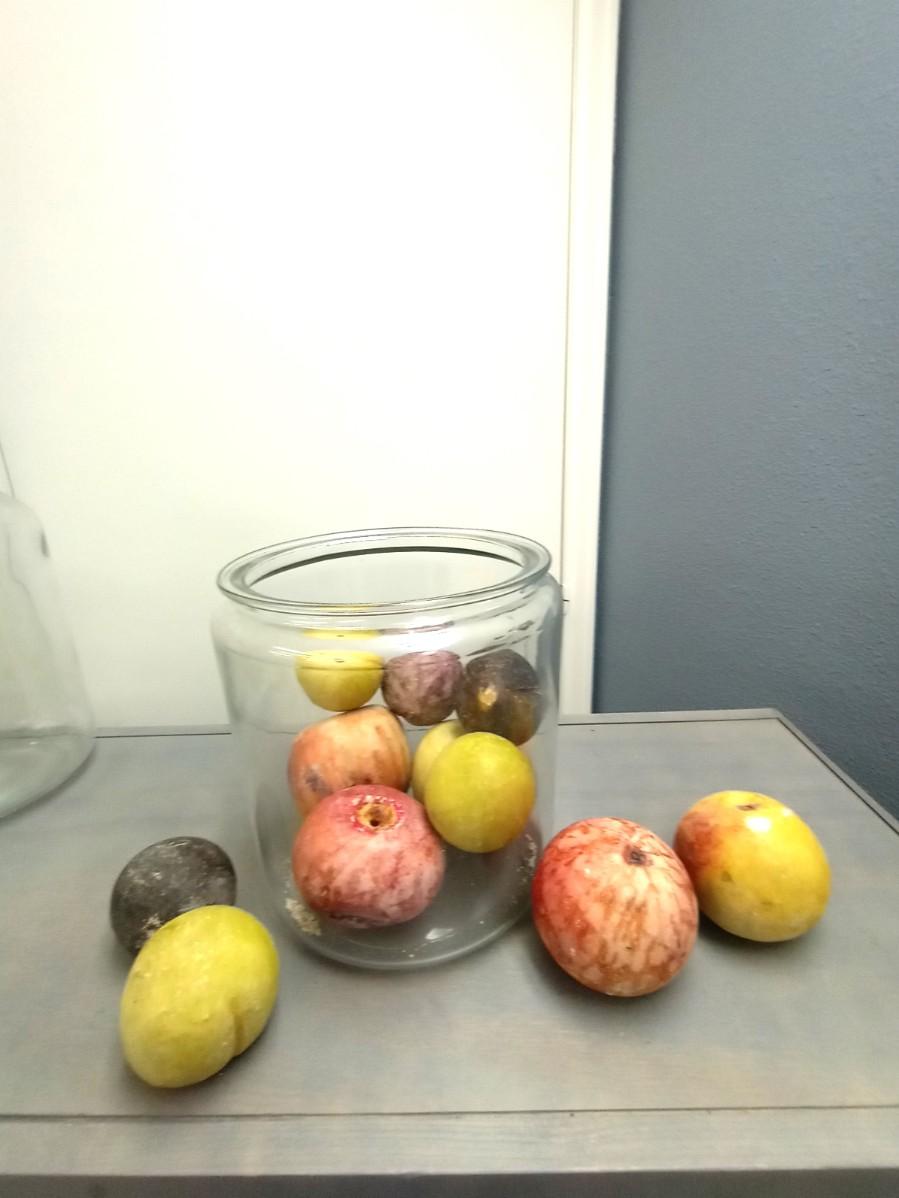 GLASS CANISTERS AND HEAVY DECORATIVE FRUIT PIECES