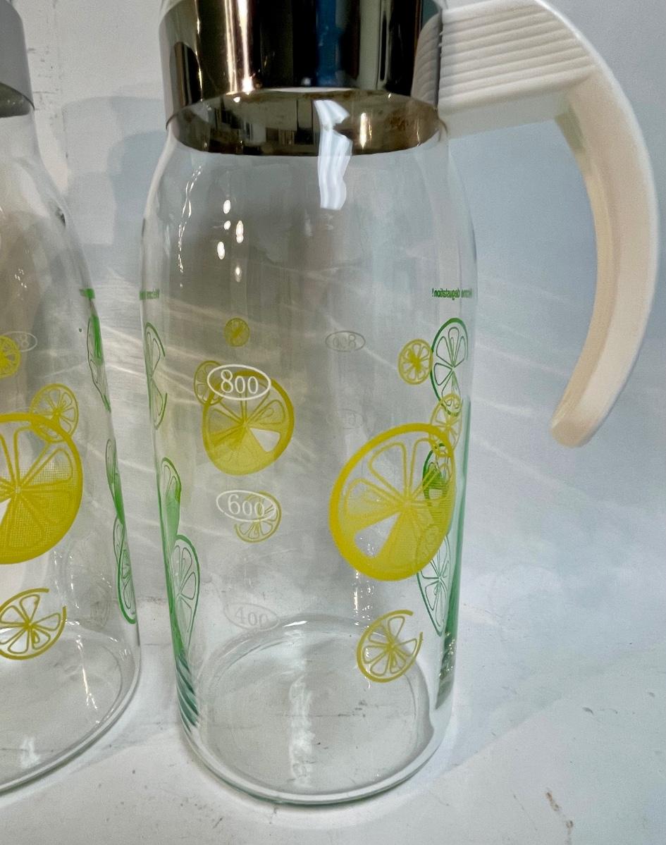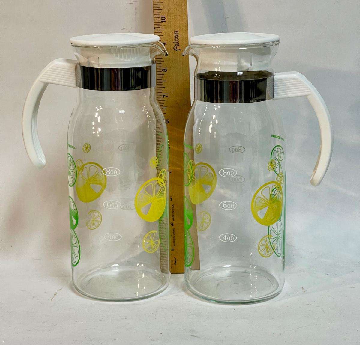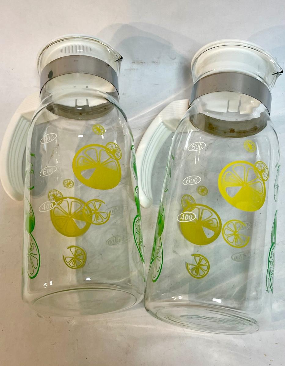 Lot of (2) Vintage Pyrex Lemon & Lime Pitcher Carafe Glass with Lid Strainer 1 Qt Welcome Degustation