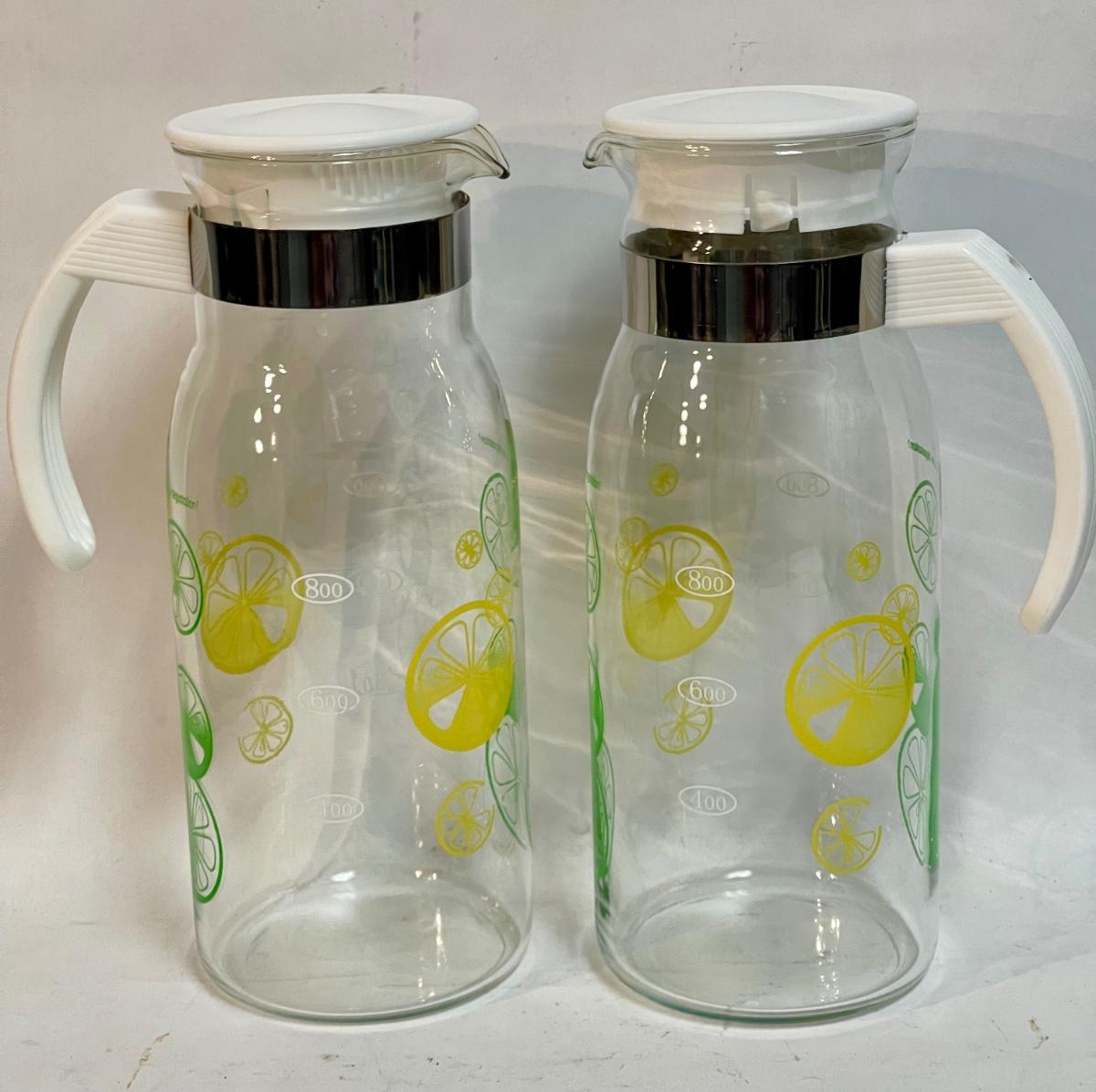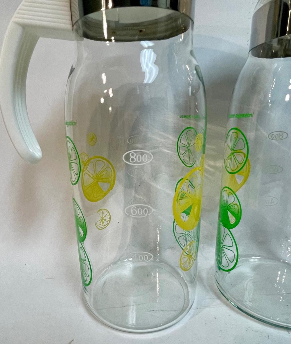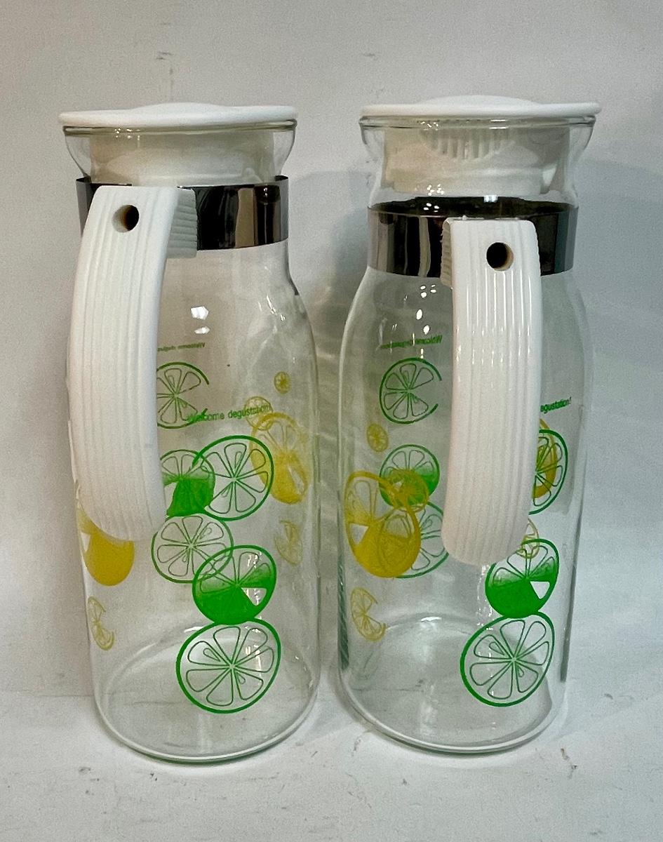 Lot of (2) Vintage Pyrex Lemon & Lime Pitcher Carafe Glass with Lid Strainer 1 Qt Welcome Degustation