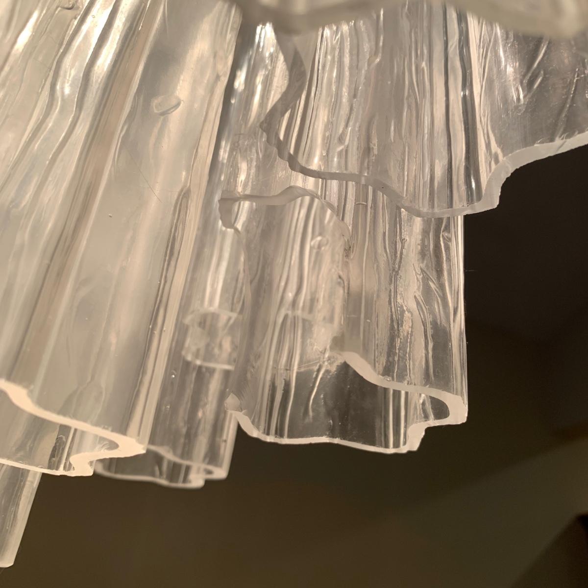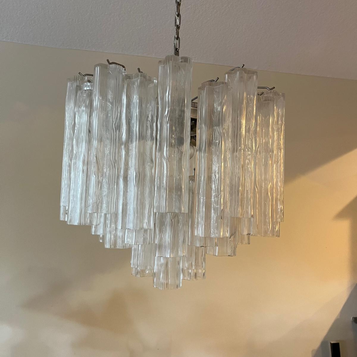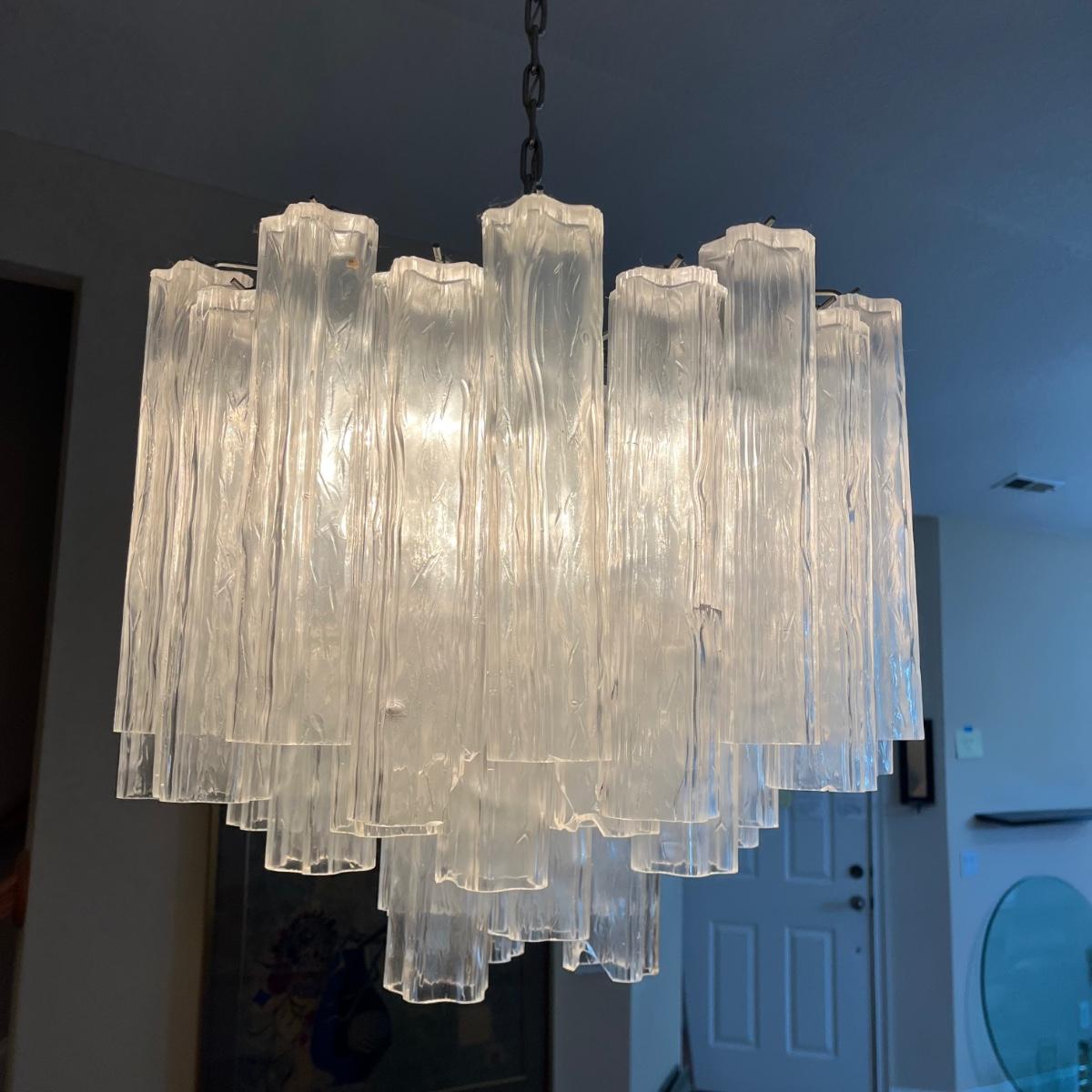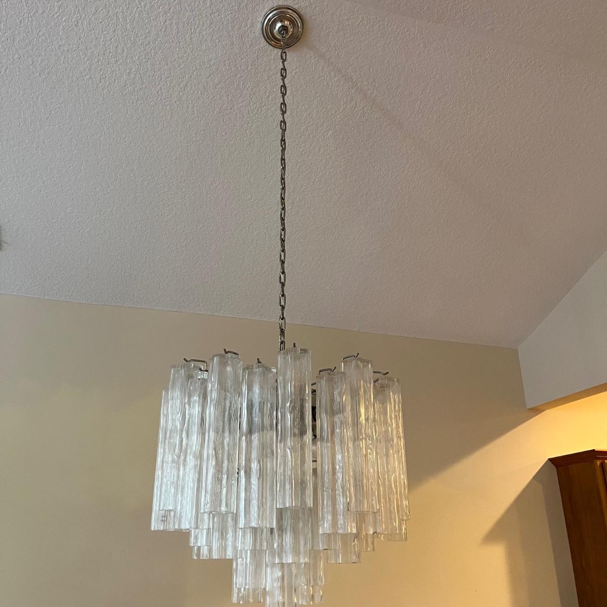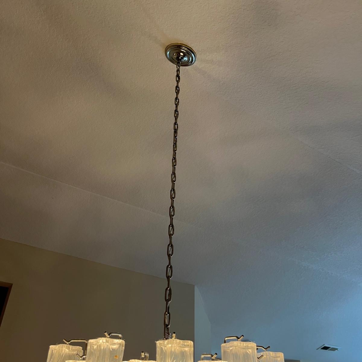 Lot includes a glass chandelier with chrome fixture and chain. Chandelier measures 22”D x 18”H with a 48” long chain. Winning bidder will need to remove chandelier and undo wiring.
