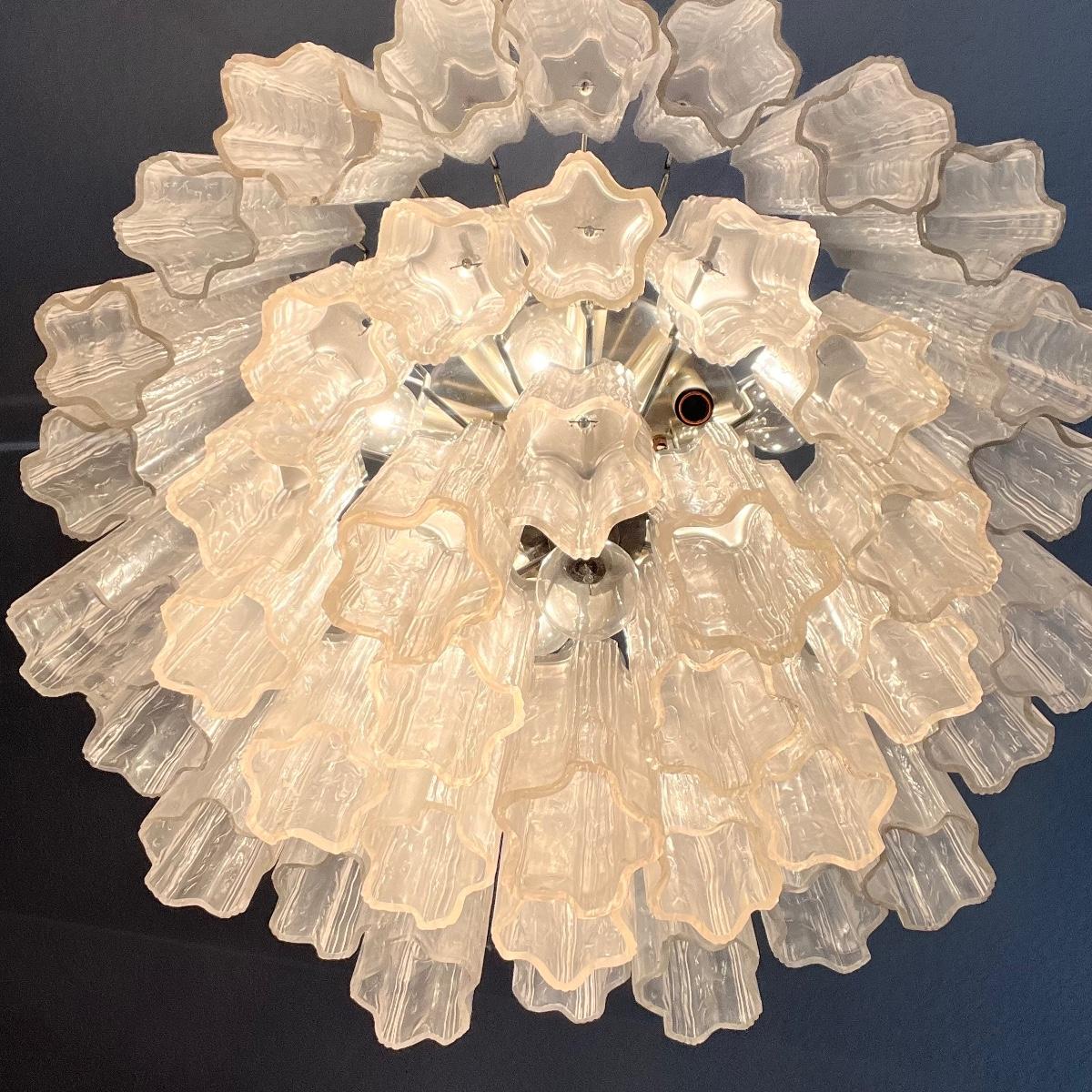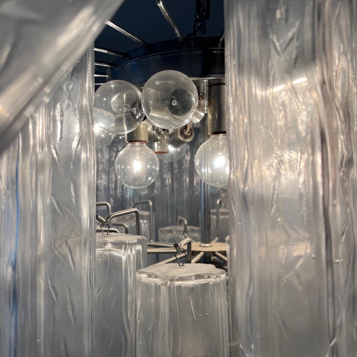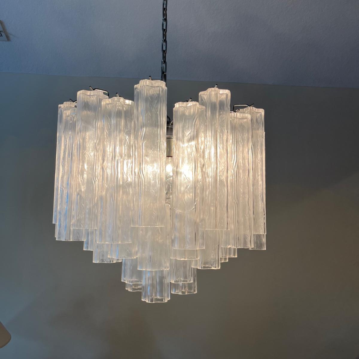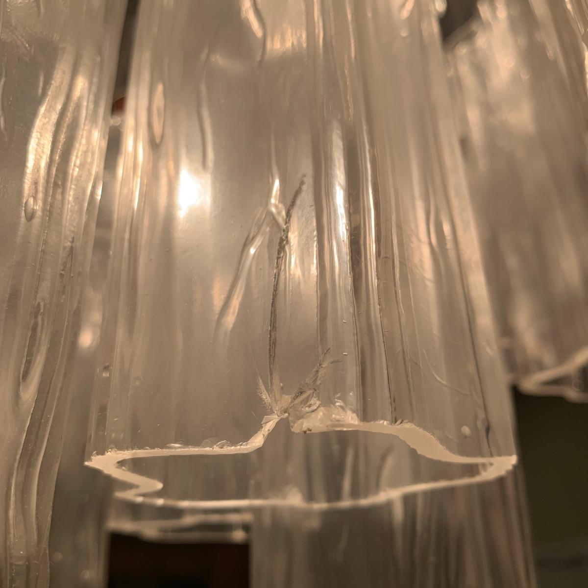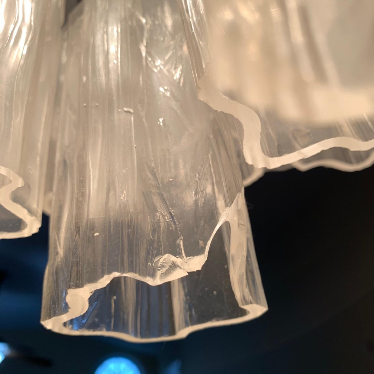 Lot includes a glass chandelier with chrome fixture and chain. Chandelier measures 22”D x 18”H with a 48” long chain. Winning bidder will need to remove chandelier and undo wiring.