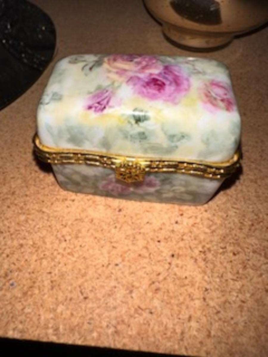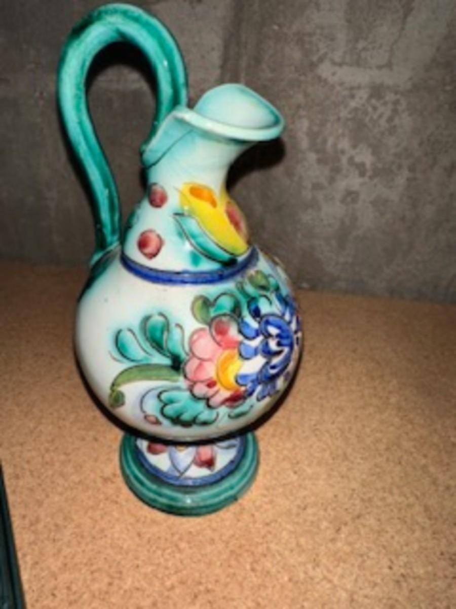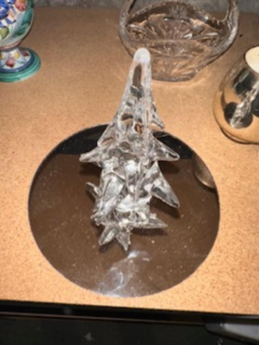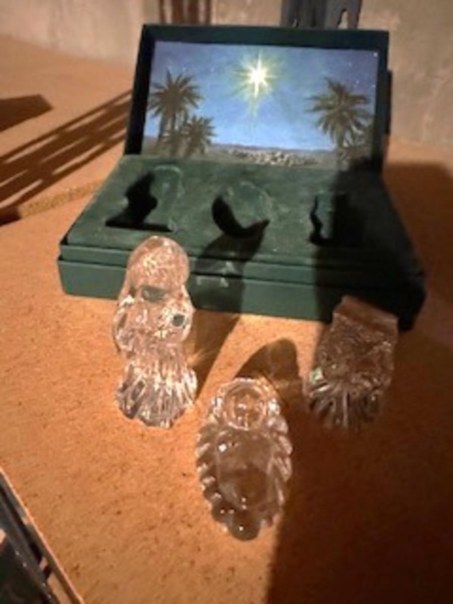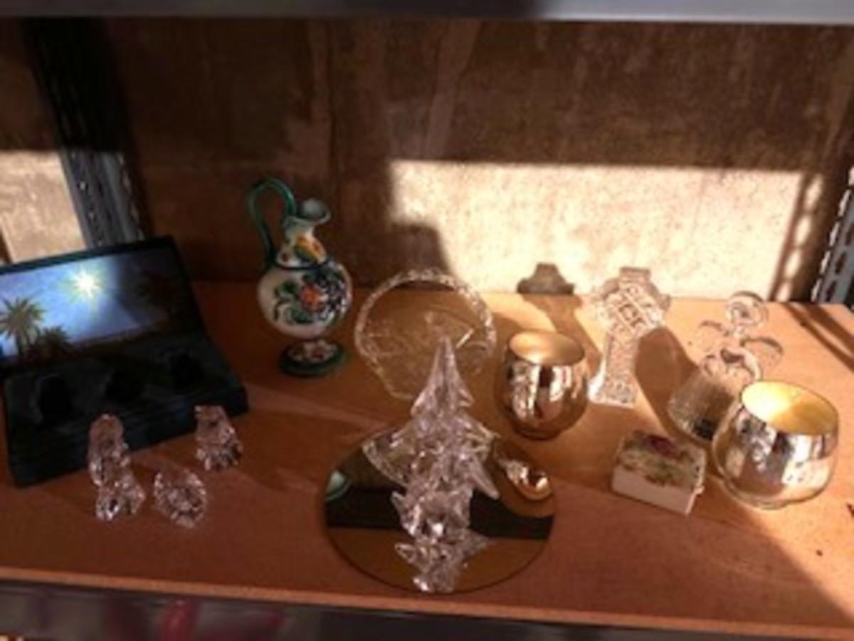 GLASS CHRISTMAS FIGURES, TRINKET BOX AND HAND PAINTED PITCHER