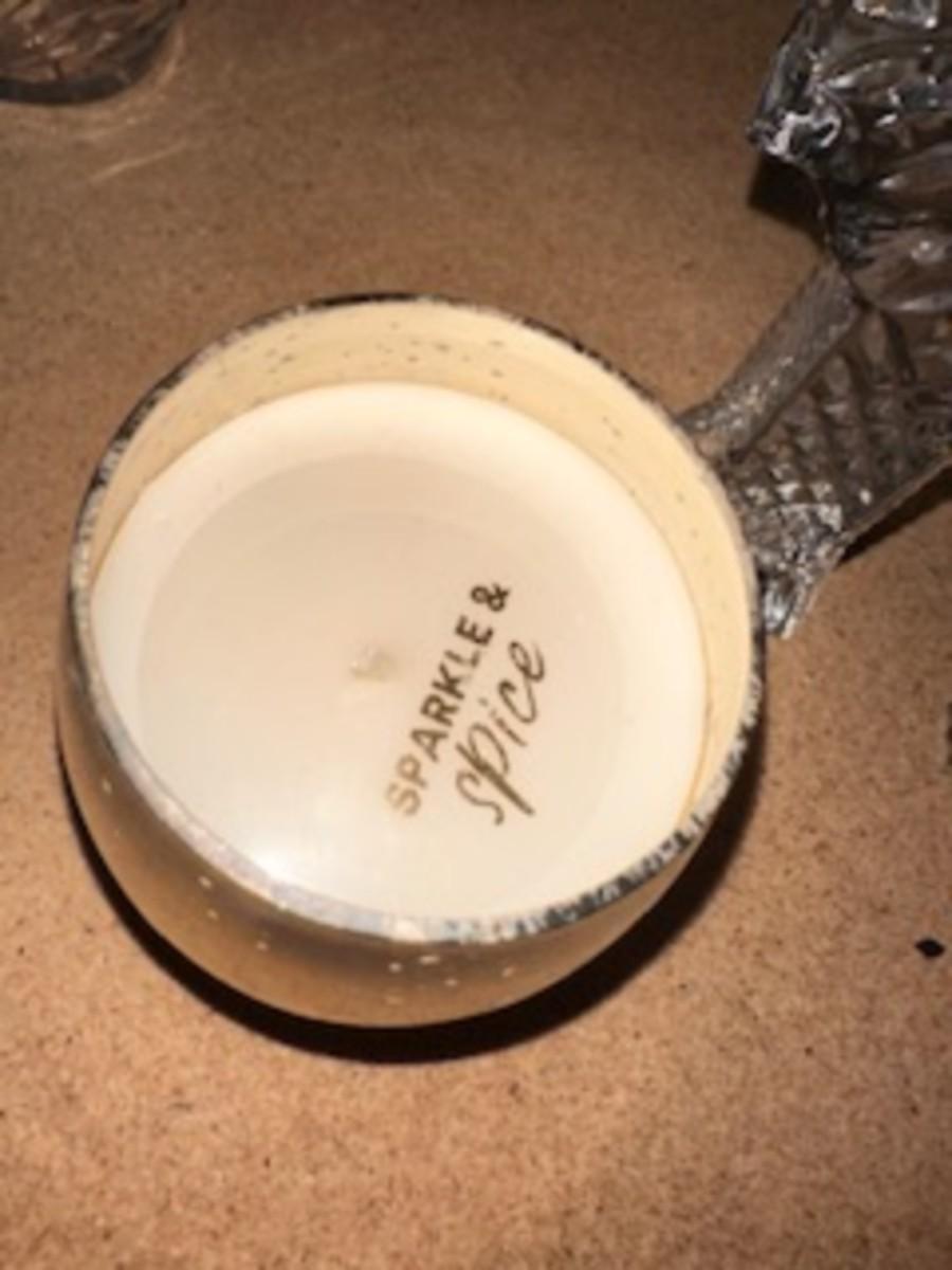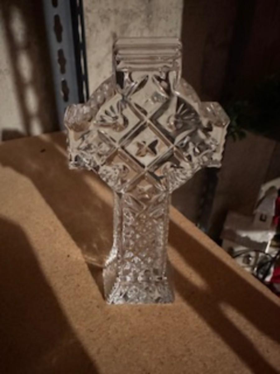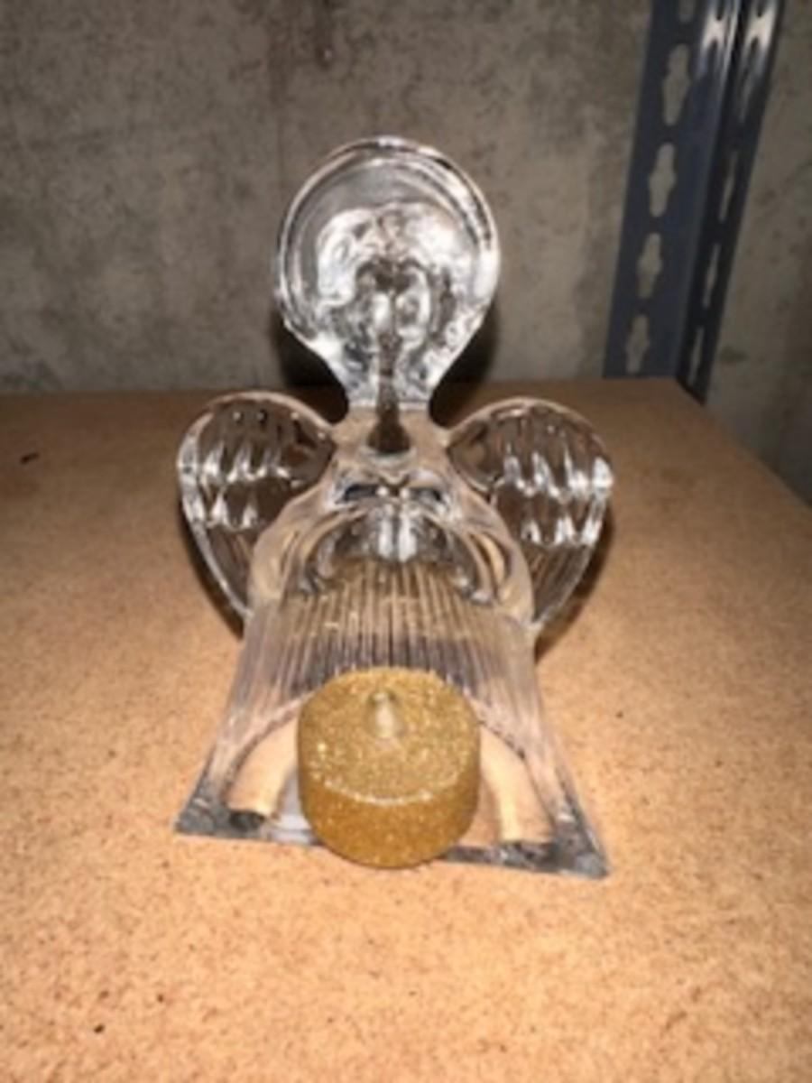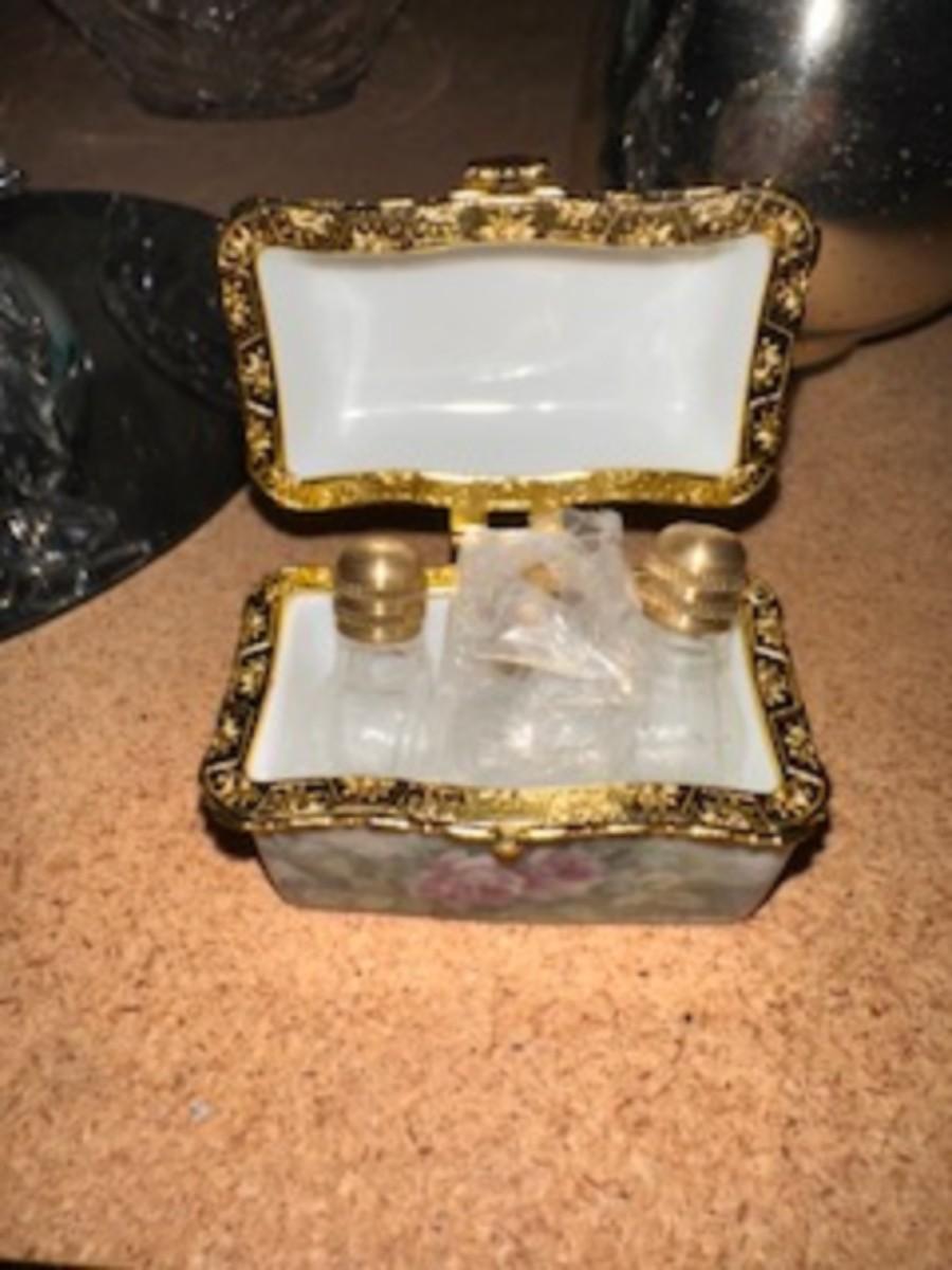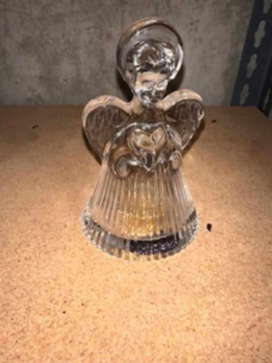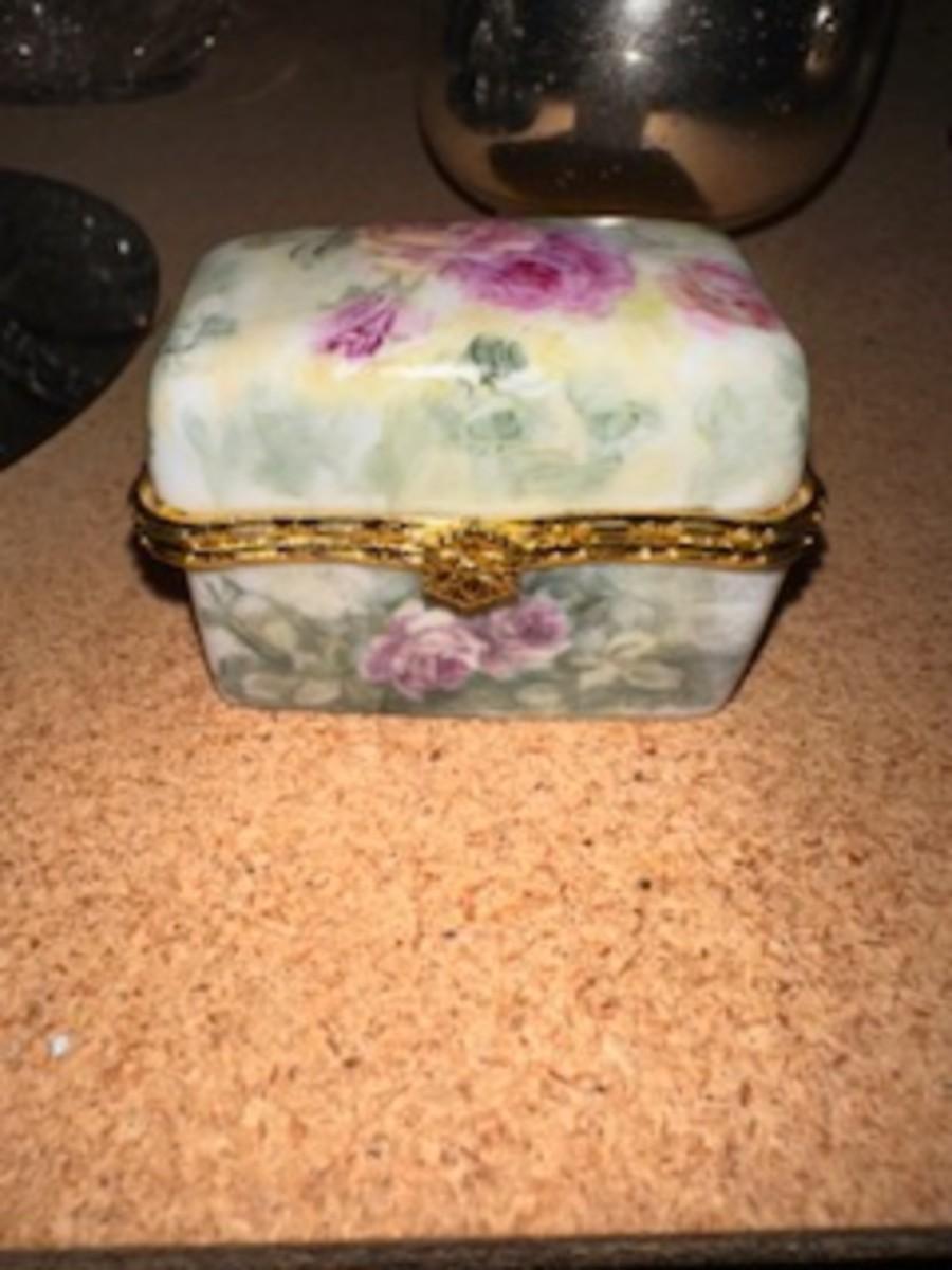 GLASS CHRISTMAS FIGURES, TRINKET BOX AND HAND PAINTED PITCHER