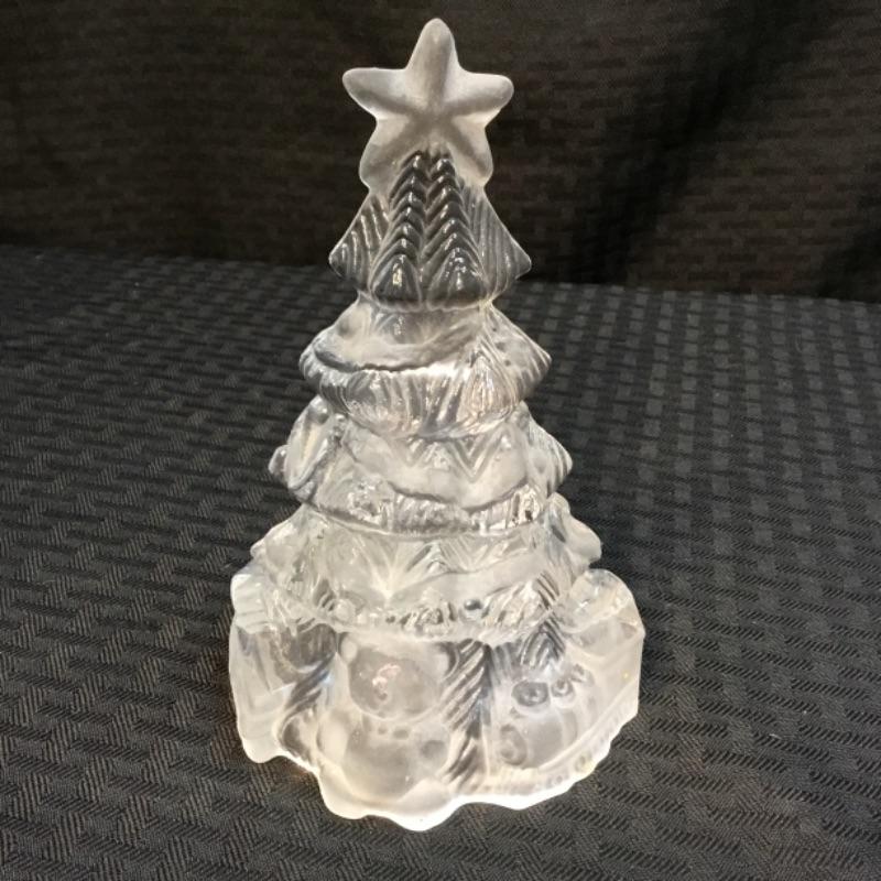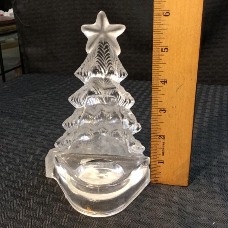 This etched glass Christmas tree votive candle holder is in good used condition. Unmarked on the bottom. Has remnants of wax from old candles, but it’s nothing that can’t be cleaned off; see pictures.