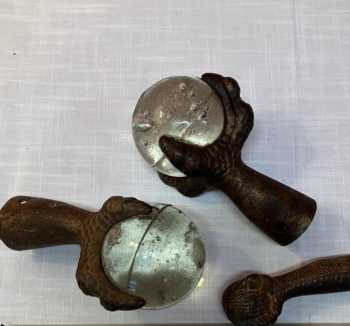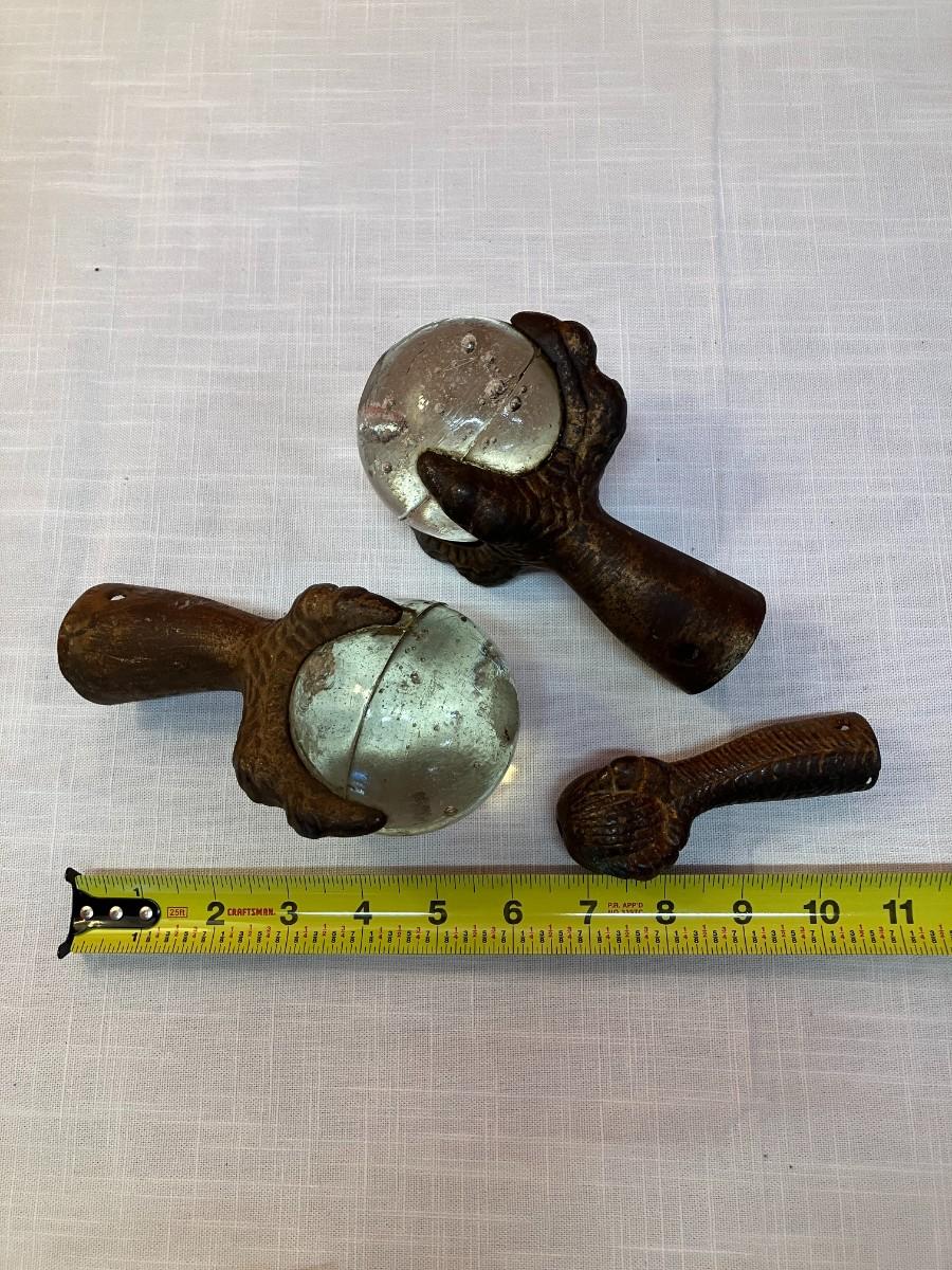 3 Victorian era furniture feet! 2 glass ball/claw style and 1 iron claw/ball. So unique!