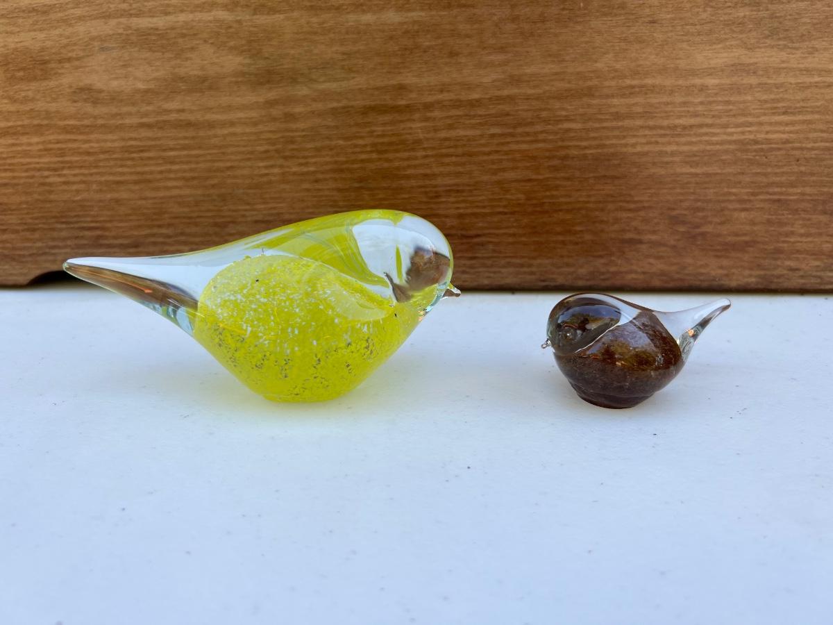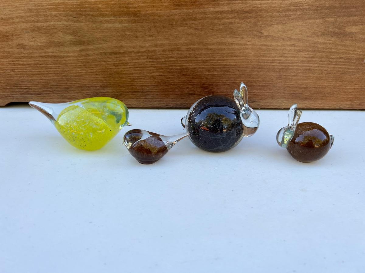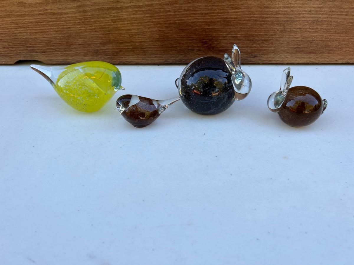 Vintage Small Glass Bunny-Shaped Clear and Brown Paperweight ~3” yellow canary bird and small bird brown and clear.