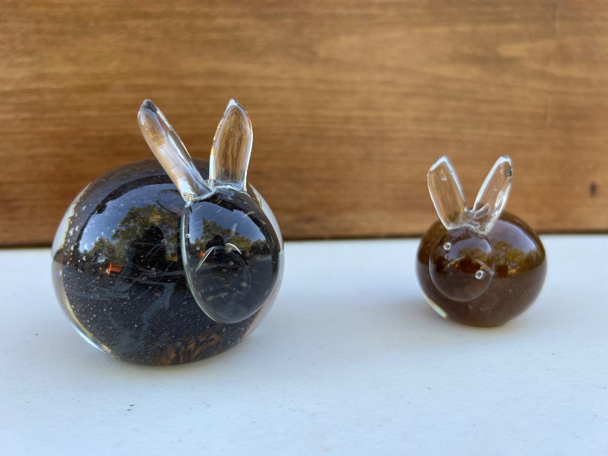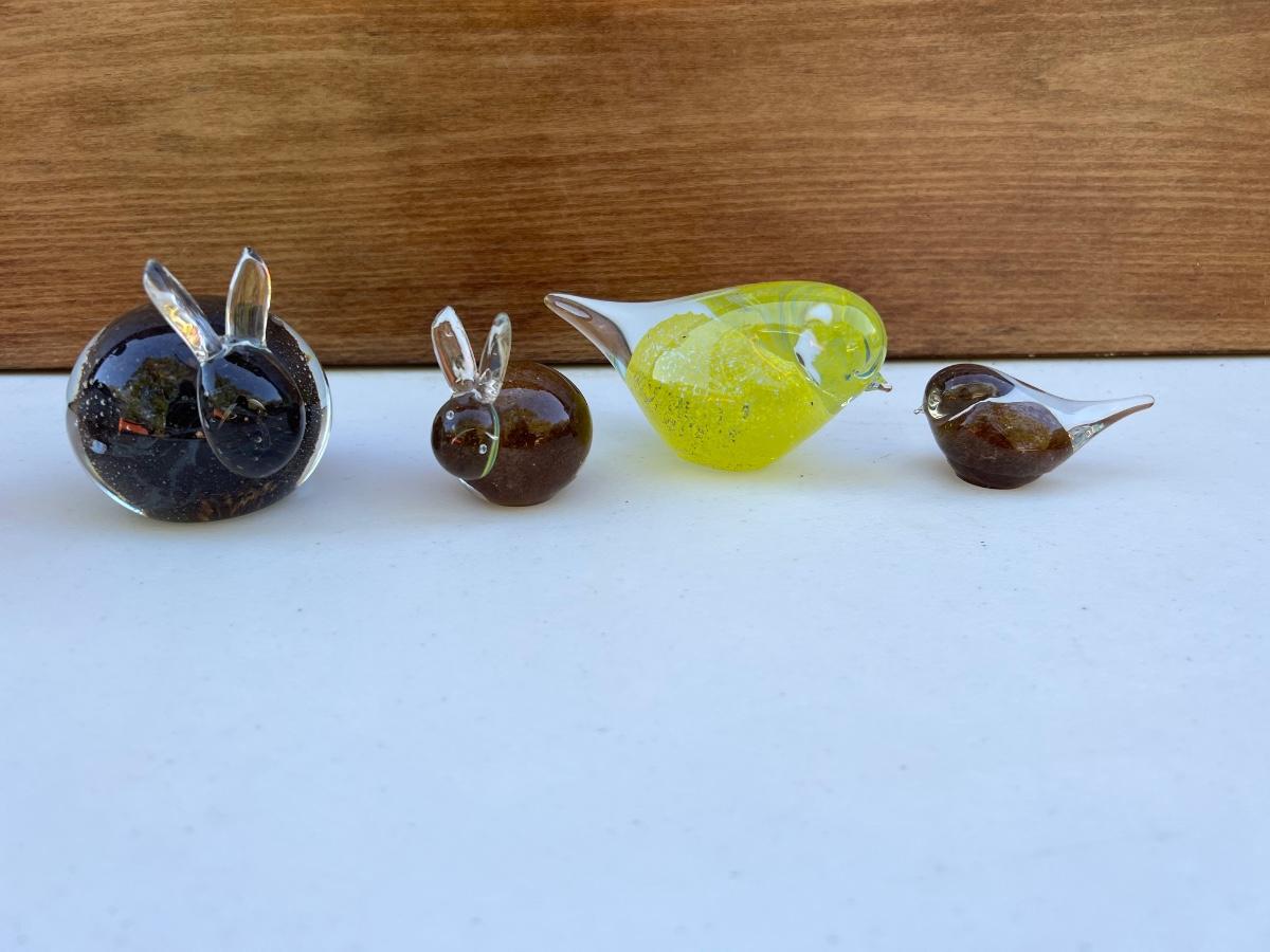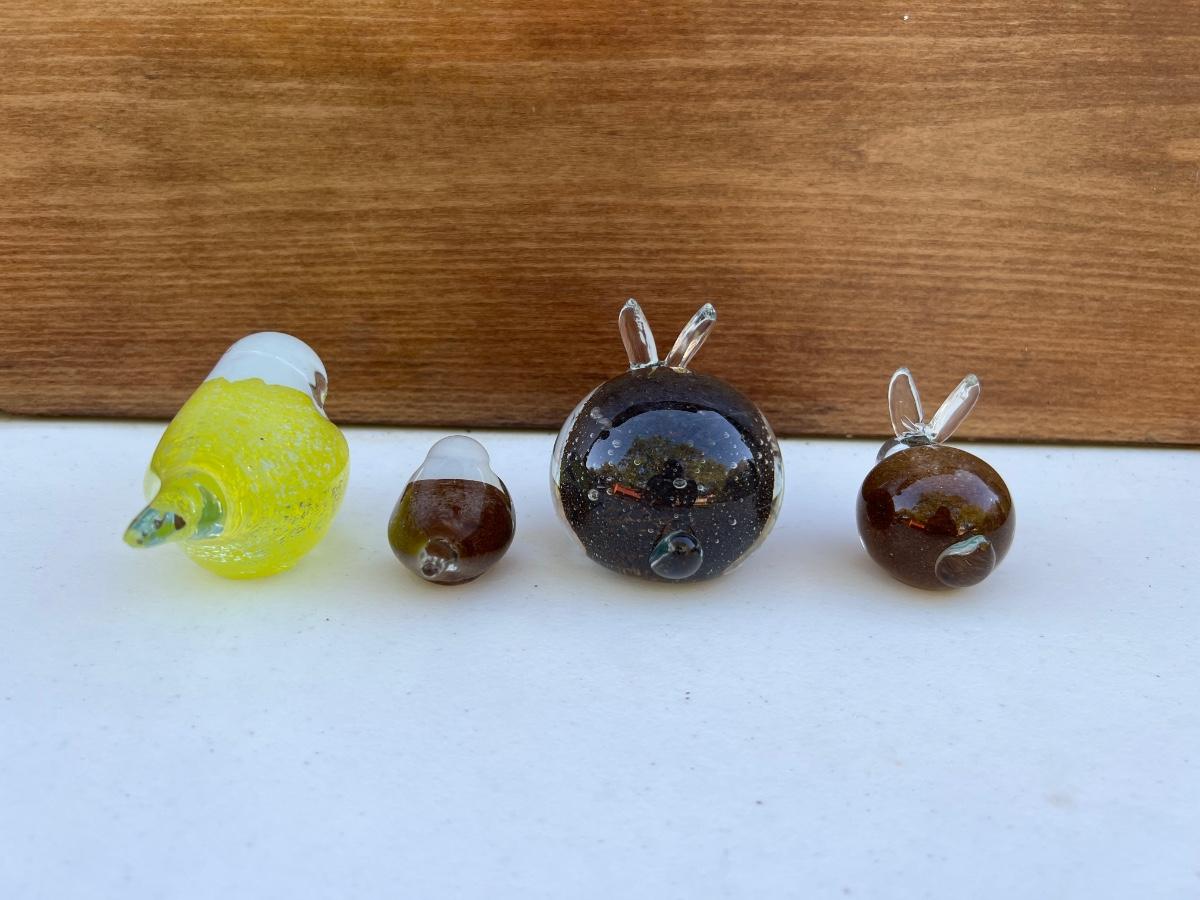 Vintage Small Glass Bunny-Shaped Clear and Brown Paperweight ~3” yellow canary bird and small bird brown and clear.