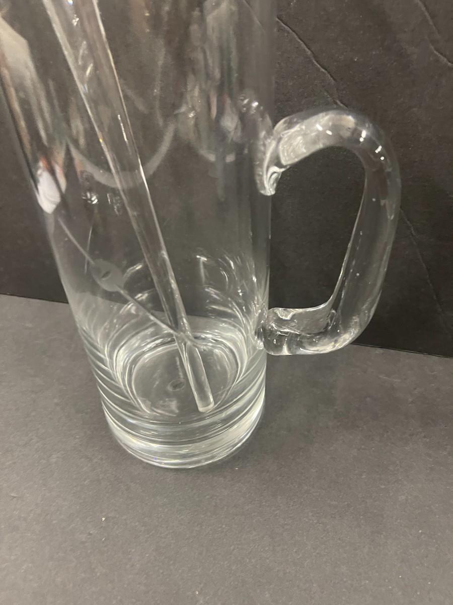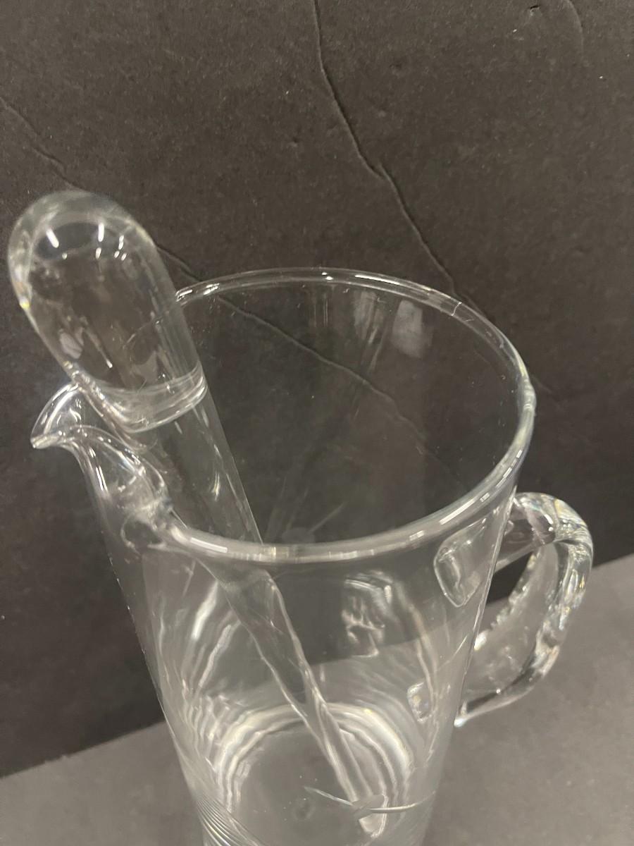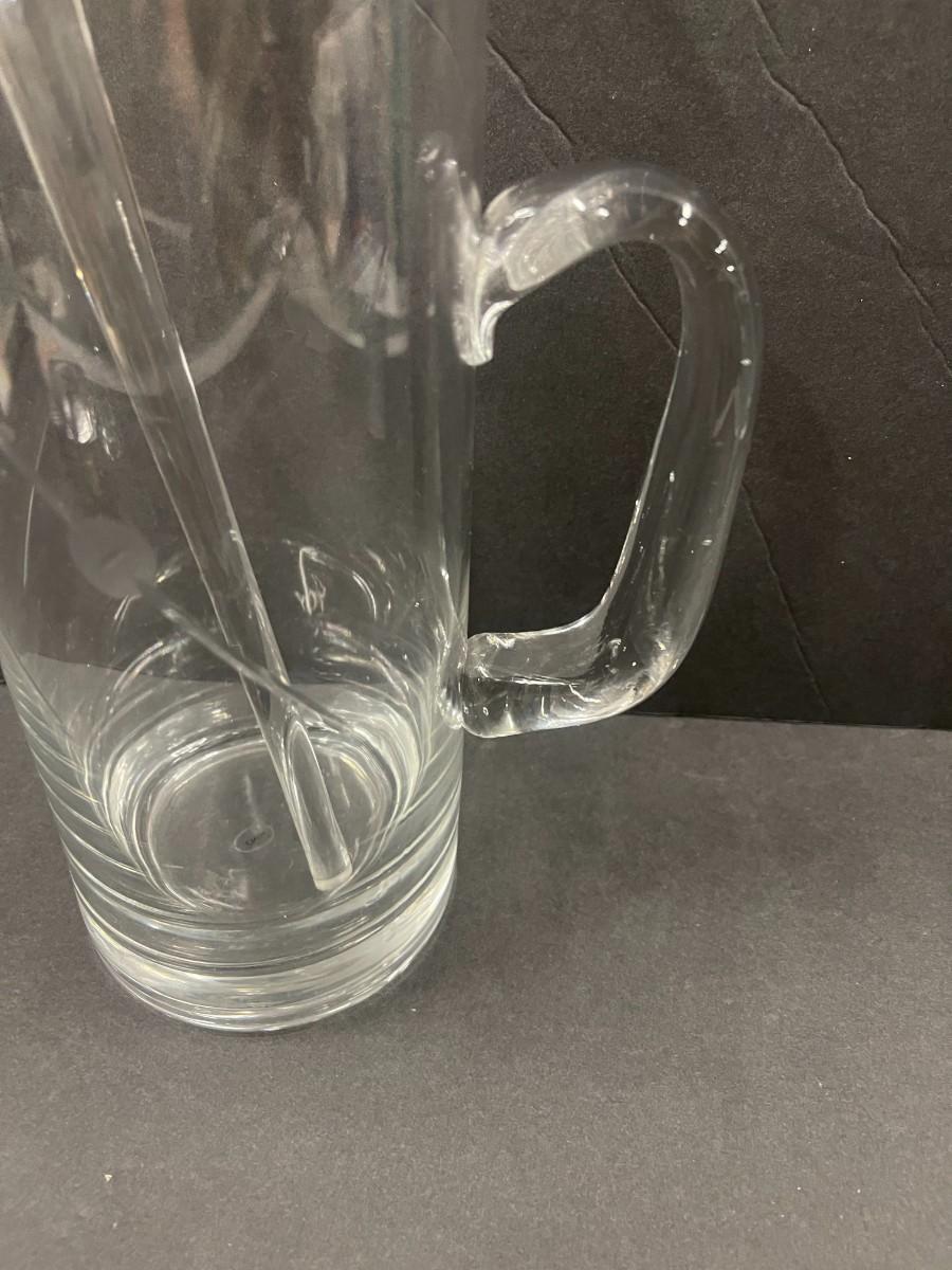 Glass cocktail pitcher with stirrer. Pitcher has etched pattern on it that looks like olives on skewers. Excellent condition.