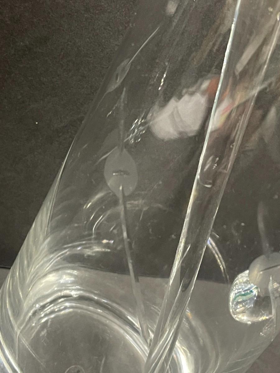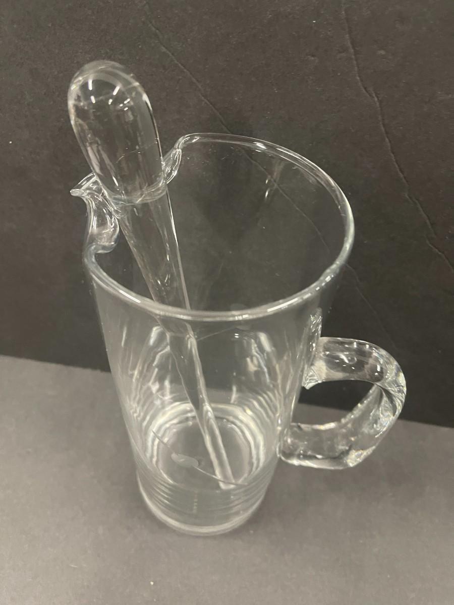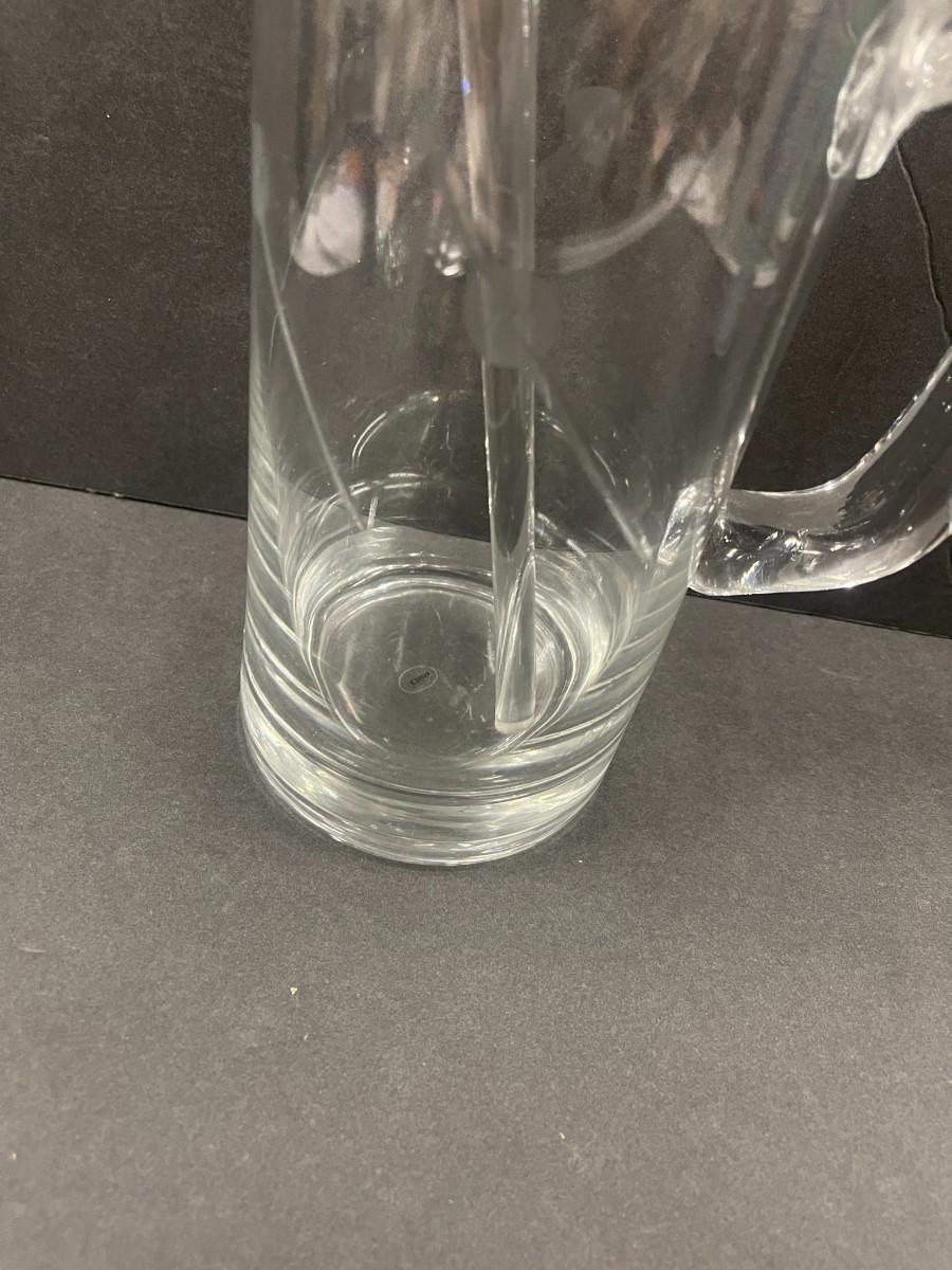 Glass cocktail pitcher with stirrer. Pitcher has etched pattern on it that looks like olives on skewers. Excellent condition.
