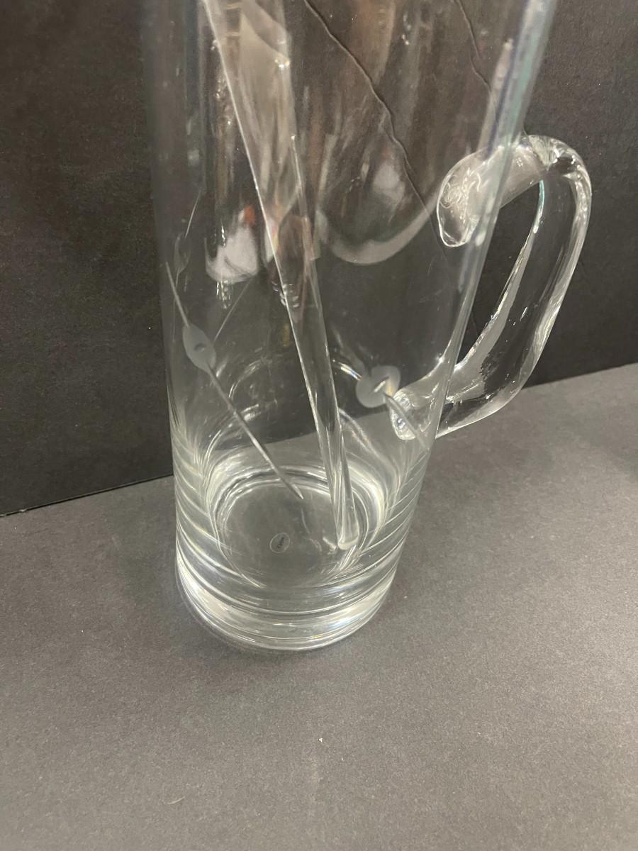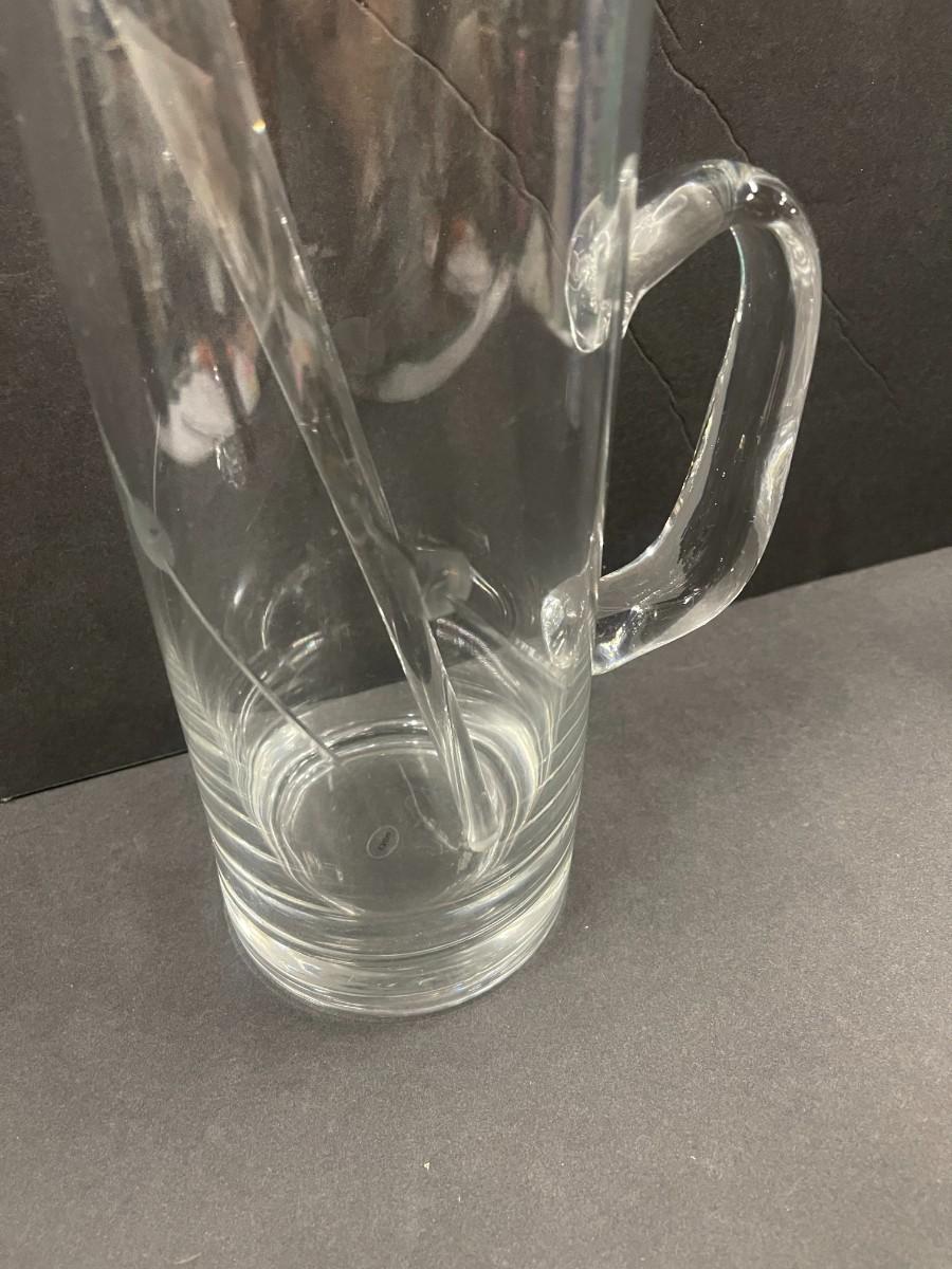 Glass cocktail pitcher with stirrer. Pitcher has etched pattern on it that looks like olives on skewers. Excellent condition.