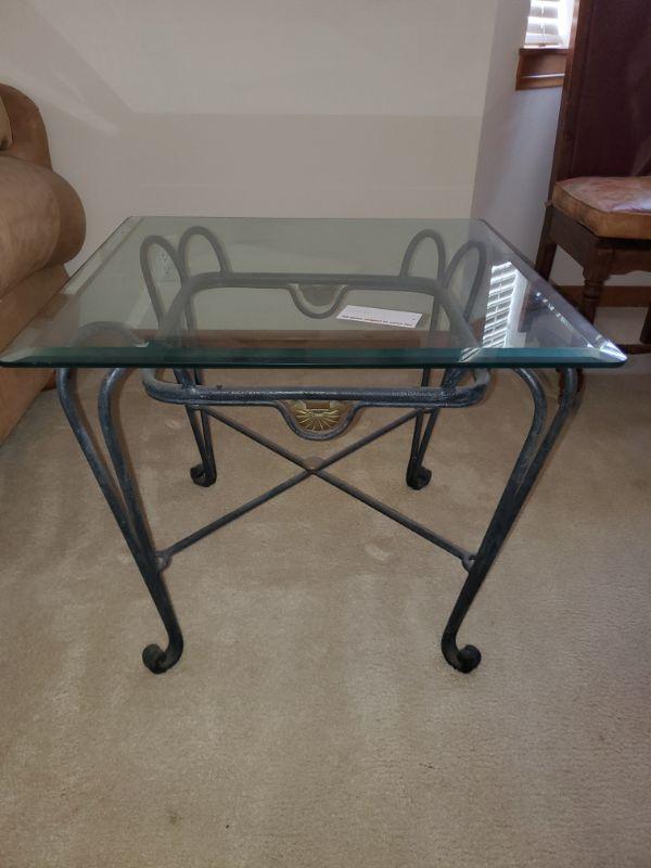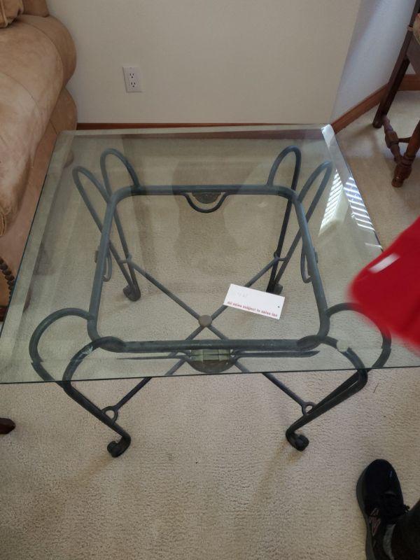 Glass coffee table stands at about 2.5 feet tall, has iron legs and has minimal ware.