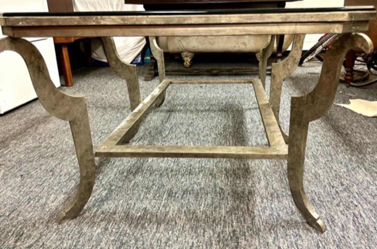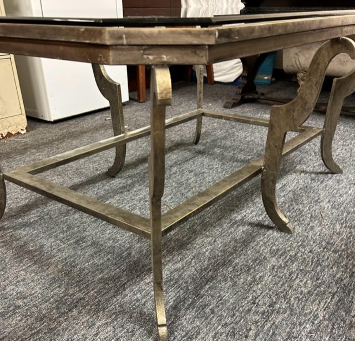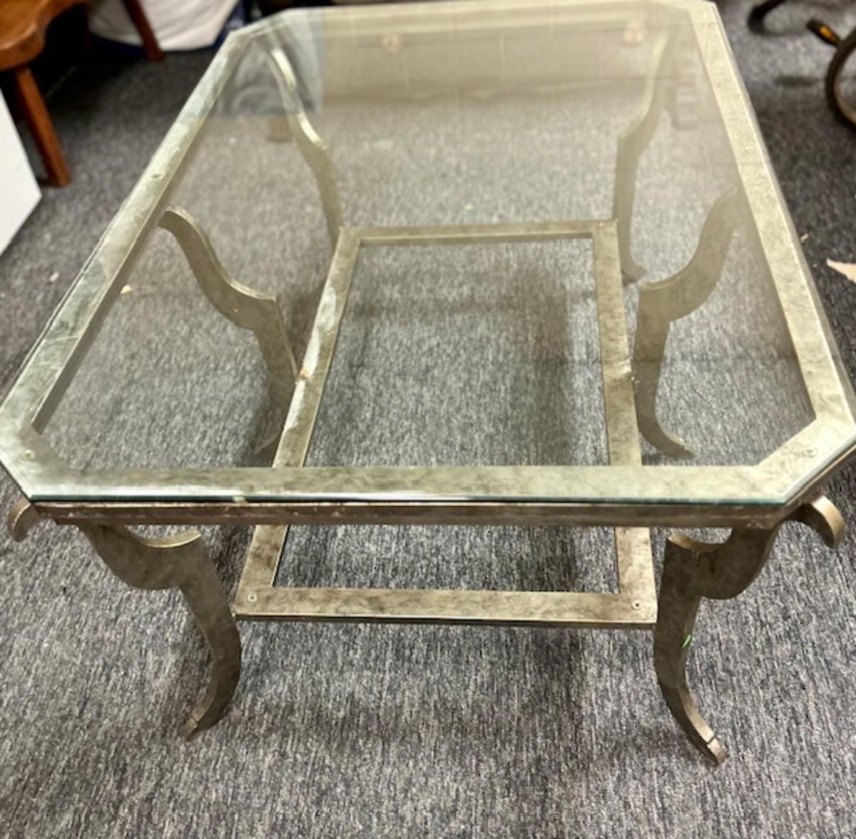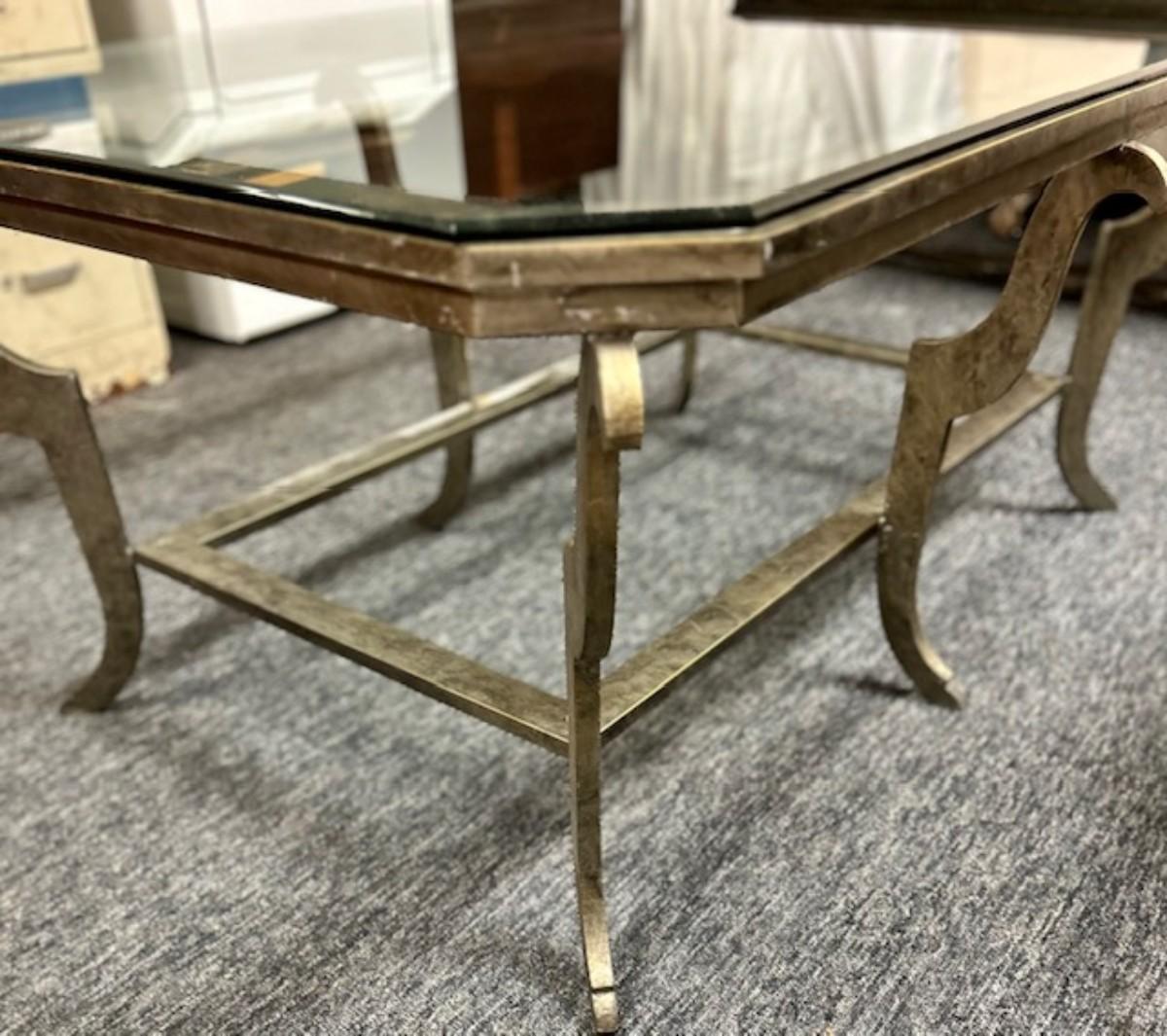 Large champagne colored heavy metal base with half inch beveled glass top. Good condition, consistent with age and use. Some minor scratching on the glass but could be easily covered with coffee table accessories like trays and books. Glass could be added to bottom of the table to create a second shelf.
