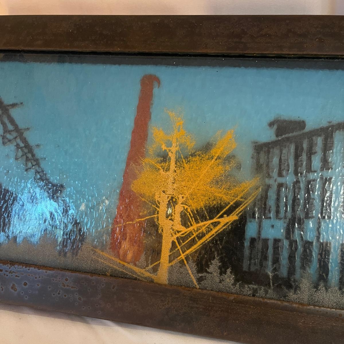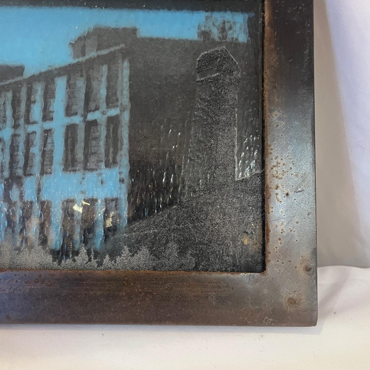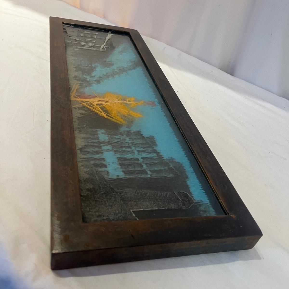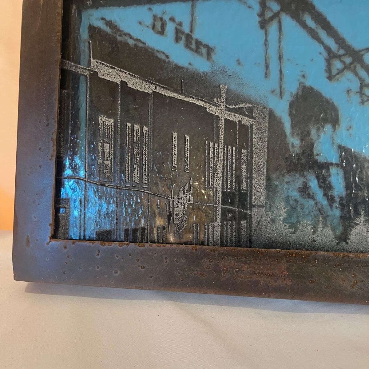 Mixed media style artwork that is photography on glass with etching. Piece is framed in an iron frame. Ple see pictures for details. Frame measures 22.5” x 8”H.