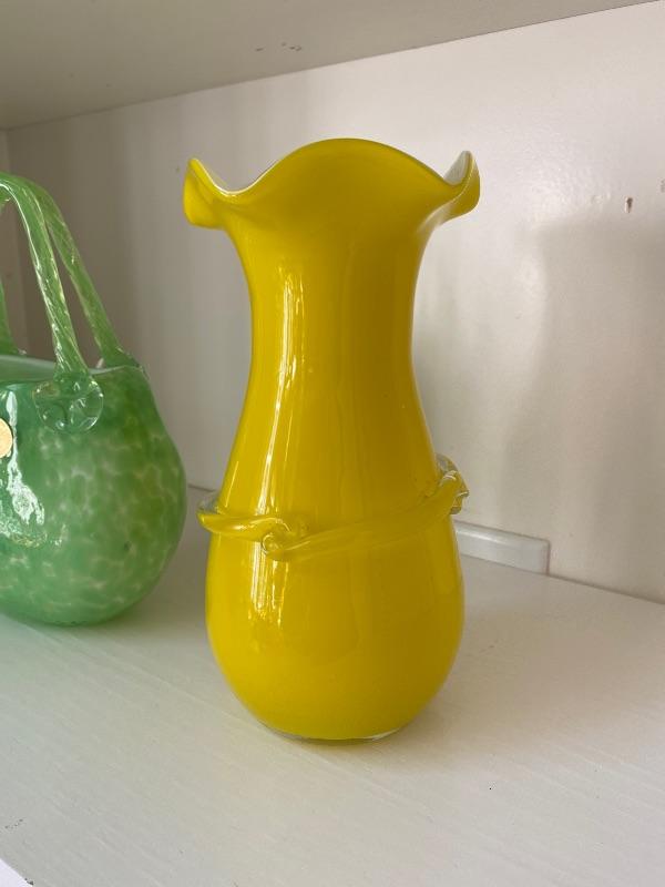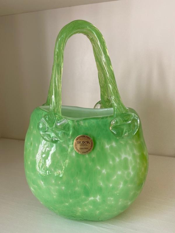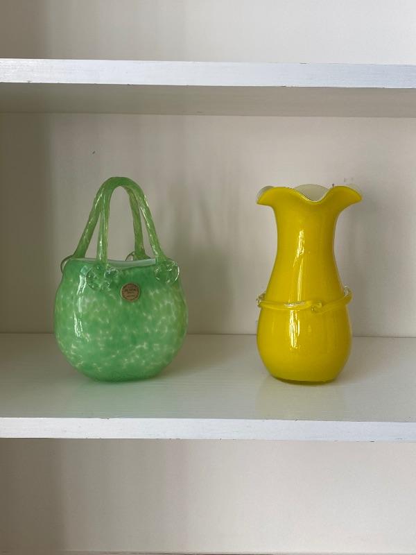 Hand Blown Glass Collectables / Green Purse & Yellow Vase