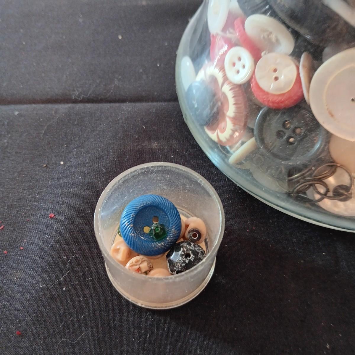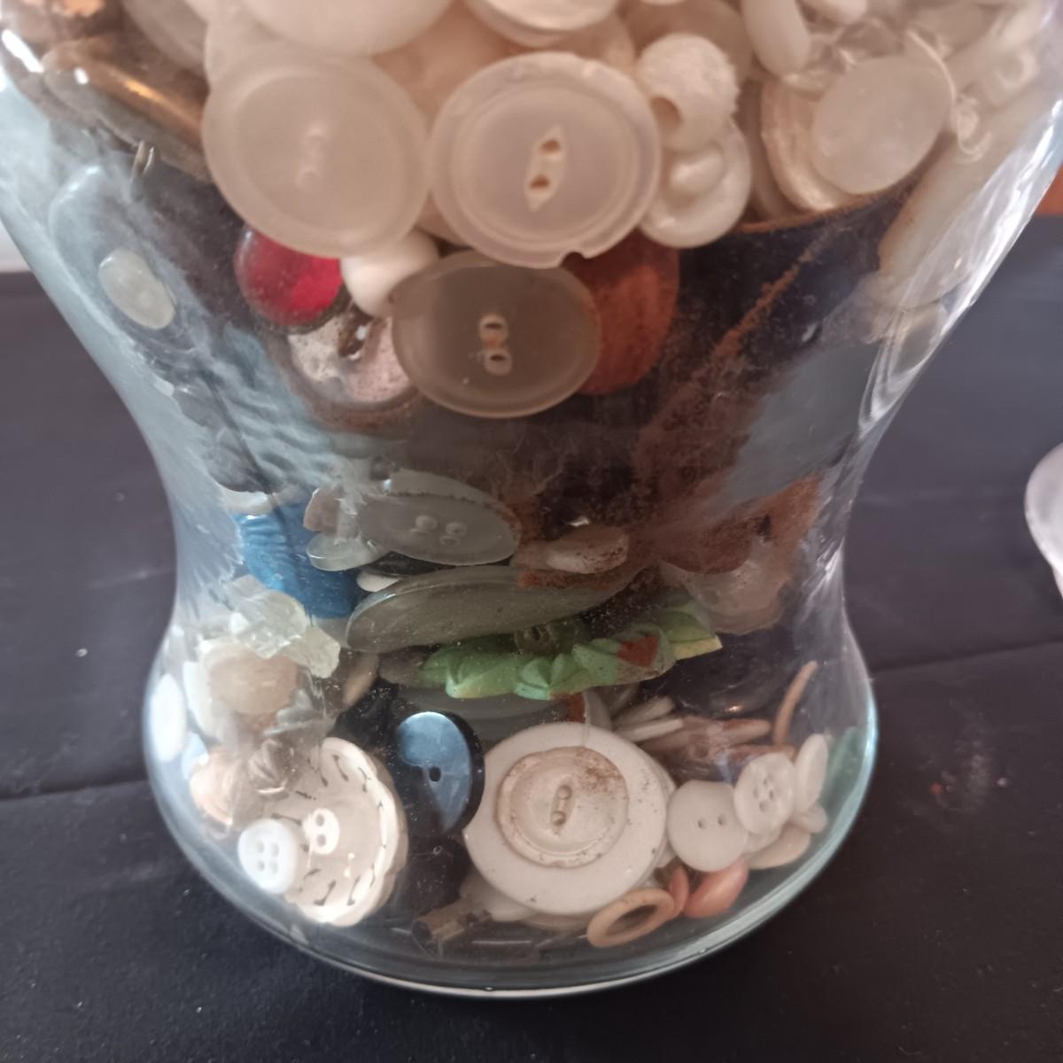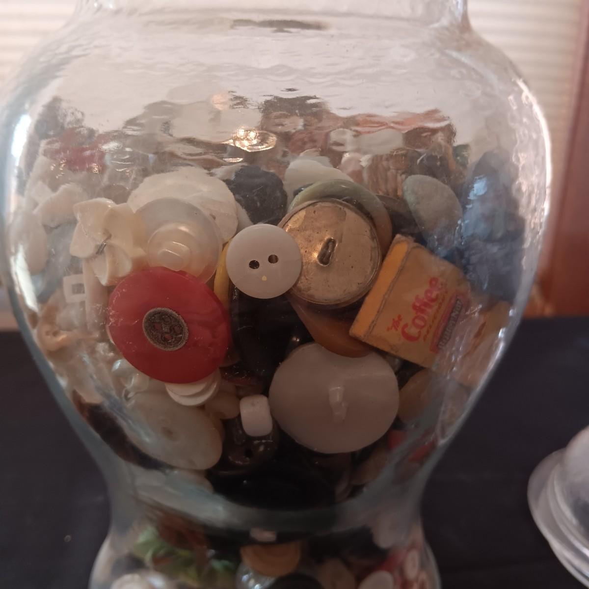 GLASS CONTAINER FILLED WITH A VARIETY OF BUTTONS