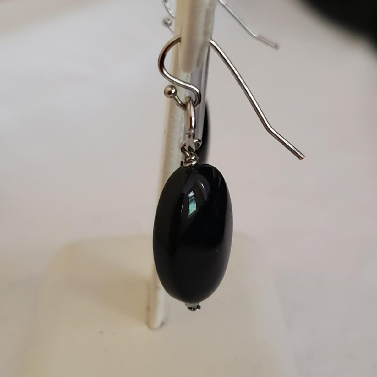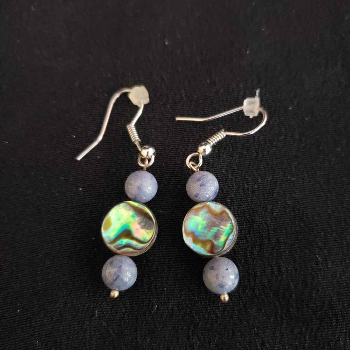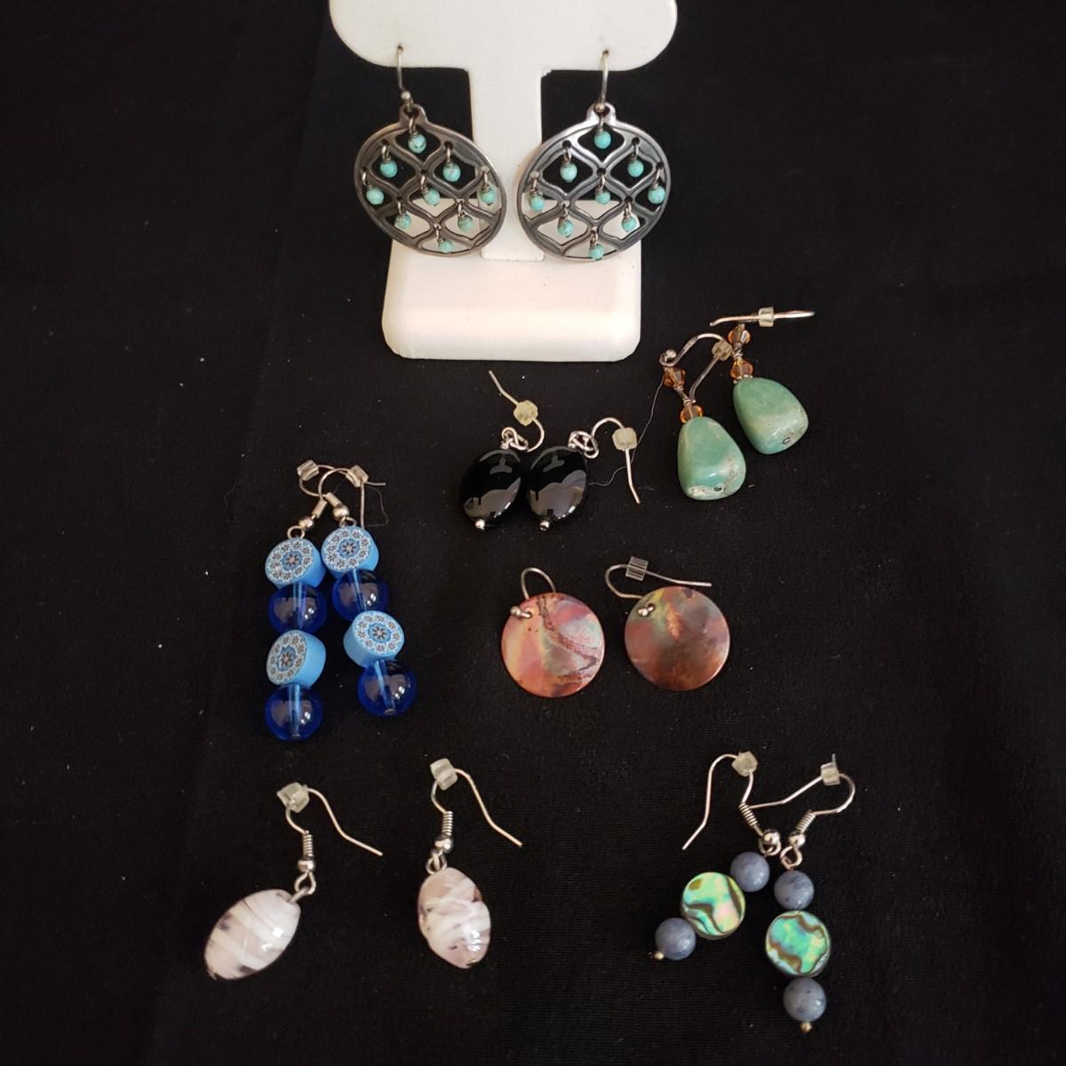 This lot contains seven pairs of earring and a bag of backings. The what appears to be glass, pink and white earrings measure .5". The Abalone and a blue stone earrings measure 1". The blue polymer and glass earrings measure 1.5". The silver like earrings have dangling turquoise balls and measure approximately 1". The green stone and amber colored beads measure 1.5". The circle copper earrings have a multicolored hue to them. The last pair are black and shiny and its hard to tell if its a hard stone or hard plastic.