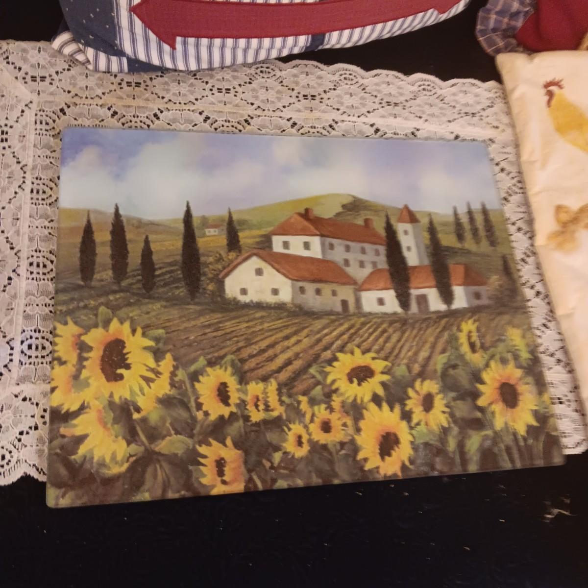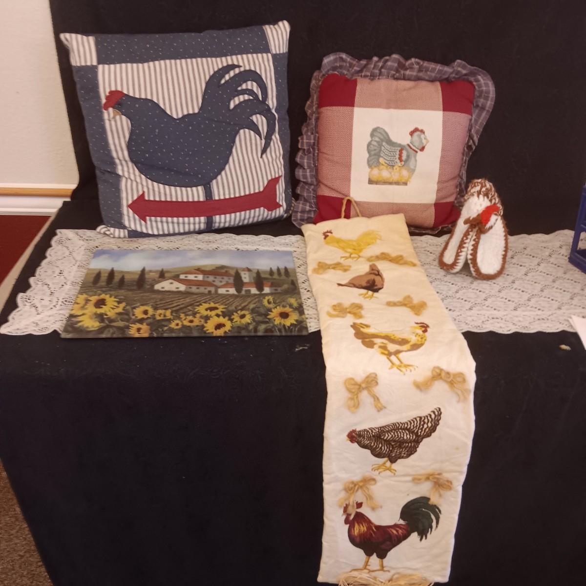 GLASS CUTTING BOARD, THROW PILLOWS, WALL HANGING AND POT HOLDER