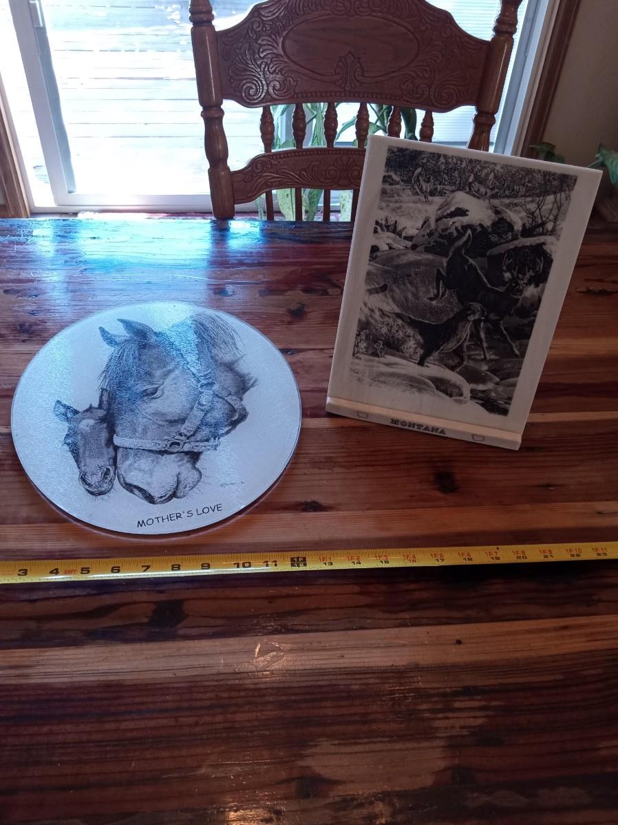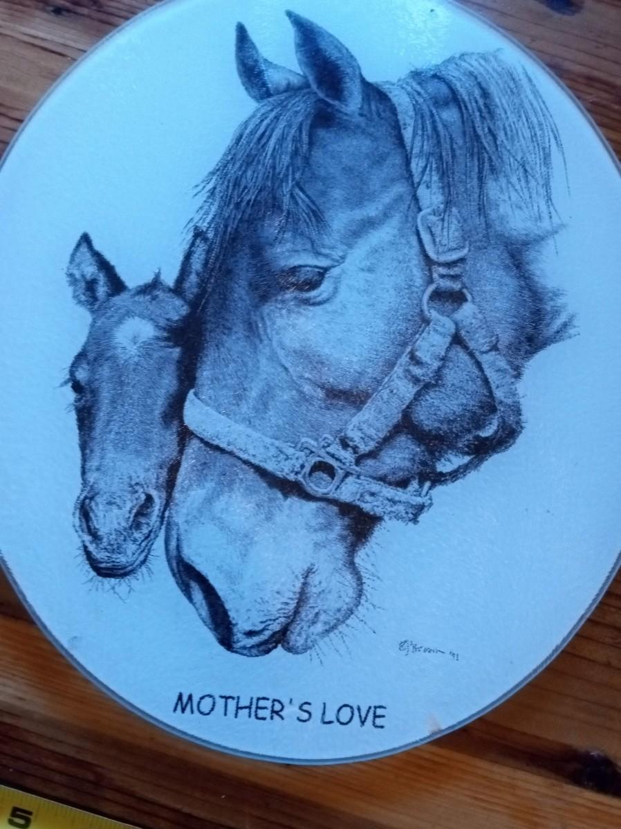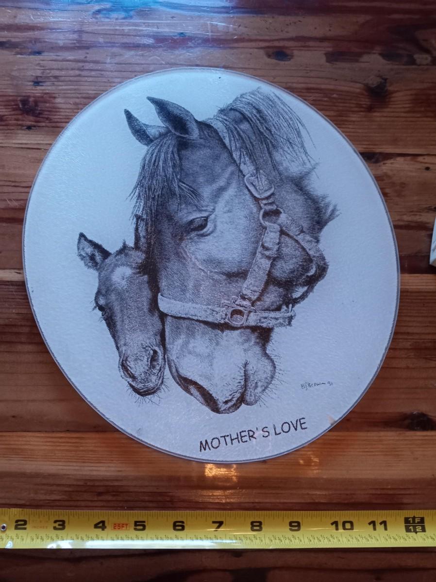 GLASS CUTTING BOARD WITH HORSE AND FOAL, SCRIMSHAW LIKE WILDLIFE PICTURE