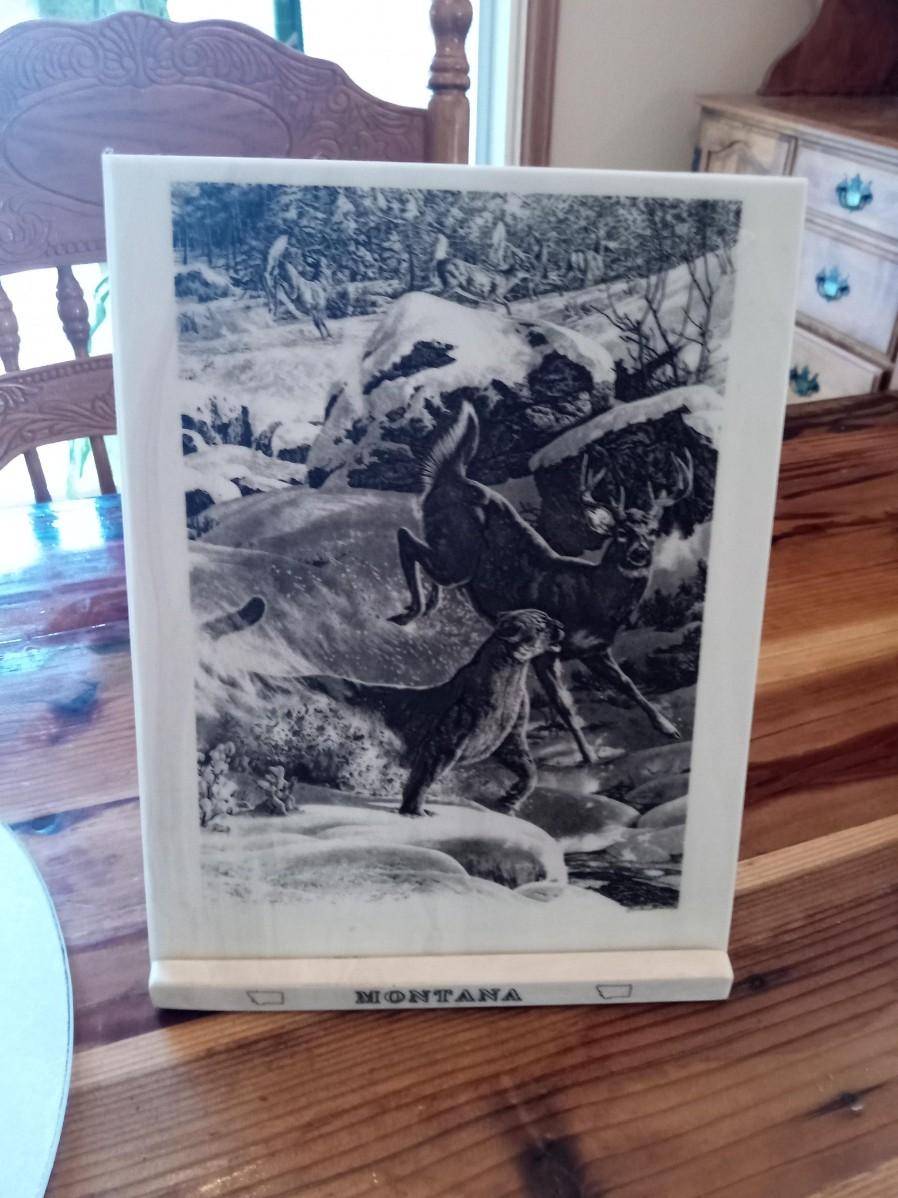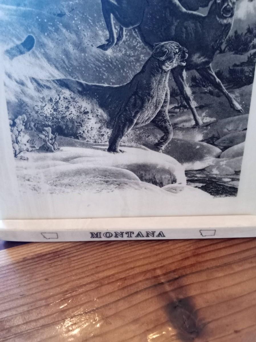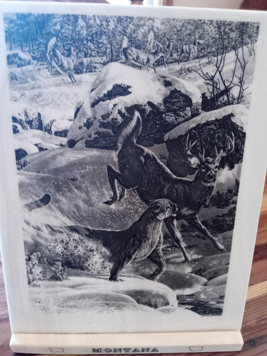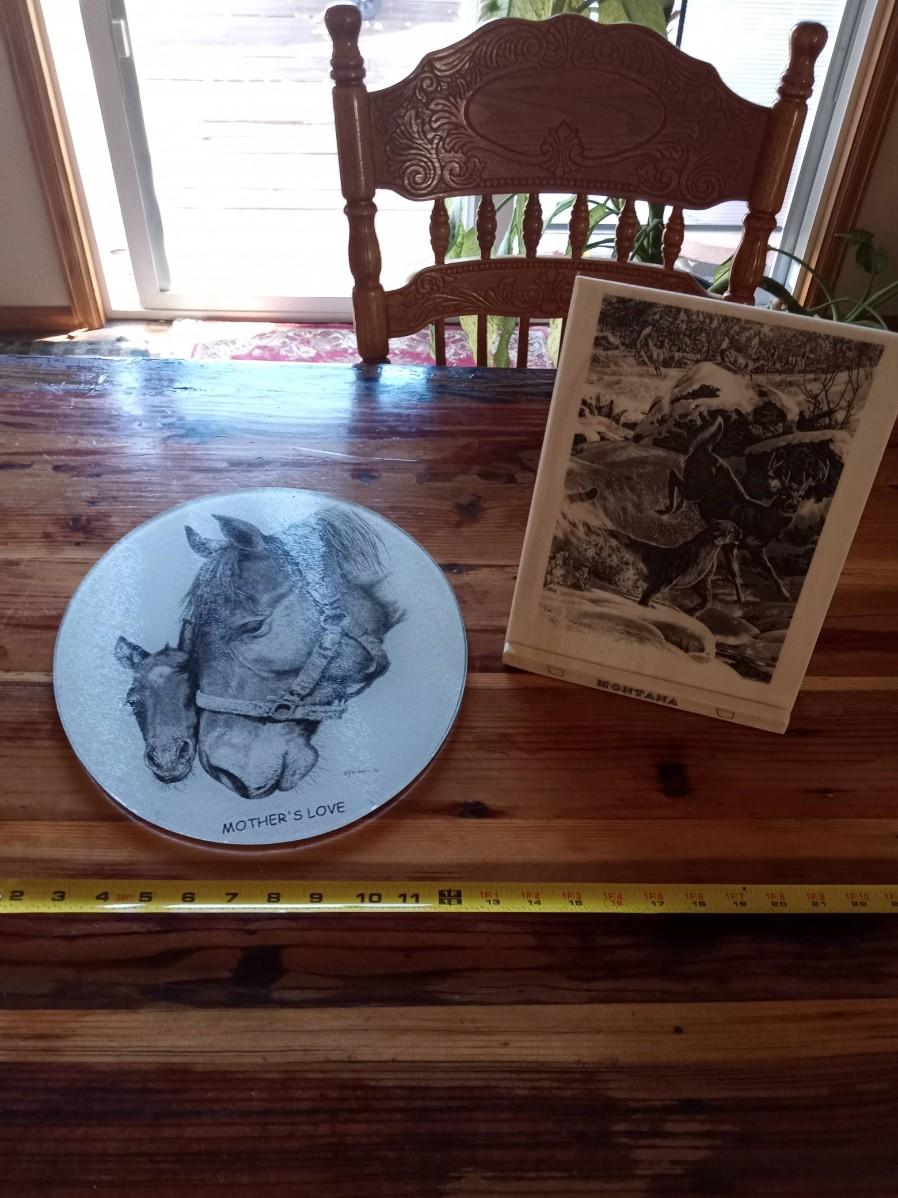 GLASS CUTTING BOARD WITH HORSE AND FOAL, SCRIMSHAW LIKE WILDLIFE PICTURE