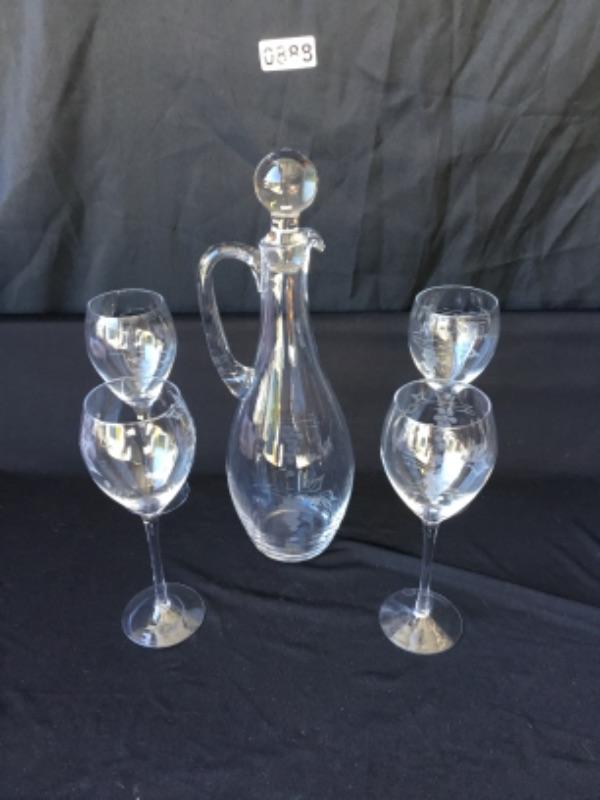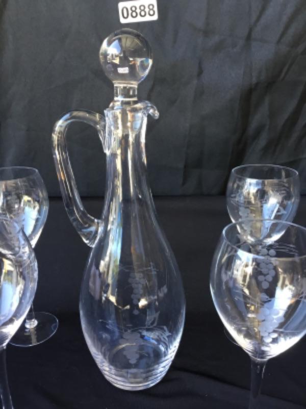 Glass decanter and 4 stemmed glasses Lot 888 J
