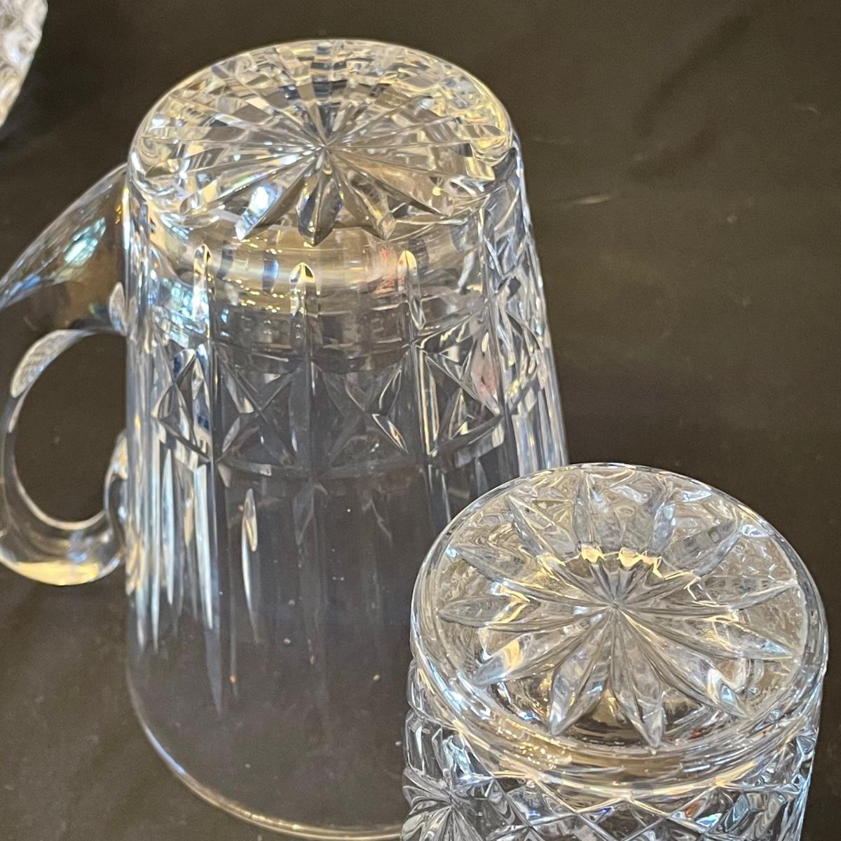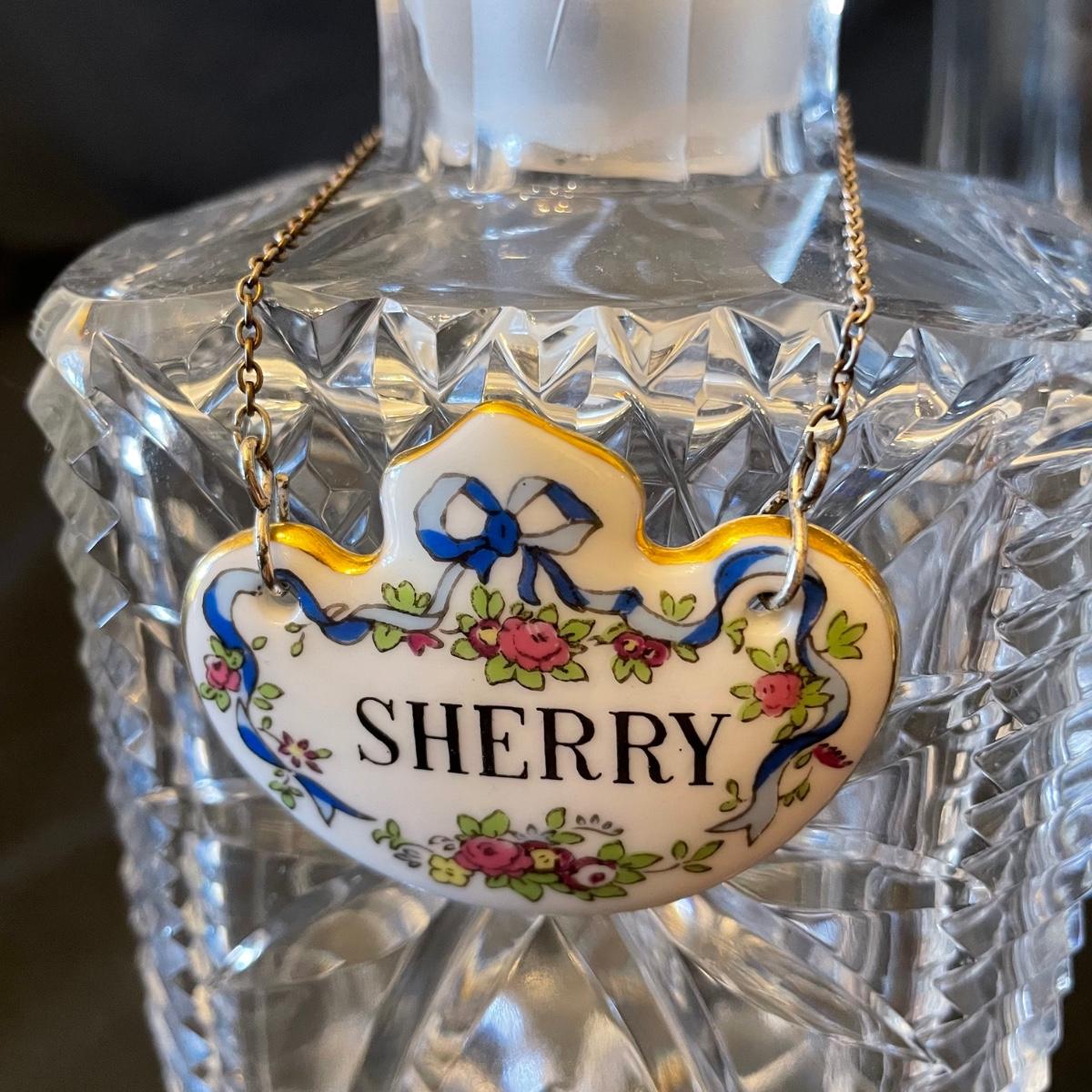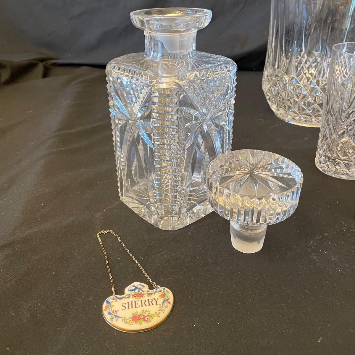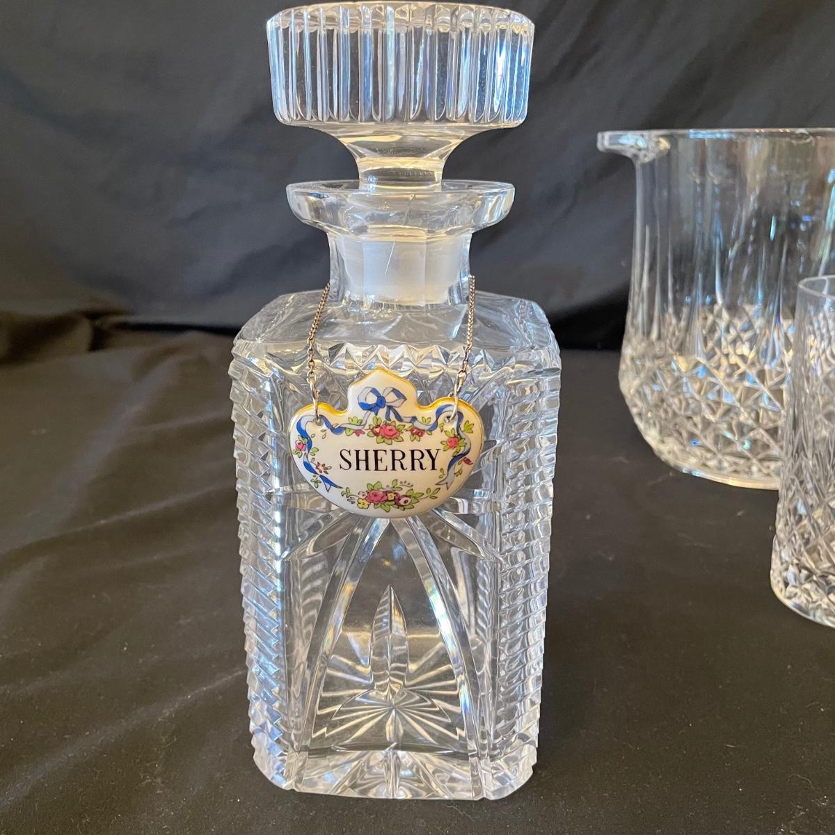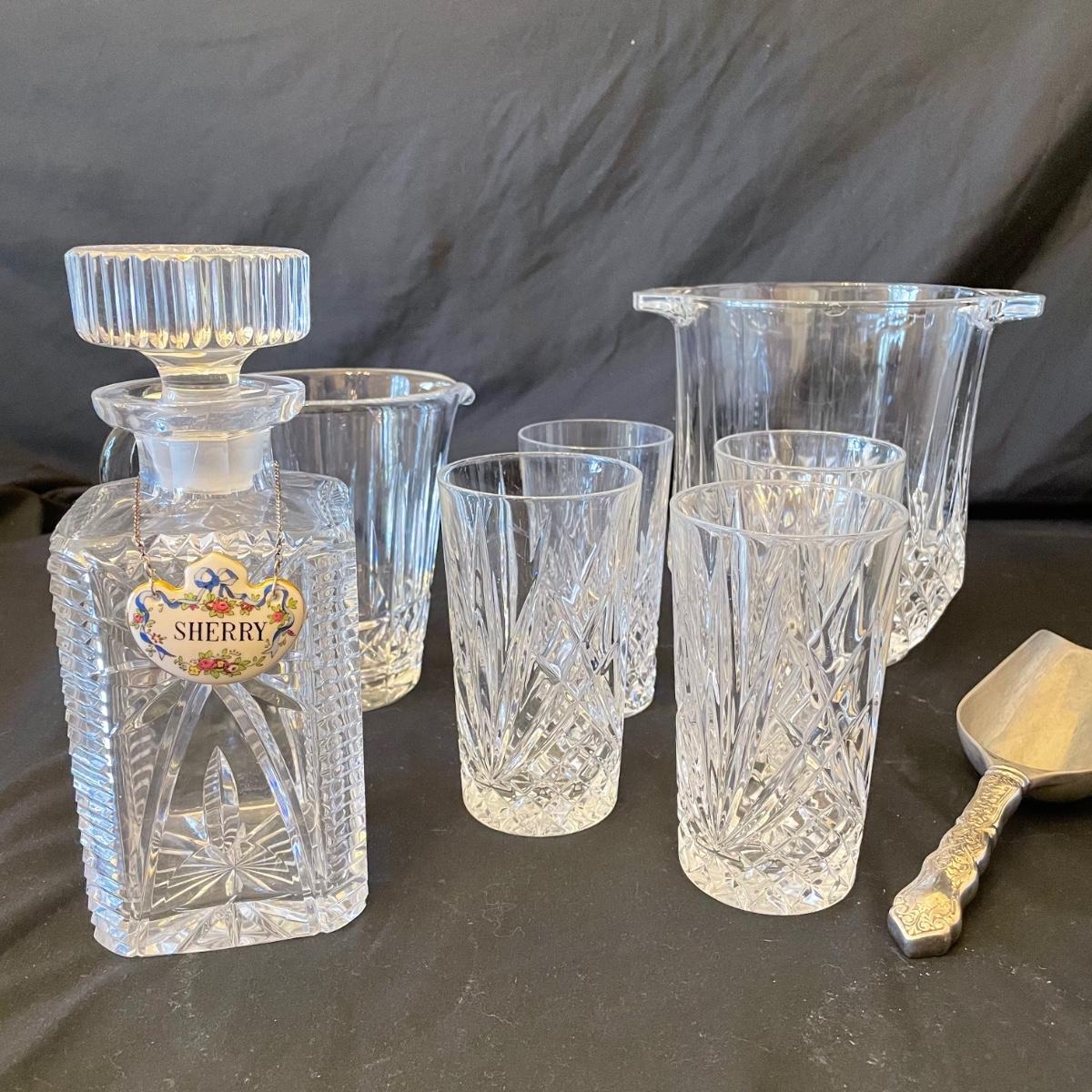 This glass lot includes a decanter, ice bucket (has 1 small chip in its rim), pitcher and four tumblers (three are matching, the fourth is very similar) and a silver-plate ice scoop. The Sherry label hanging on the decanter is fine China and made by Staffordshire..
