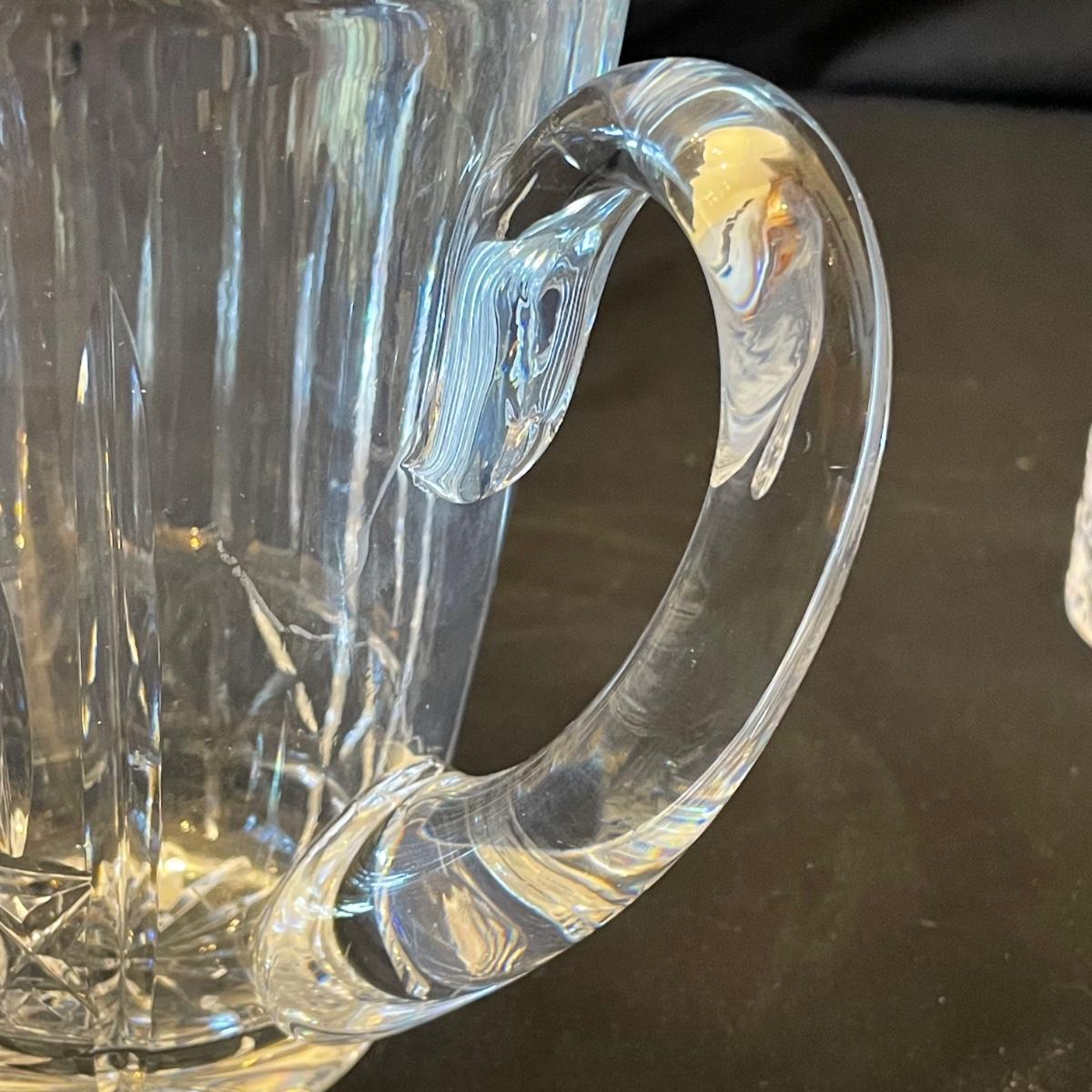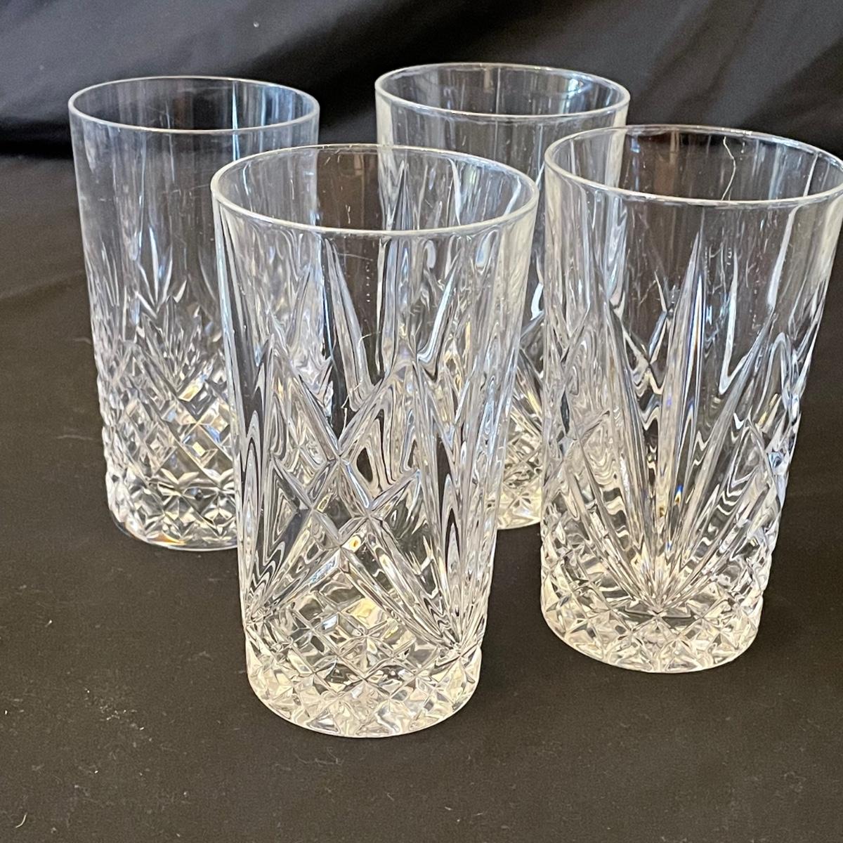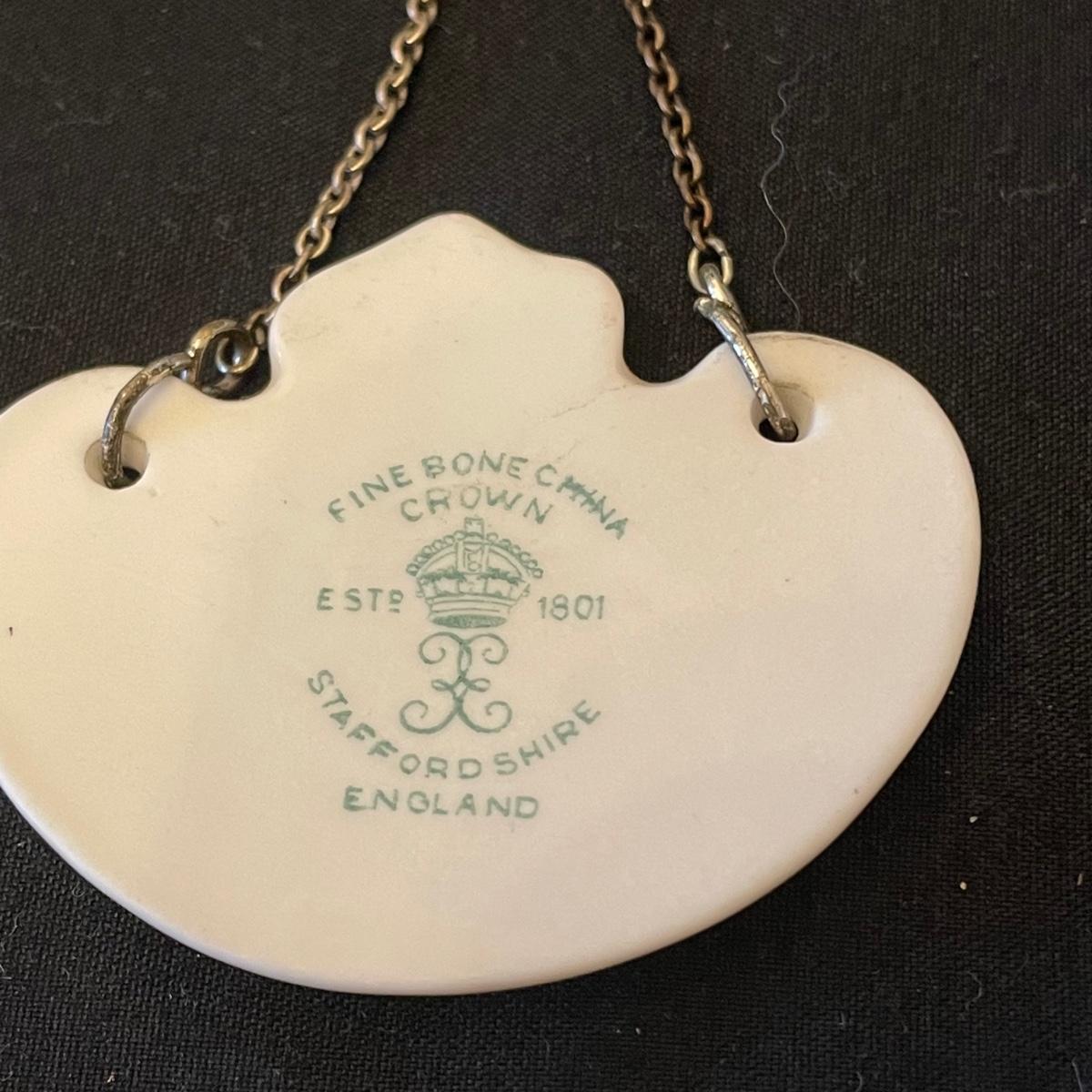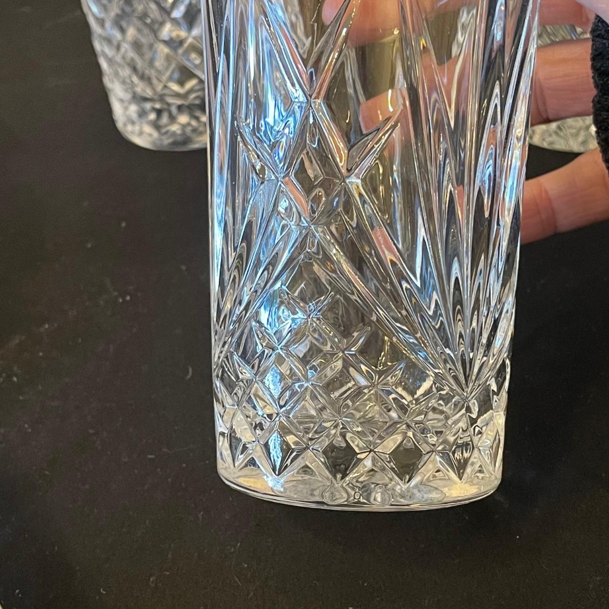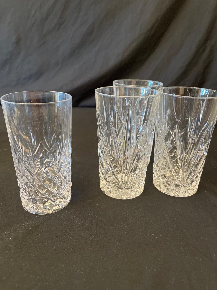 This glass lot includes a decanter, ice bucket (has 1 small chip in its rim), pitcher and four tumblers (three are matching, the fourth is very similar) and a silver-plate ice scoop. The Sherry label hanging on the decanter is fine China and made by Staffordshire..