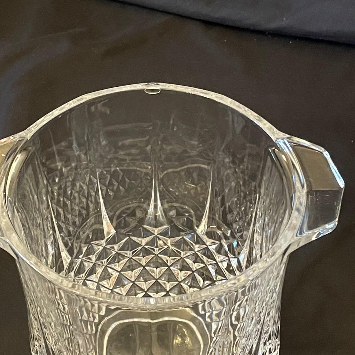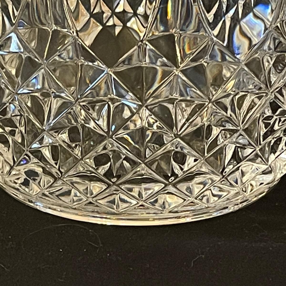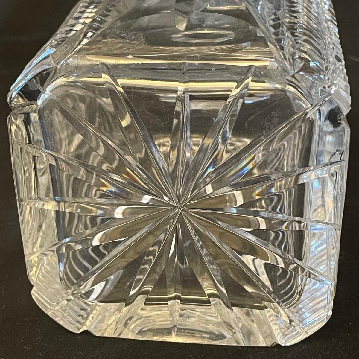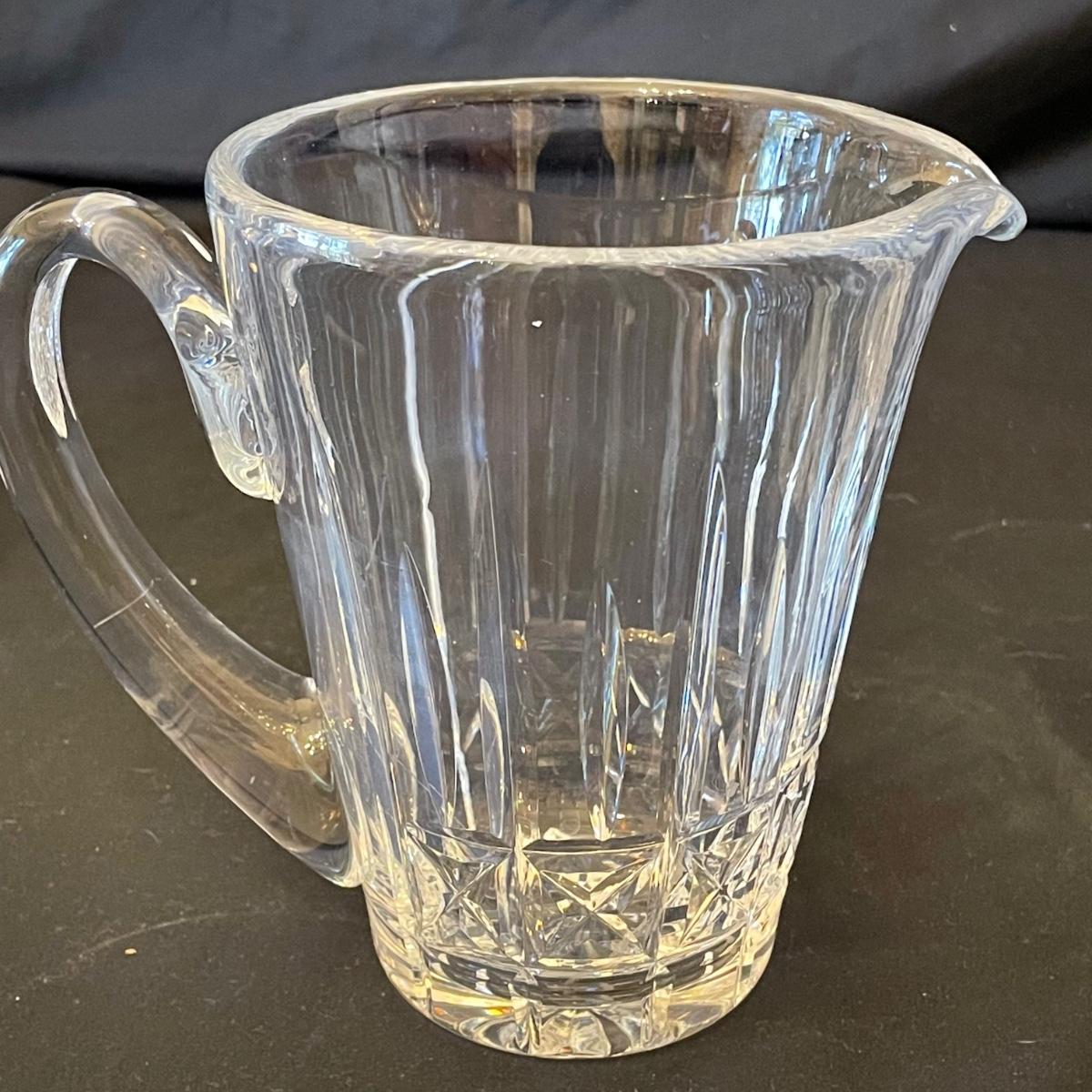 This glass lot includes a decanter, ice bucket (has 1 small chip in its rim), pitcher and four tumblers (three are matching, the fourth is very similar) and a silver-plate ice scoop. The Sherry label hanging on the decanter is fine China and made by Staffordshire..