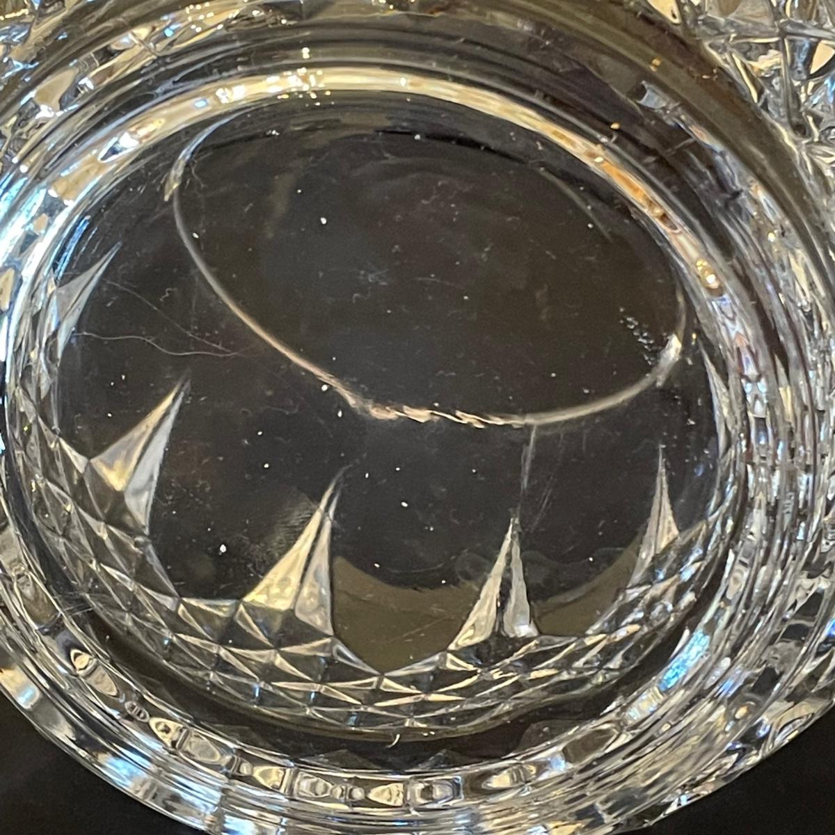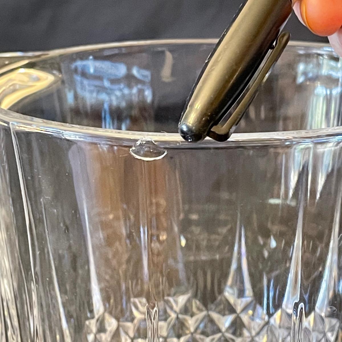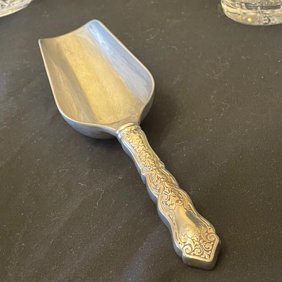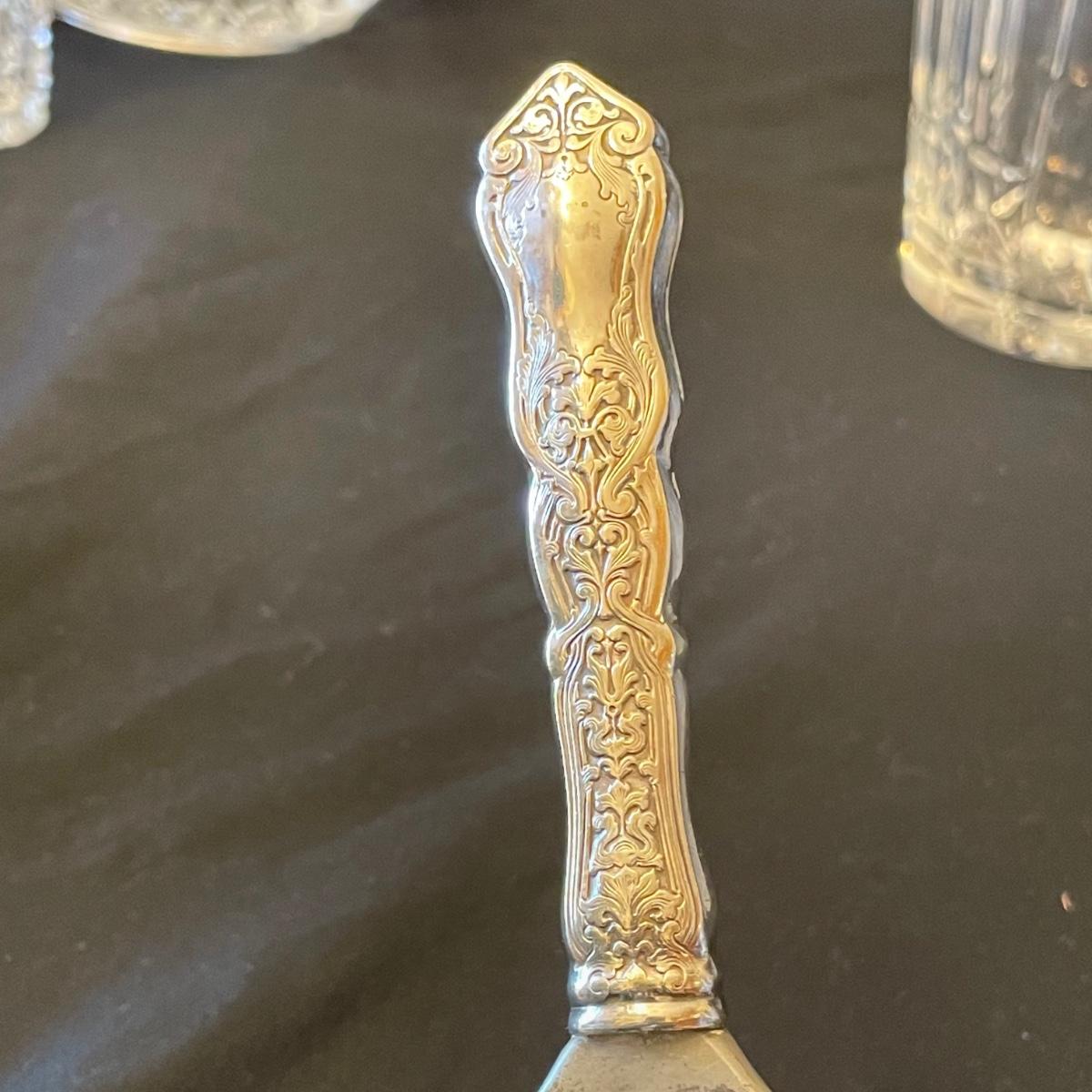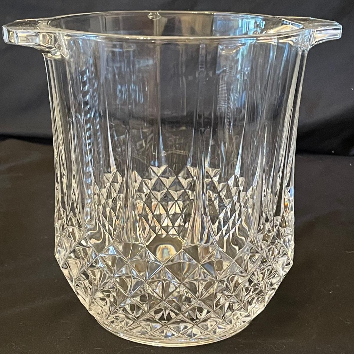This glass lot includes a decanter, ice bucket (has 1 small chip in its rim), pitcher and four tumblers (three are matching, the fourth is very similar) and a silver-plate ice scoop. The Sherry label hanging on the decanter is fine China and made by Staffordshire..