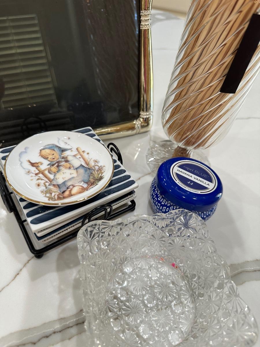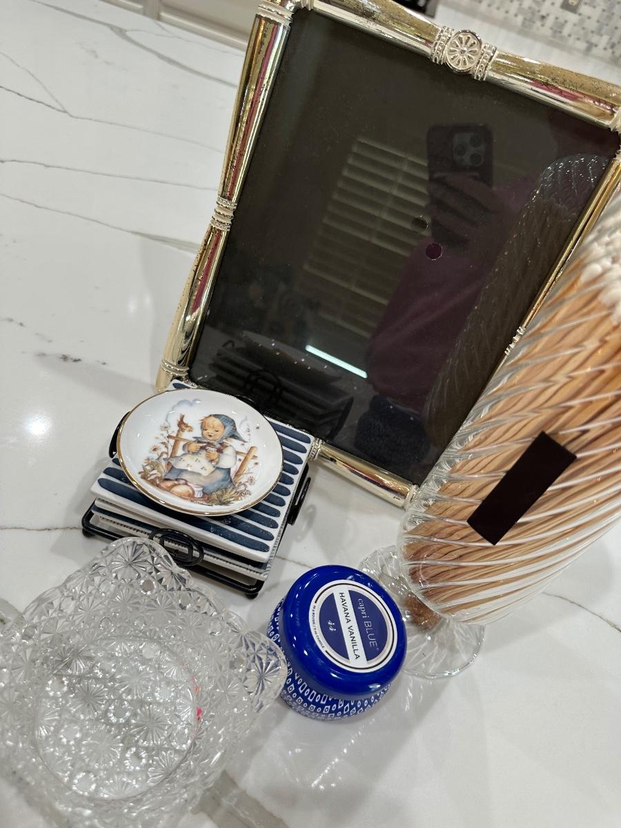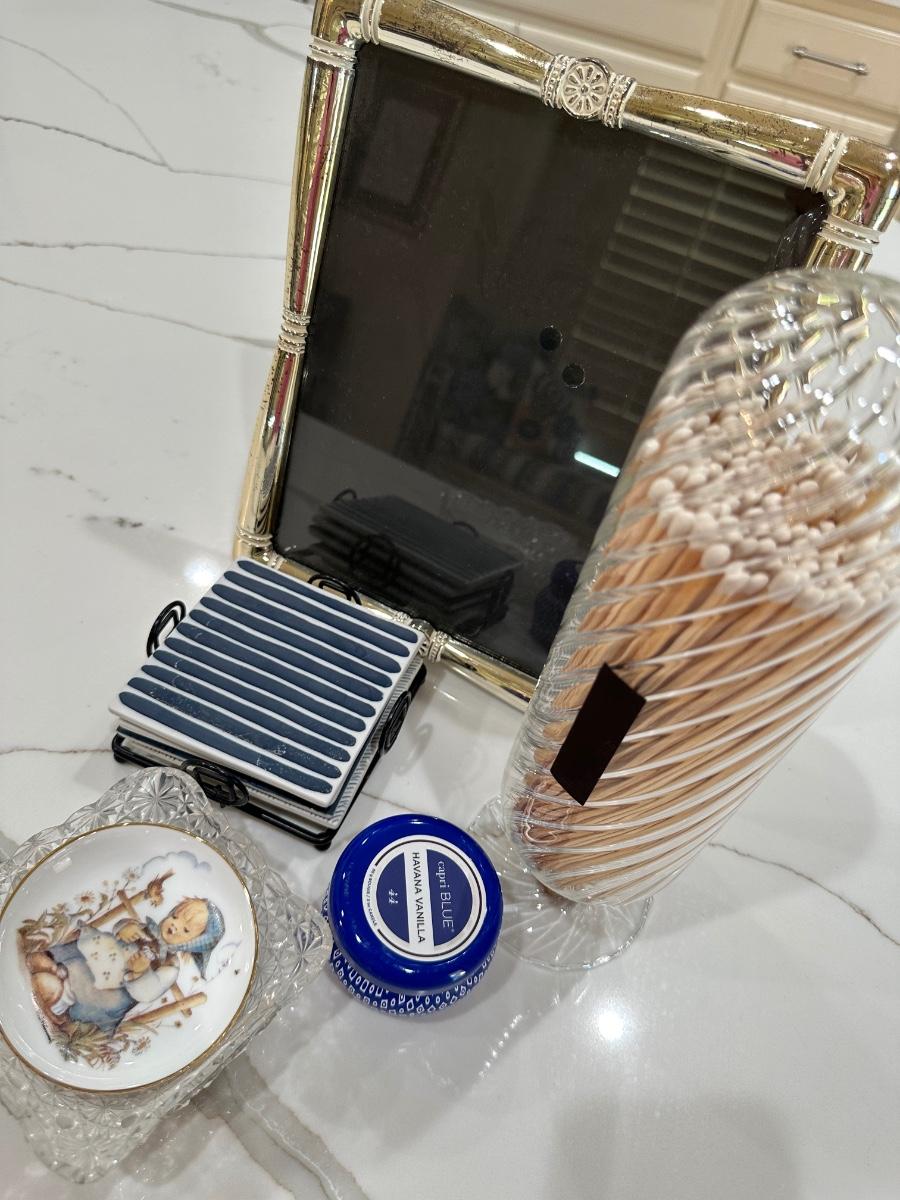 Glass decor Frames and more including Match Cloche, Capri blue candle