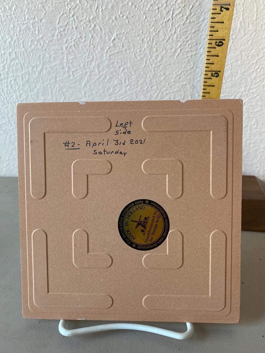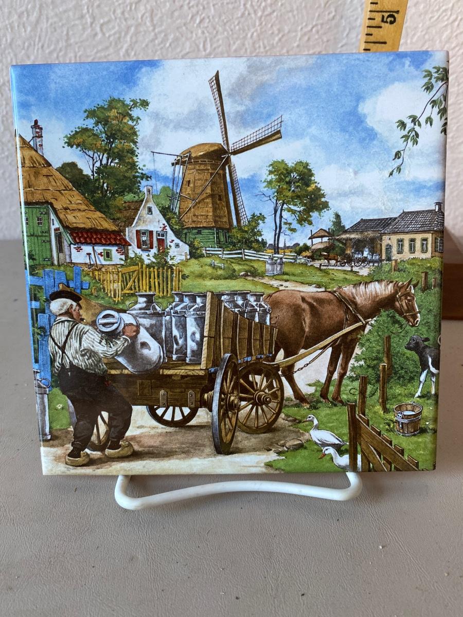 Glass decorative tile with a gentleman picking up milk with a horse drawn wagon