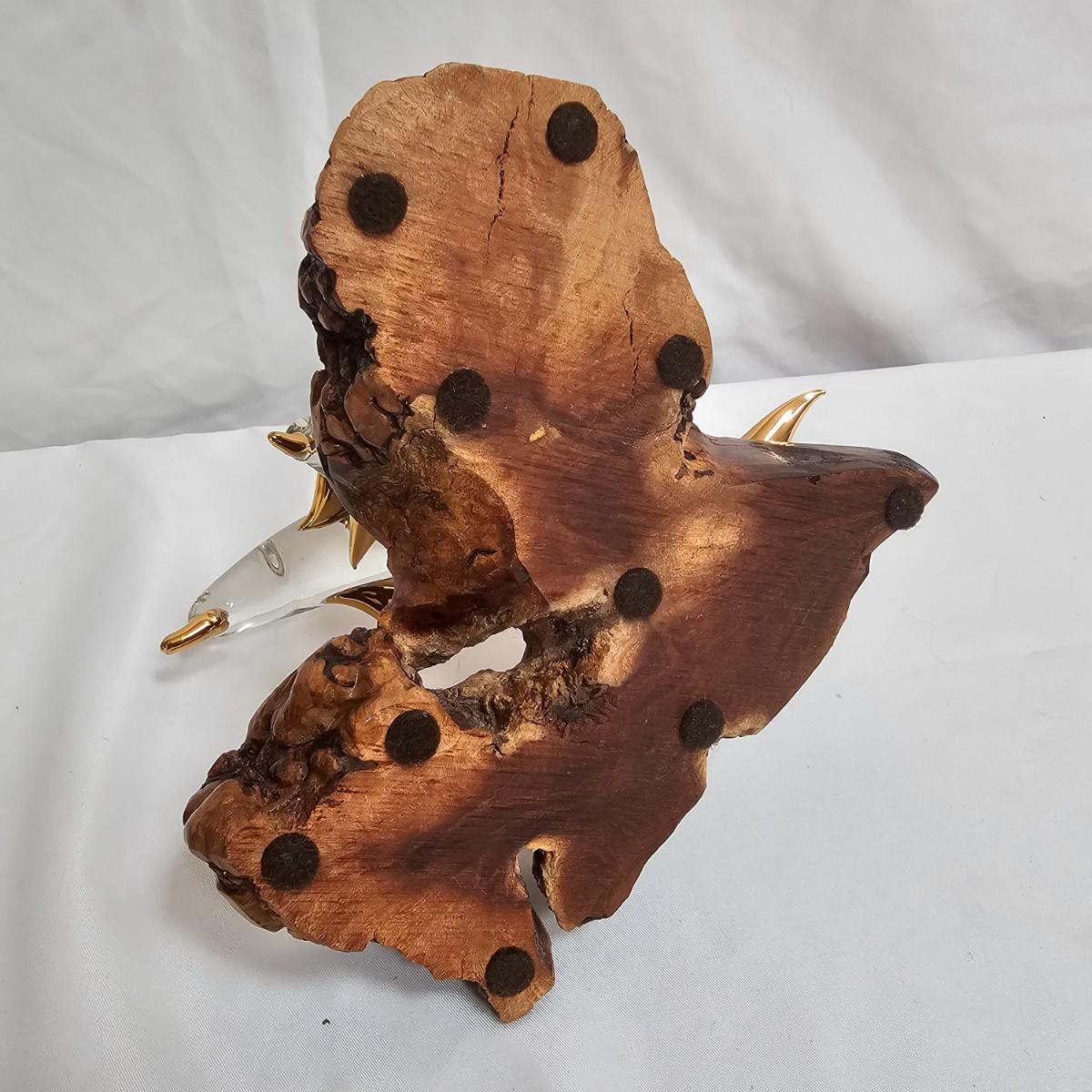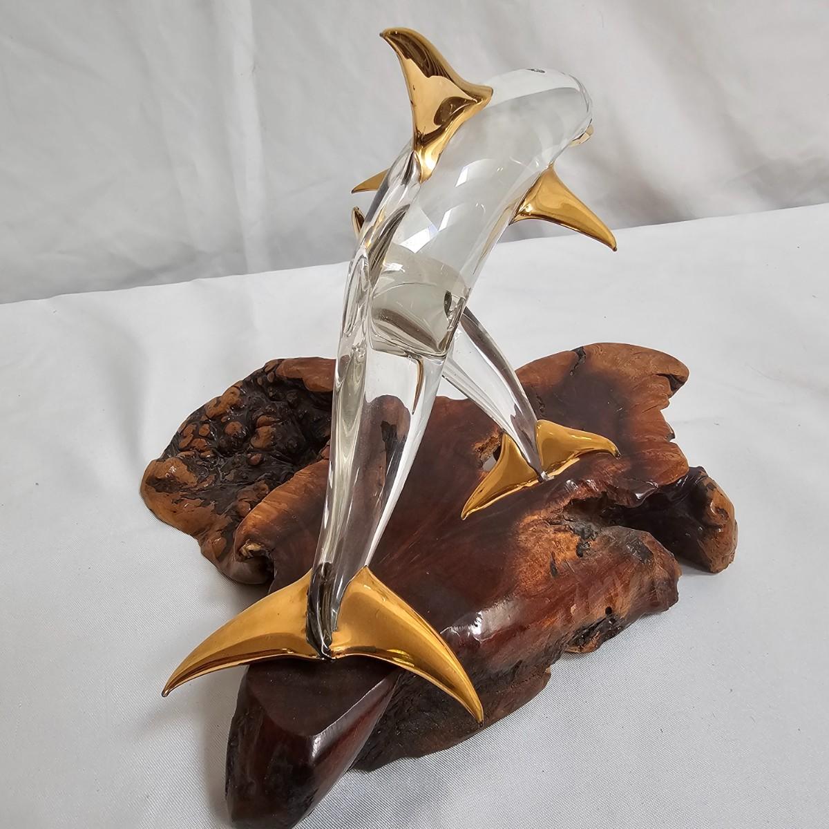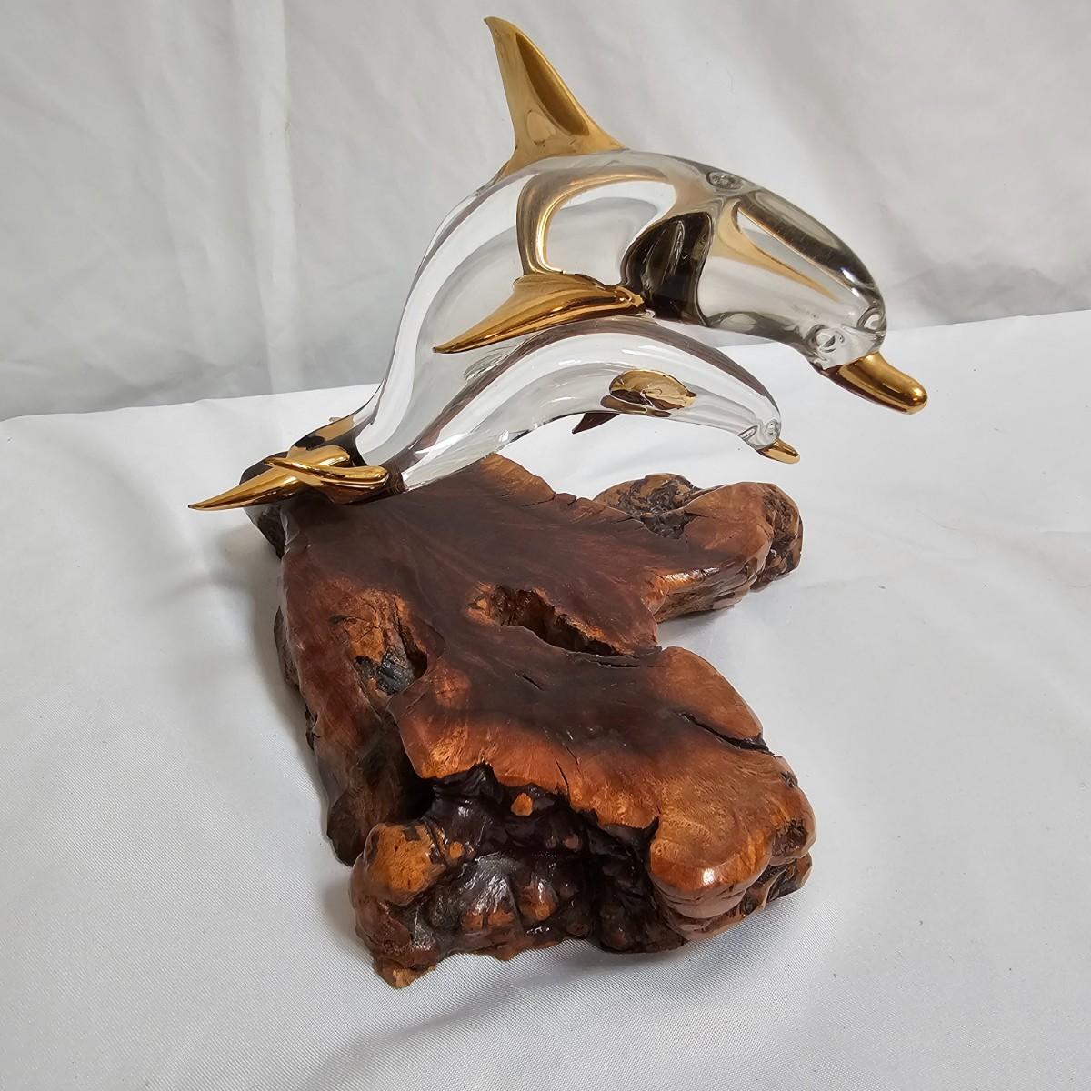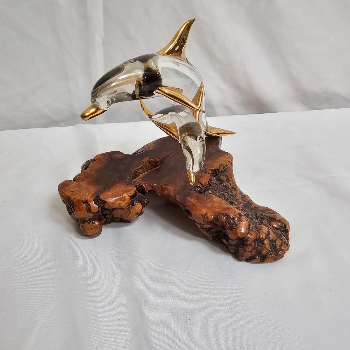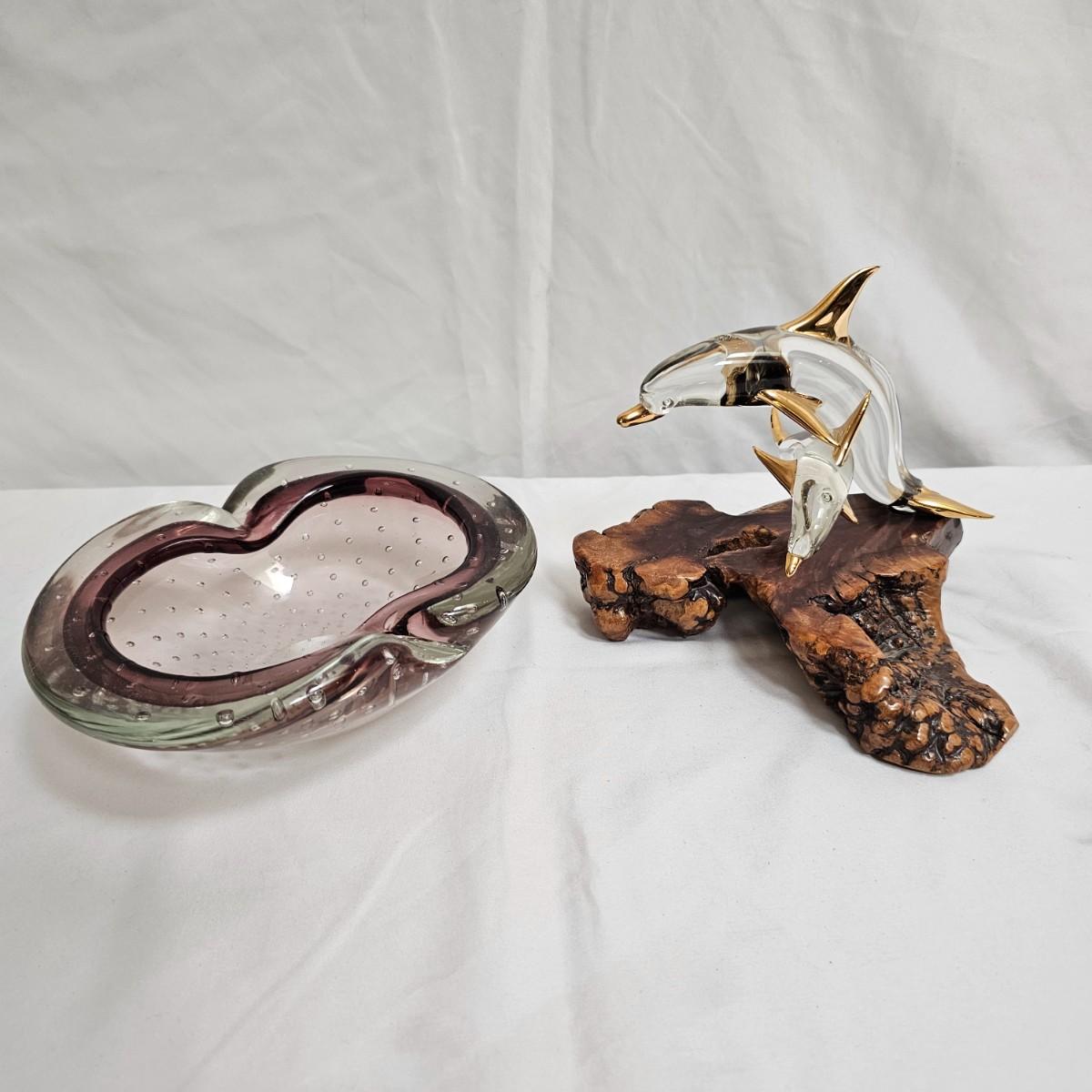 Two clear glass body dolphins with gold fins and noses arcing over a driftwood base. Piece measures 6.5" x 6.5" x 5.5H. Also included is an oval shaped glass bowl with inner rim of violet and bubbles throughout. 5" x 7" x 2"H. See photos for details. Shipping available.