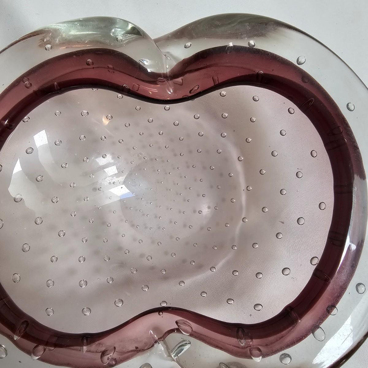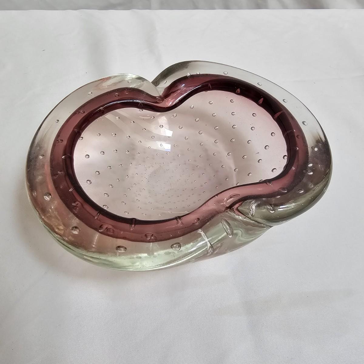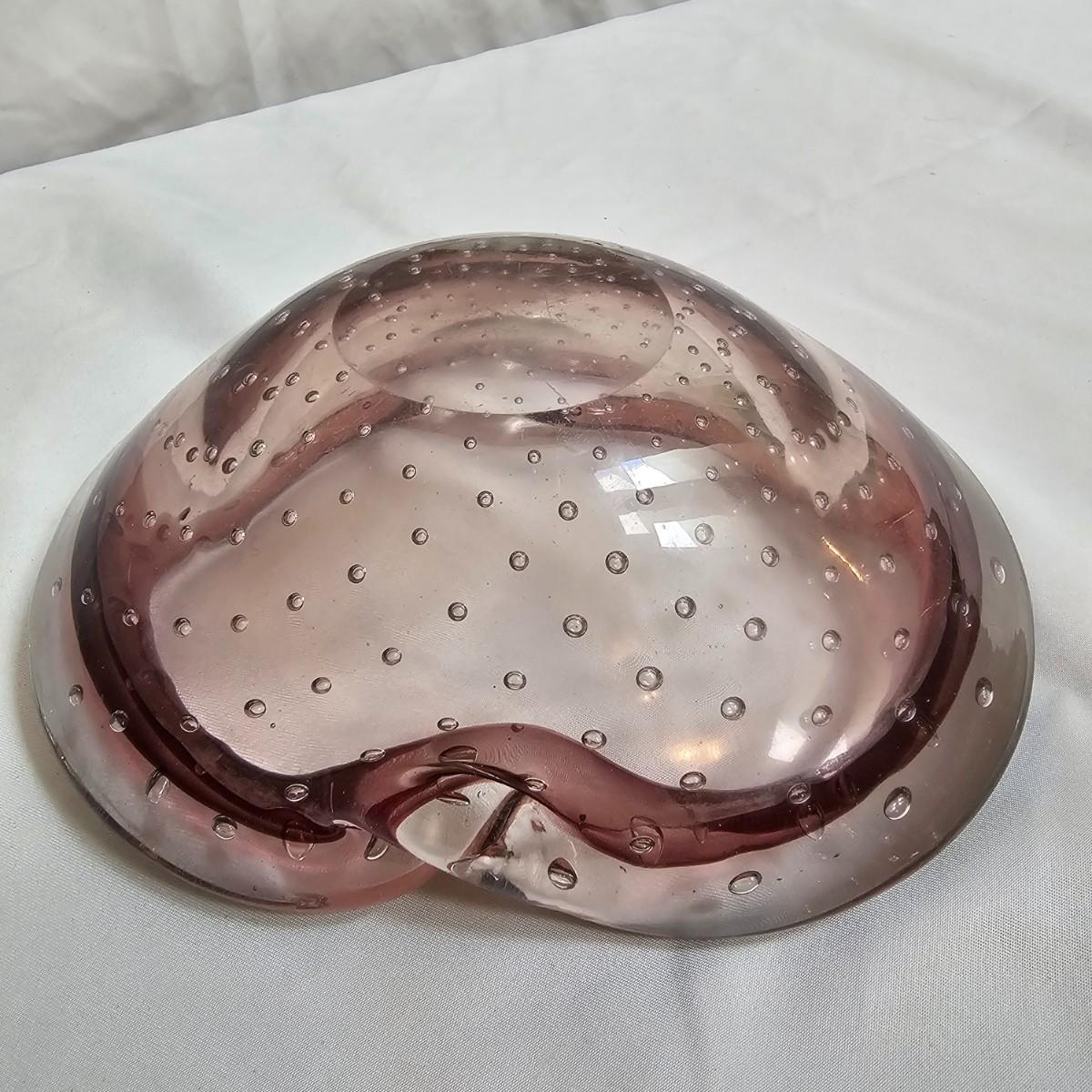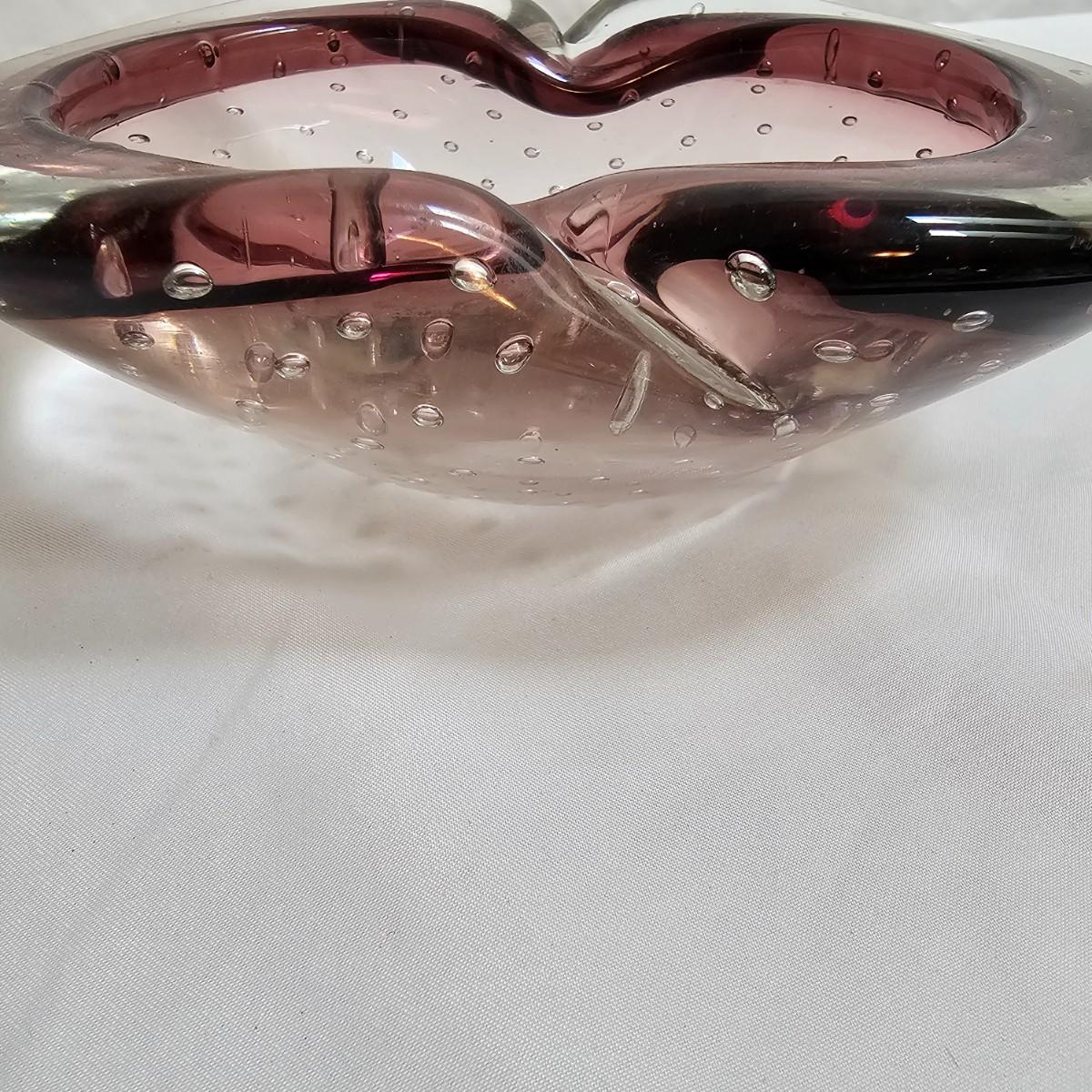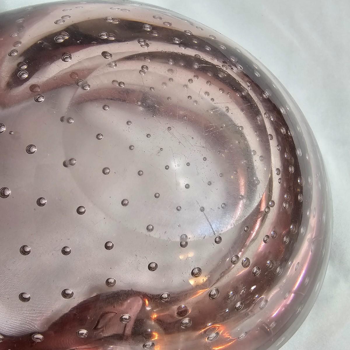 Two clear glass body dolphins with gold fins and noses arcing over a driftwood base. Piece measures 6.5" x 6.5" x 5.5H. Also included is an oval shaped glass bowl with inner rim of violet and bubbles throughout. 5" x 7" x 2"H. See photos for details. Shipping available.