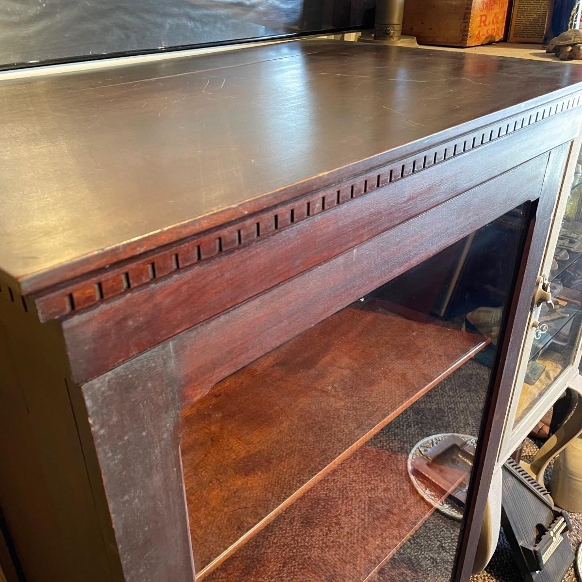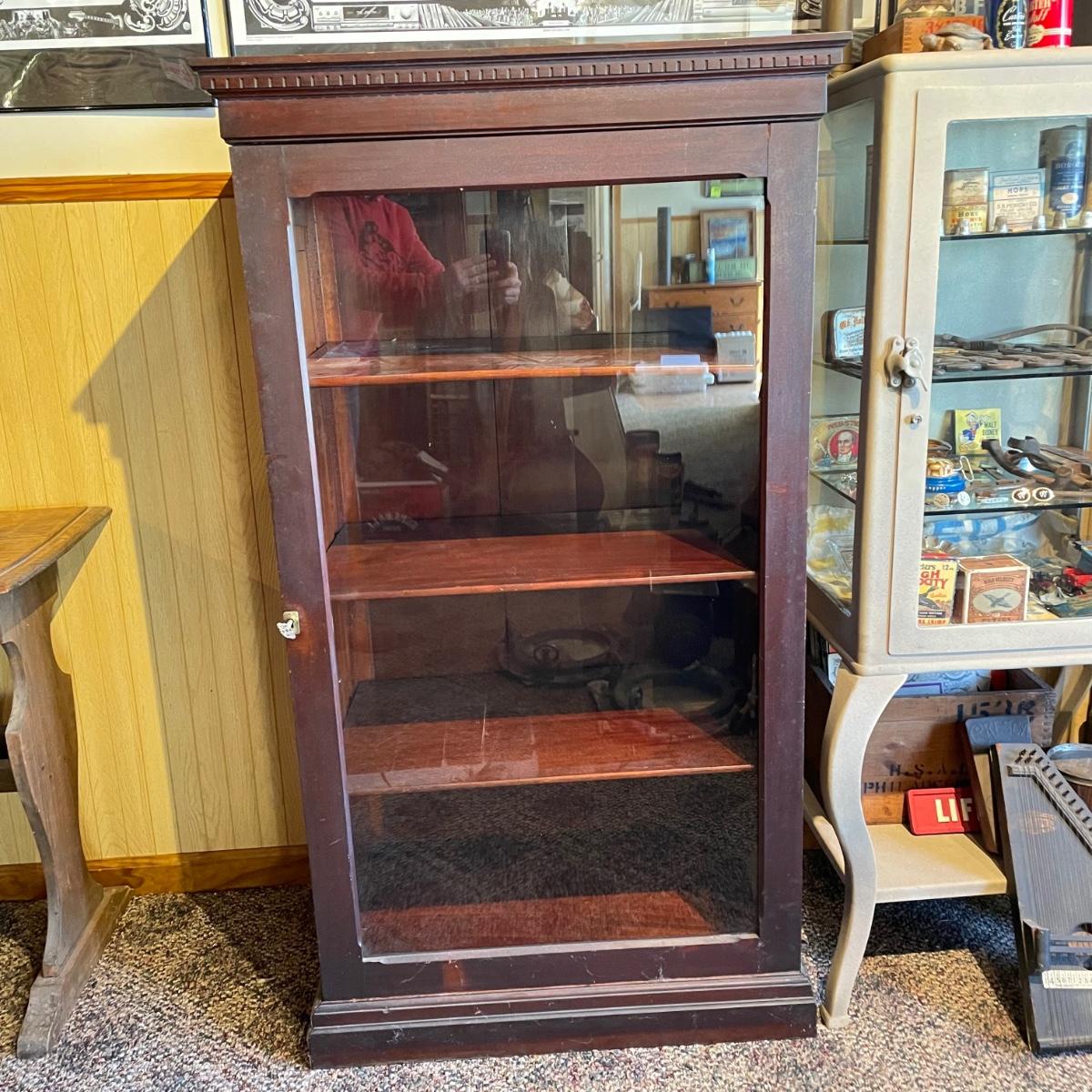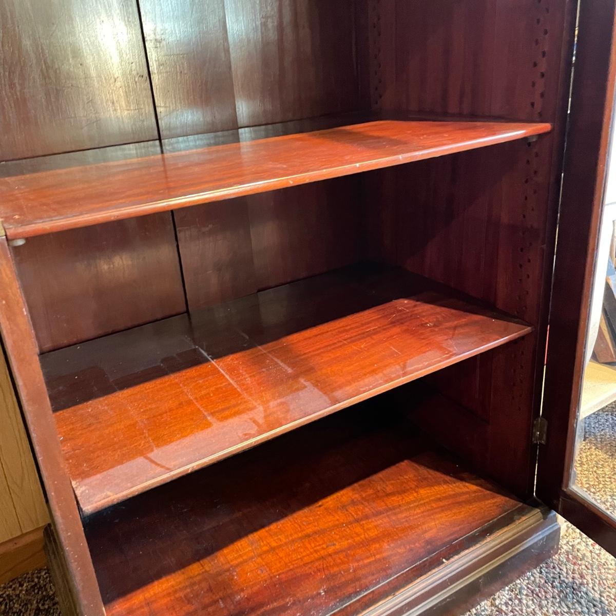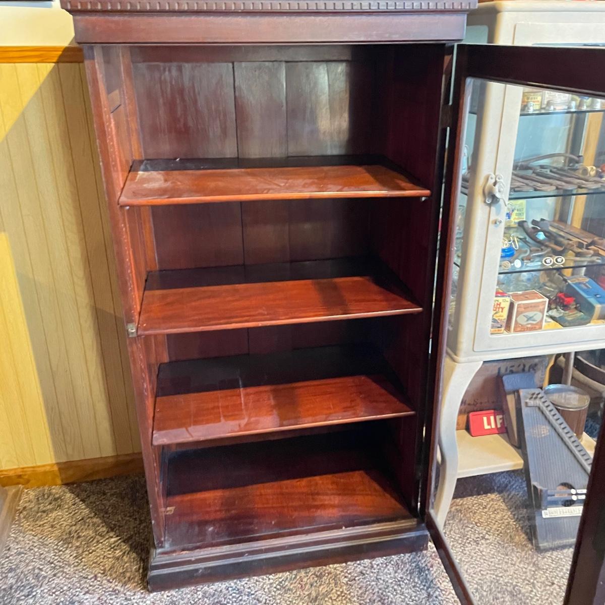VINTAGE MAHOGANY bookcase with single glass door and key. The key locks the case and appears to be nickel. Three shelves can be repositioned. Bookcase measures approximately 30” x 20” x 54”. Superficial scratches and nicks are found, but piece is in great shape overall. See images. Local pick up only.
