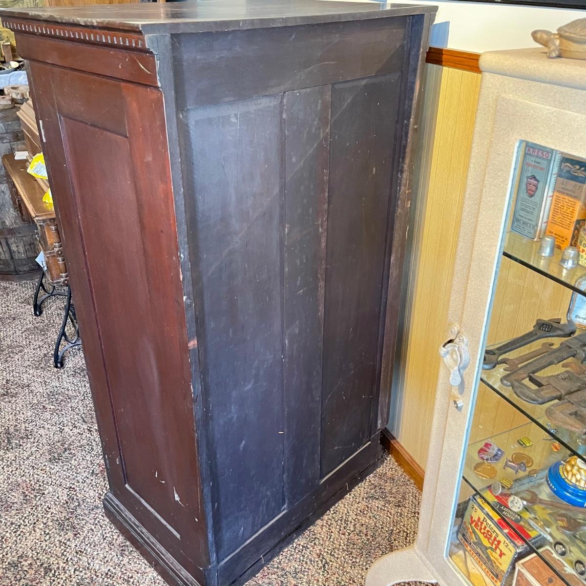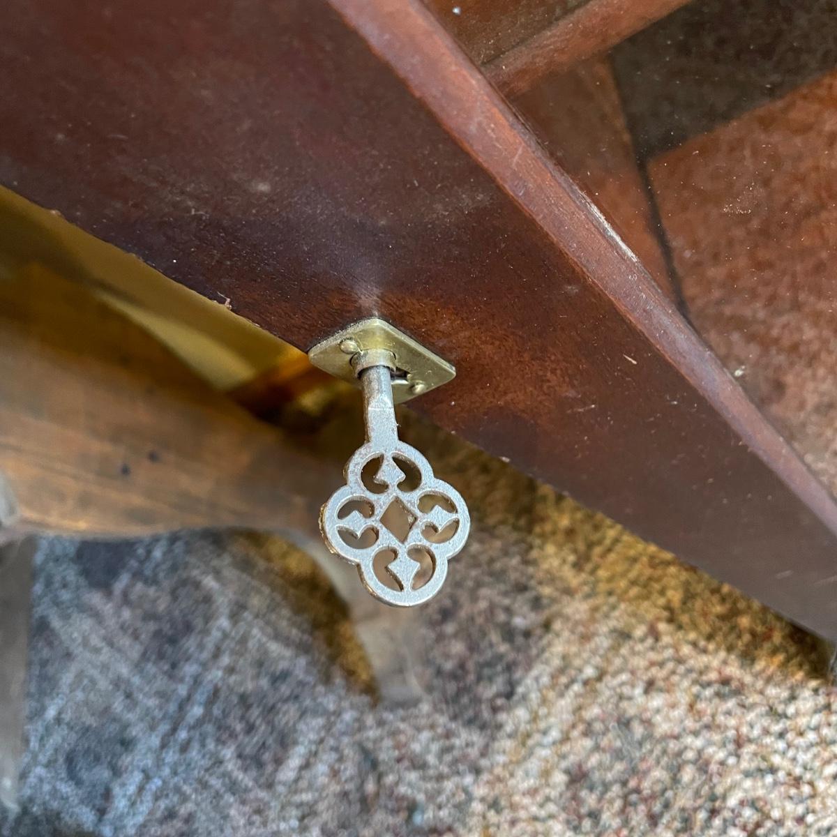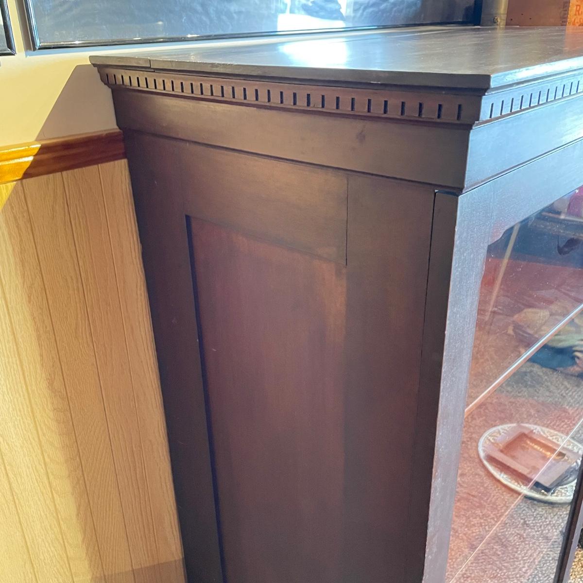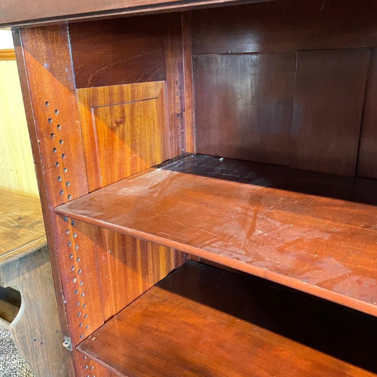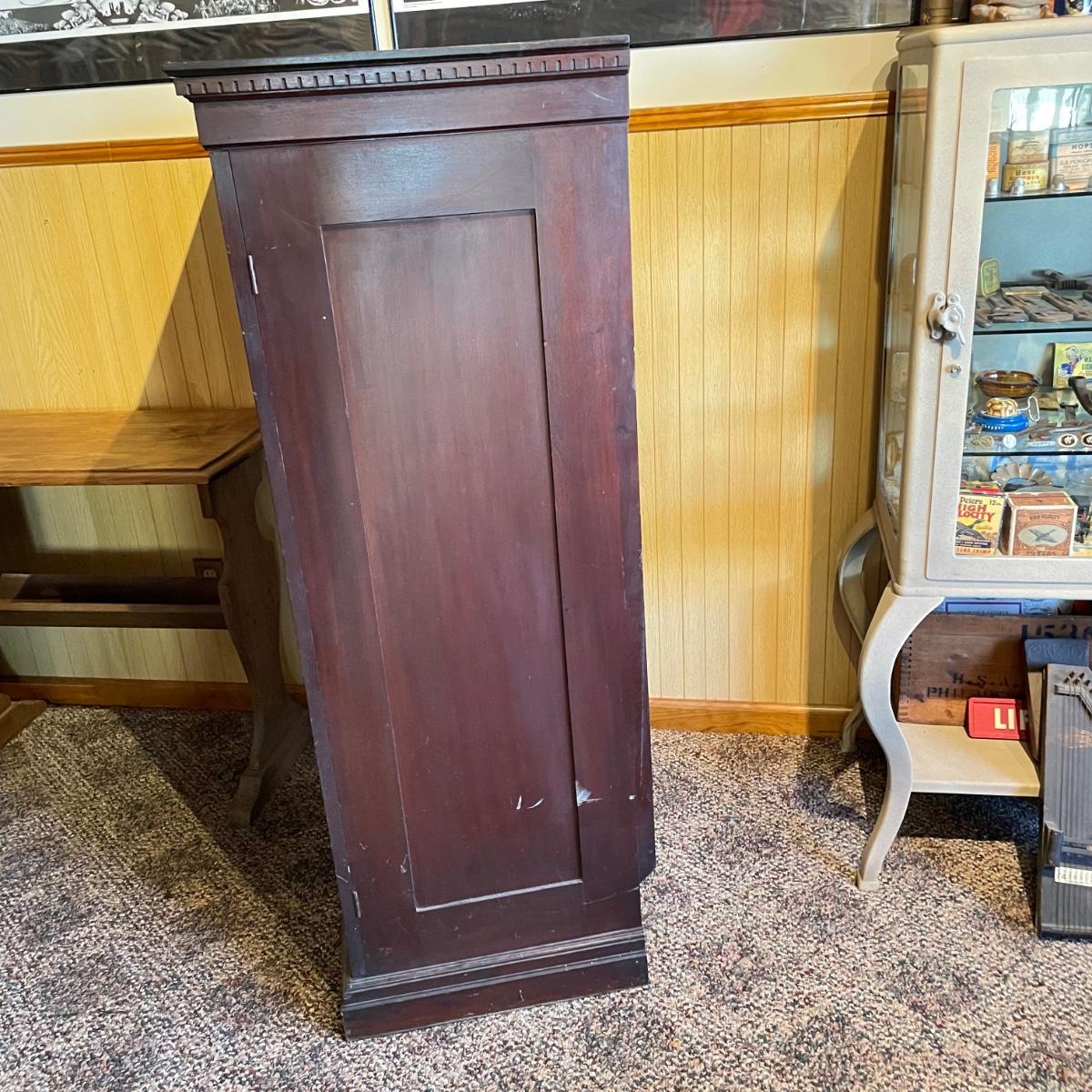 VINTAGE MAHOGANY bookcase with single glass door and key. The key locks the case and appears to be nickel. Three shelves can be repositioned. Bookcase measures approximately 30” x 20” x 54”. Superficial scratches and nicks are found, but piece is in great shape overall. See images. Local pick up only.