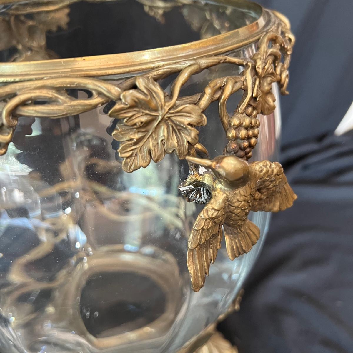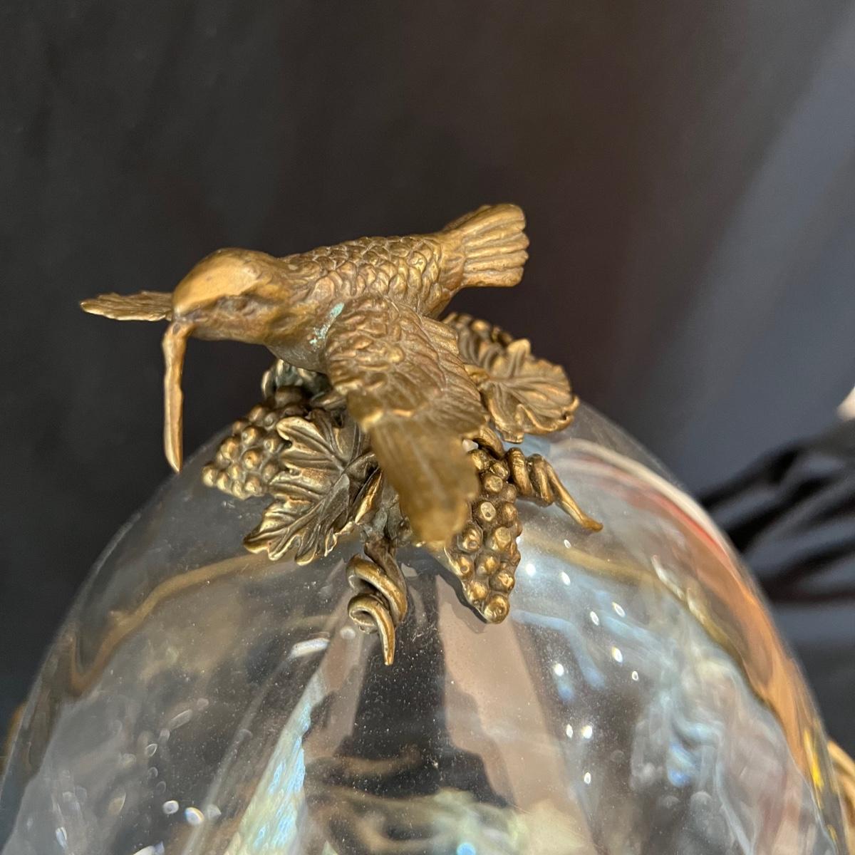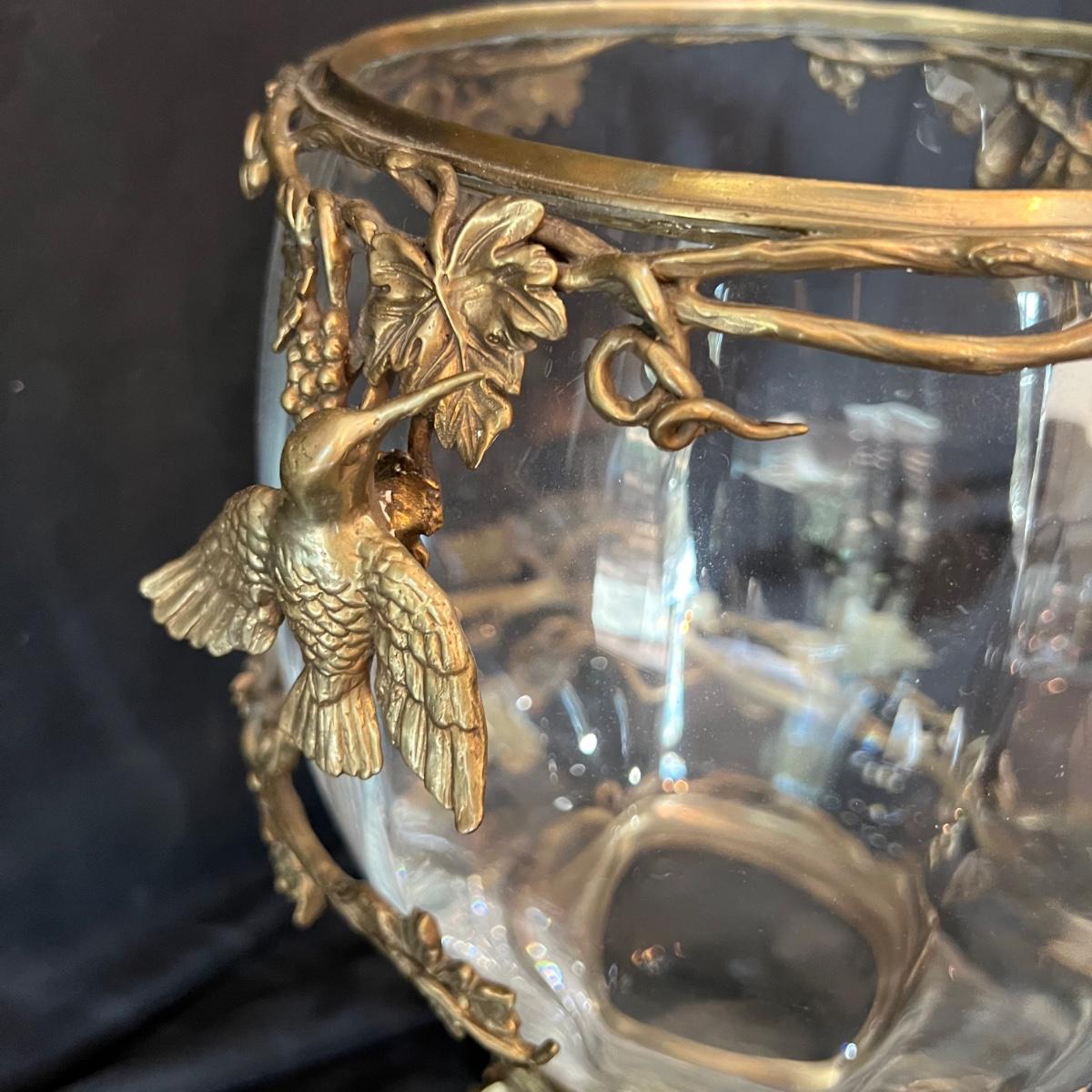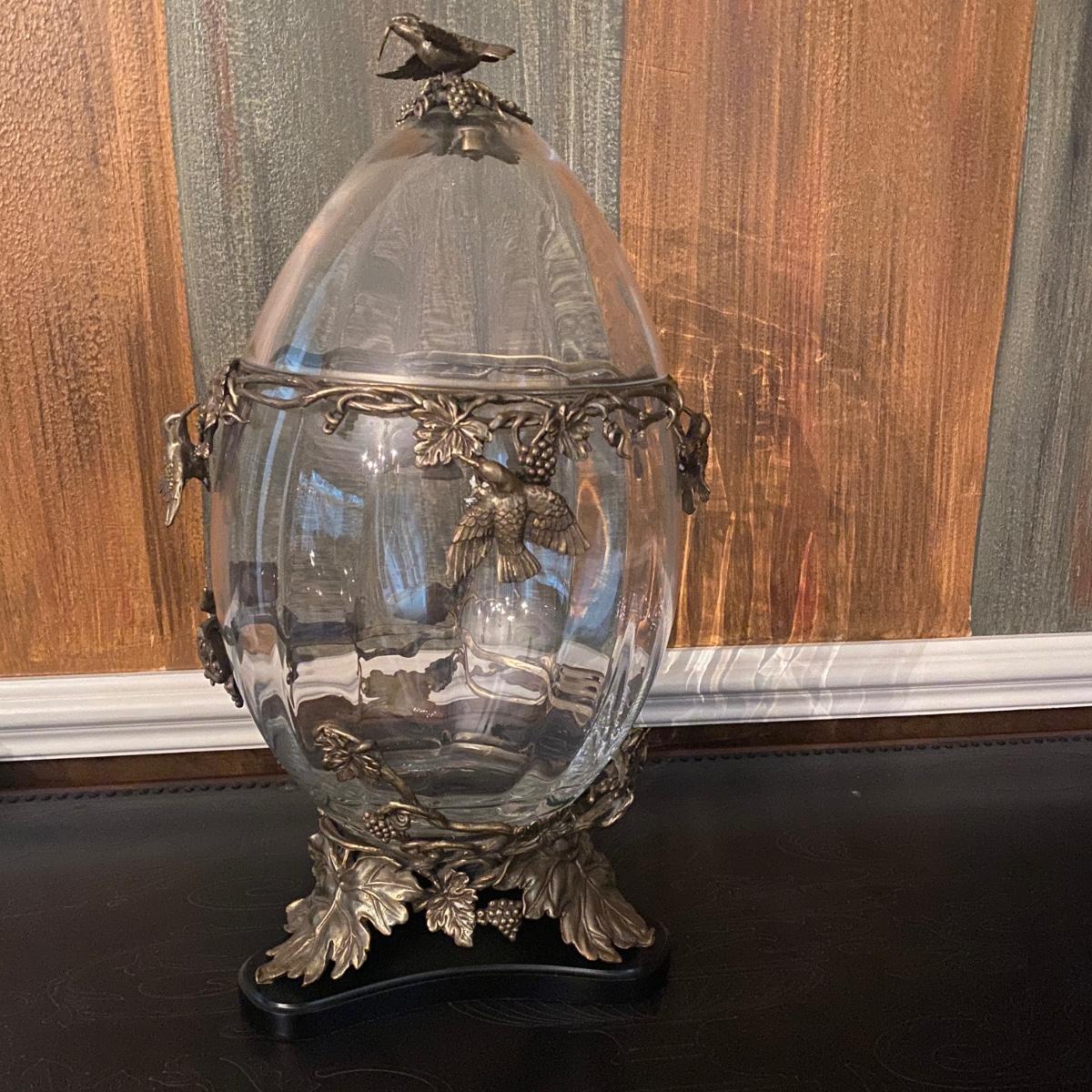 Hollow covered glass egg container accented with vines and hummingbirds. The item is 9”D x 20”H. The base and bird sculptures appear to be a brass-like cast metal.