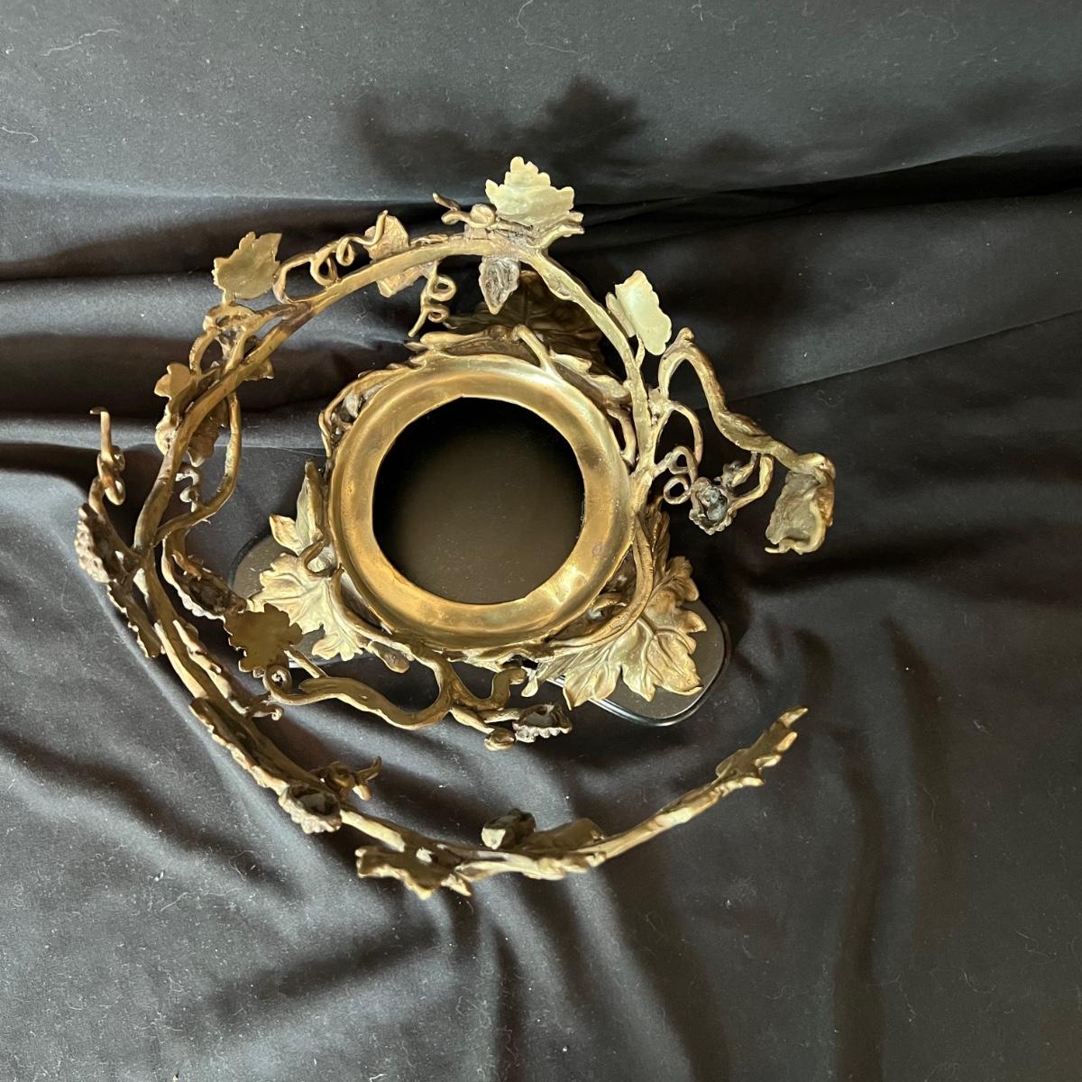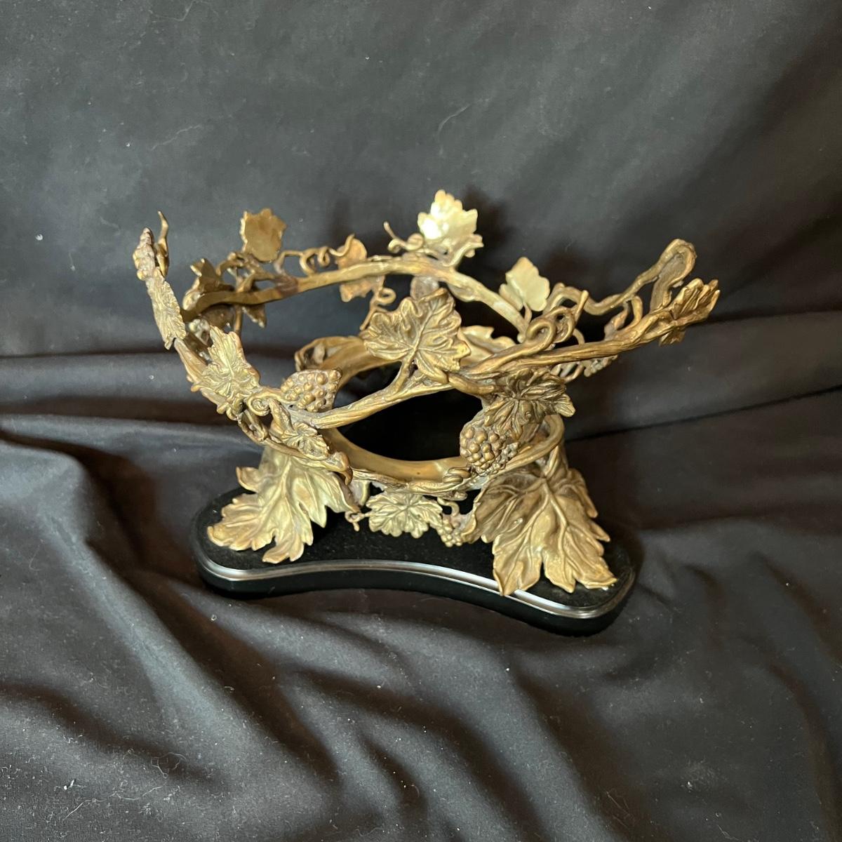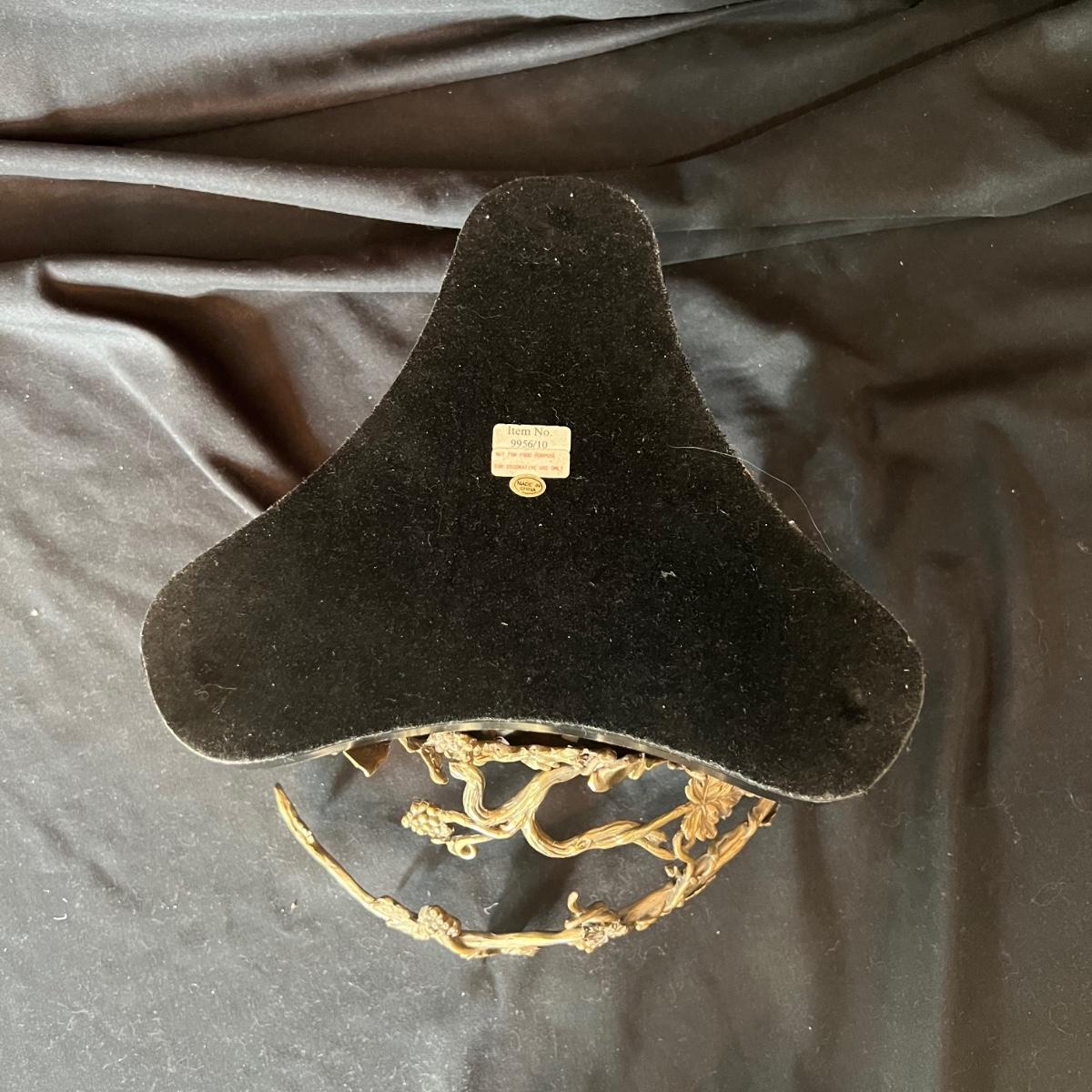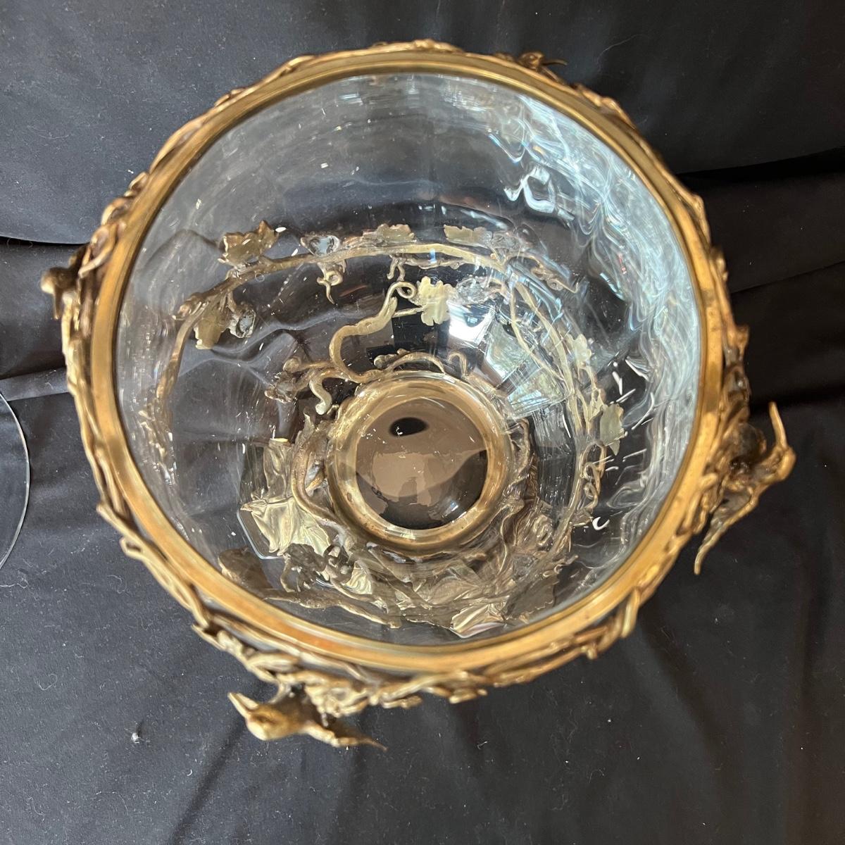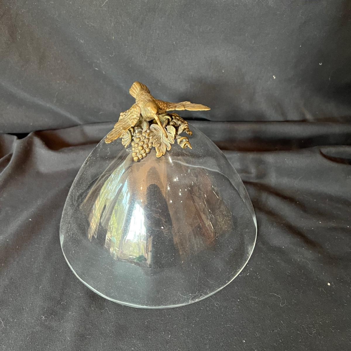 Hollow covered glass egg container accented with vines and hummingbirds. The item is 9”D x 20”H. The base and bird sculptures appear to be a brass-like cast metal.