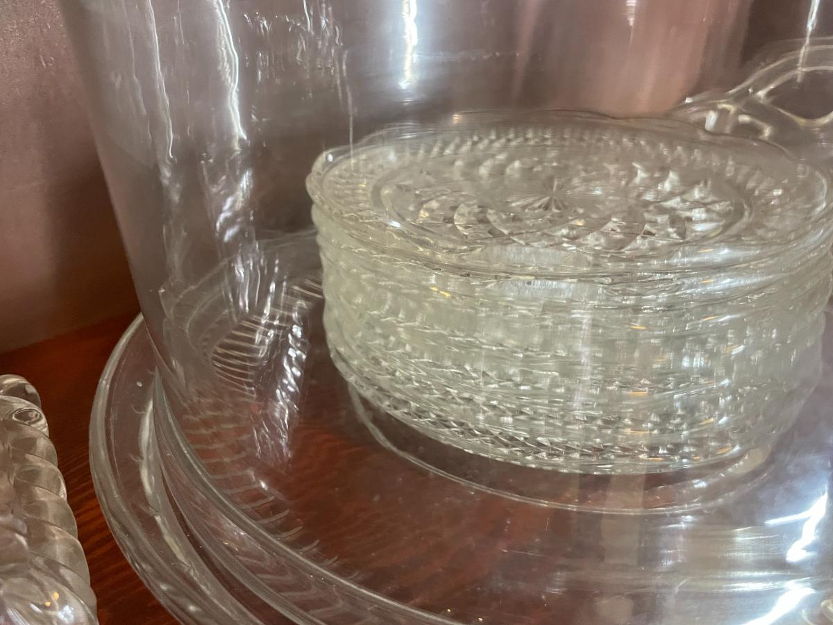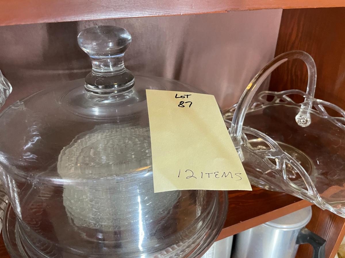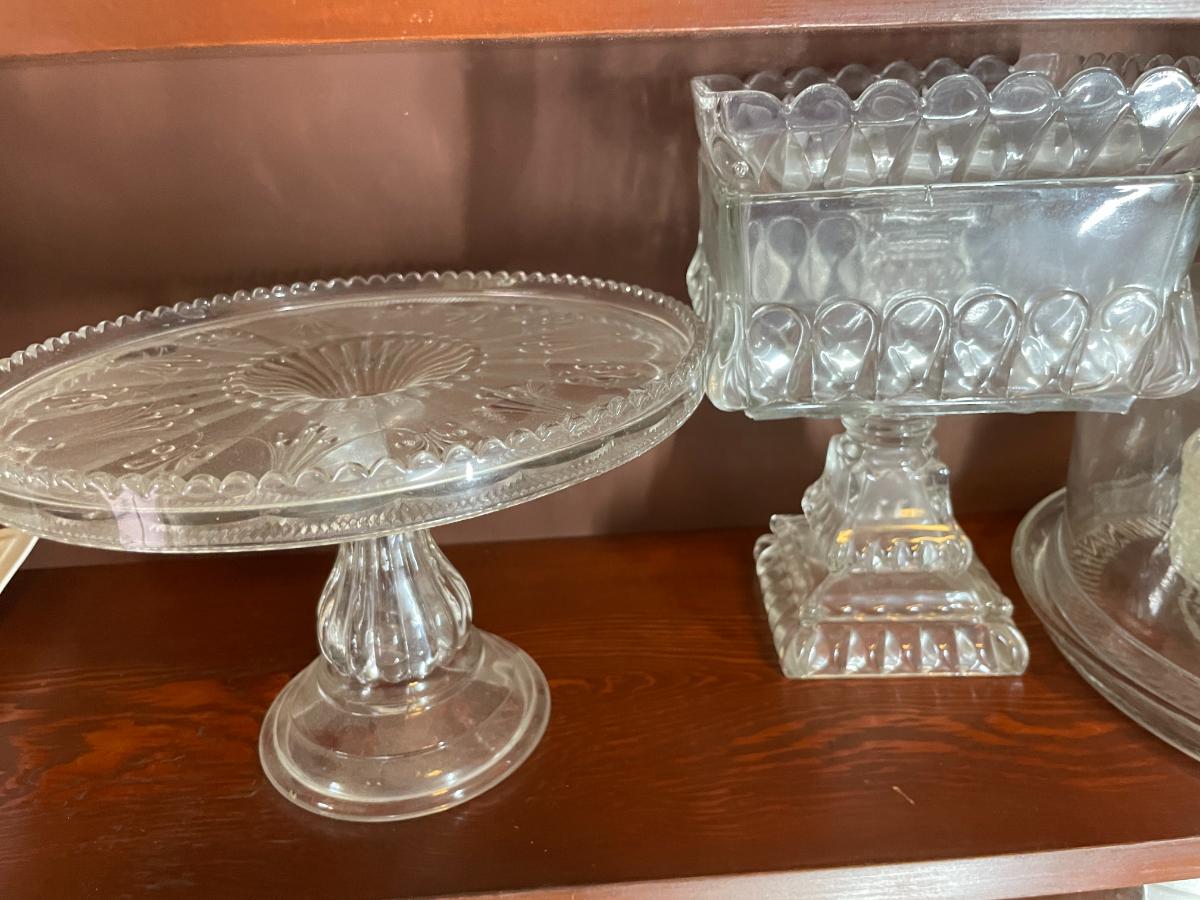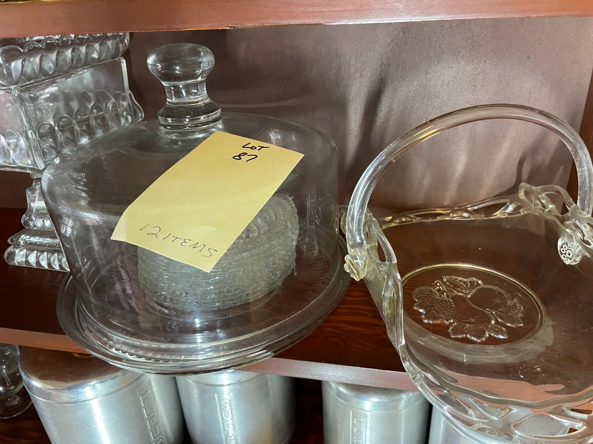 2 Cake plates, glass fruit basket and fostoria candy dish and serving dishes - 12 items